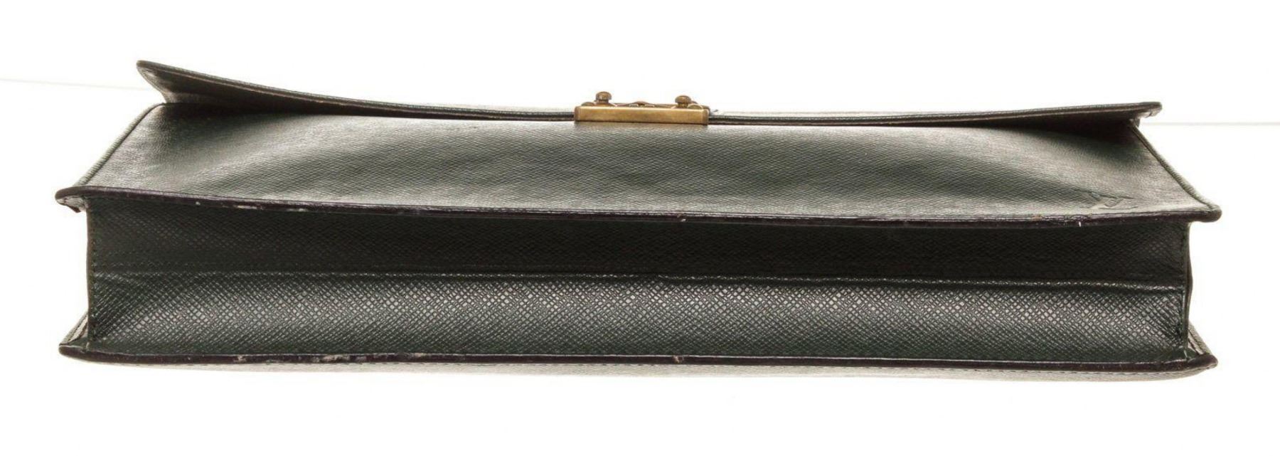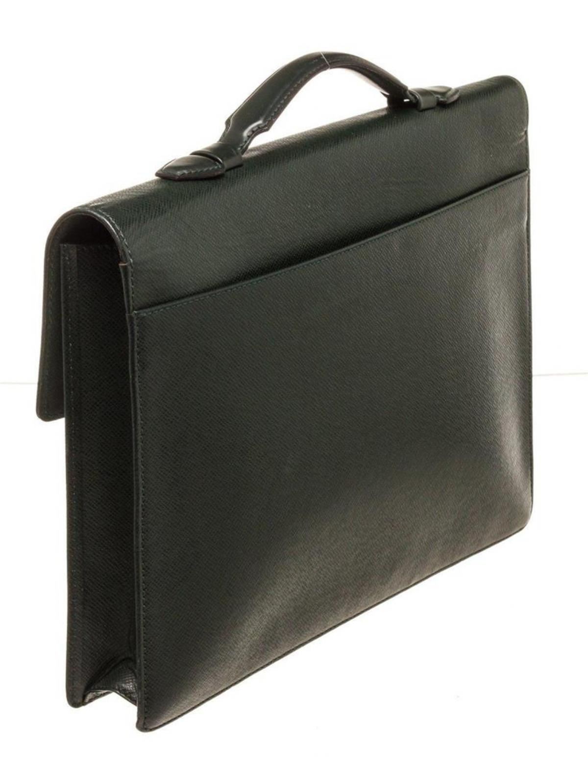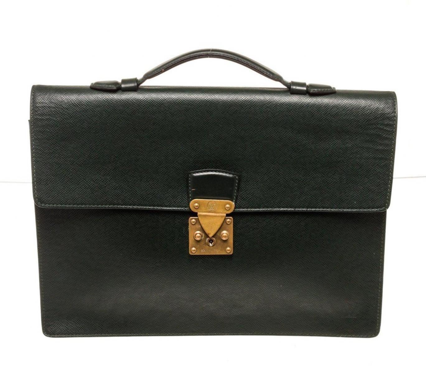 Louis Vuitton Black Epi Leather Briefcase with material epi leather, gold-tone hardware, tan vachetta leather trim, interior slip pocket, top handle, and push lock closure.