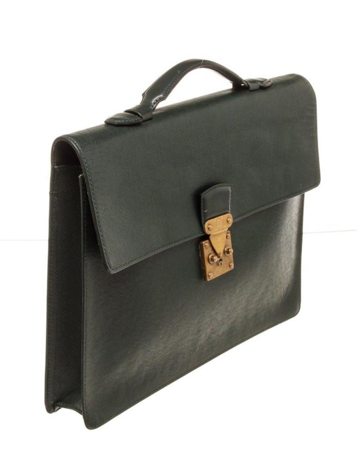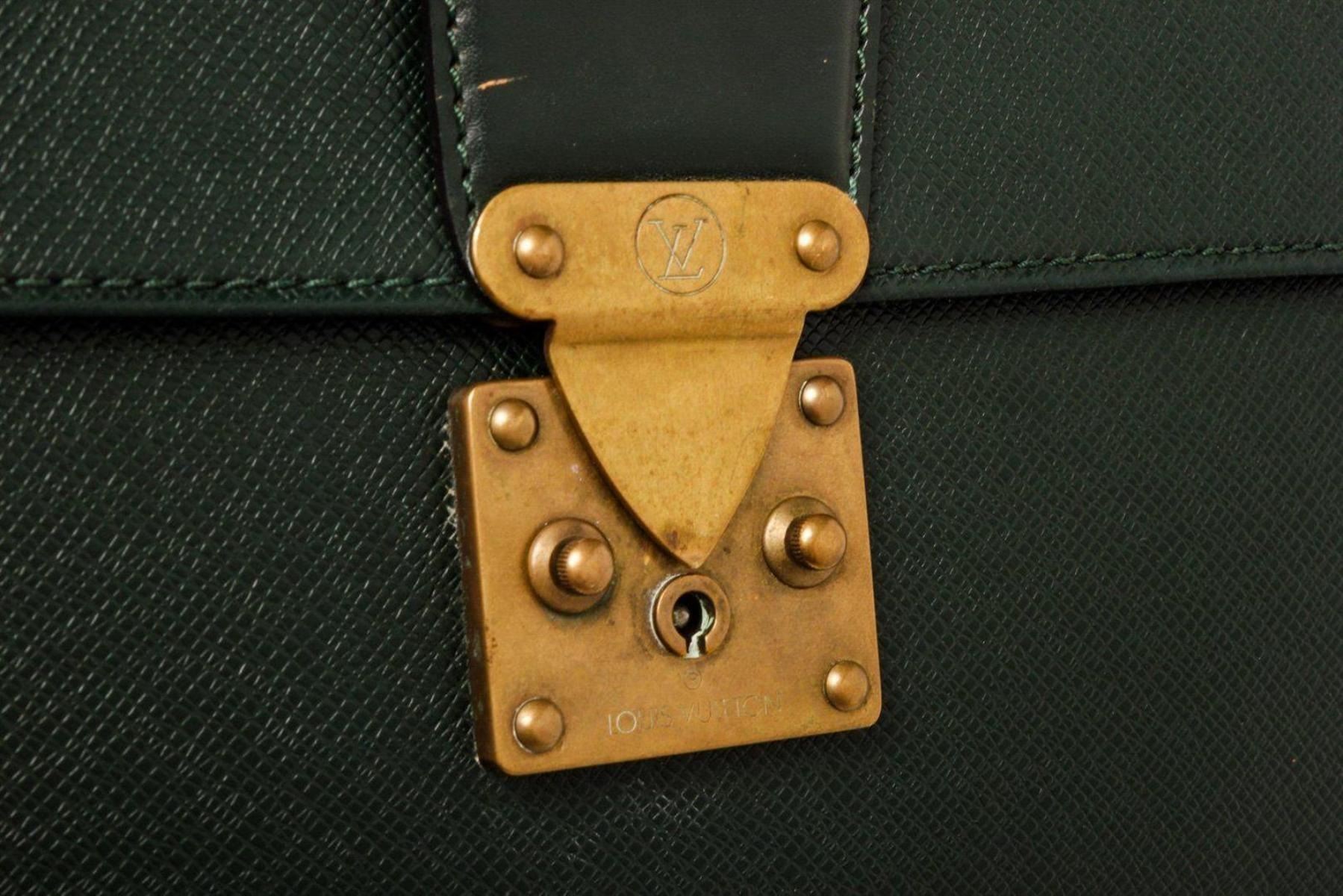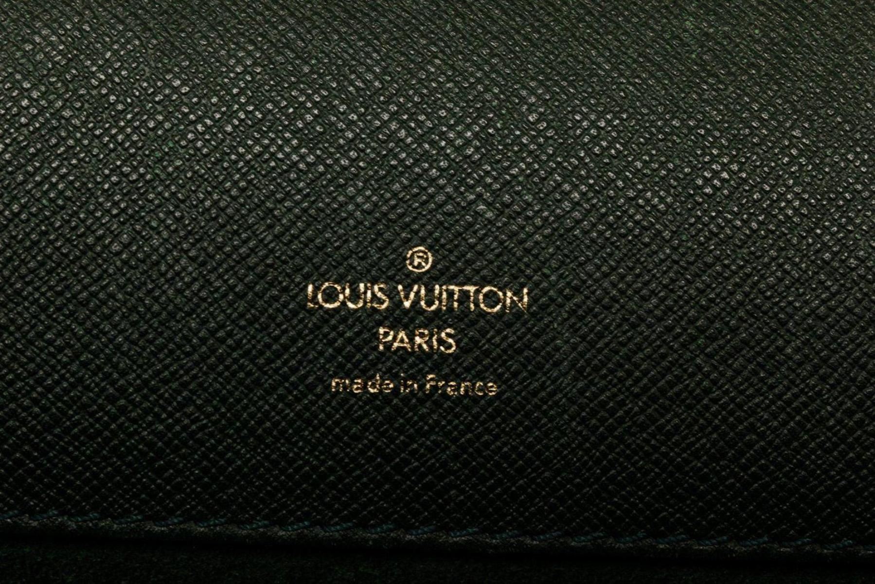 Louis Vuitton Black Epi Leather Briefcase with material epi leather, gold-tone hardware, tan vachetta leather trim, interior slip pocket, top handle, and push lock closure.