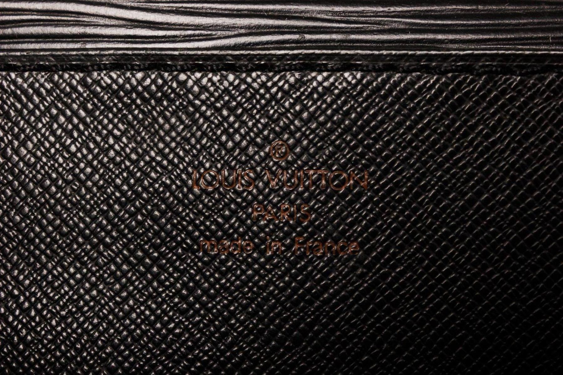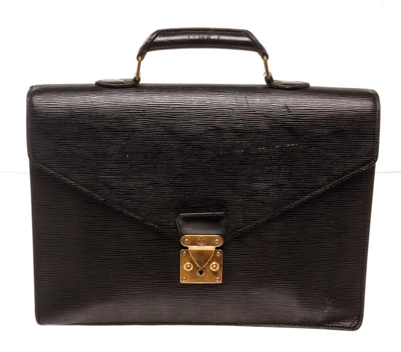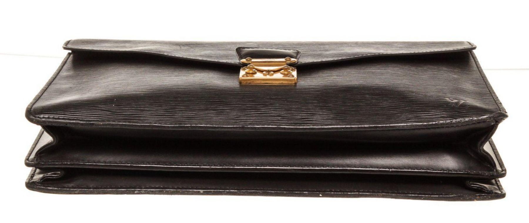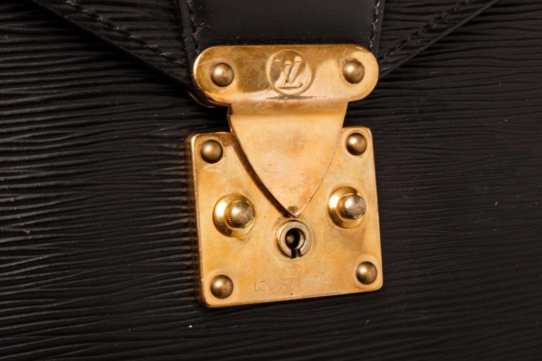 Louis Vuitton Black Epi Leather Briefcase with material epi leather, gold-tone hardware, tan vachetta leather trim, interior slip pocket, top handle, and push lock closure.
