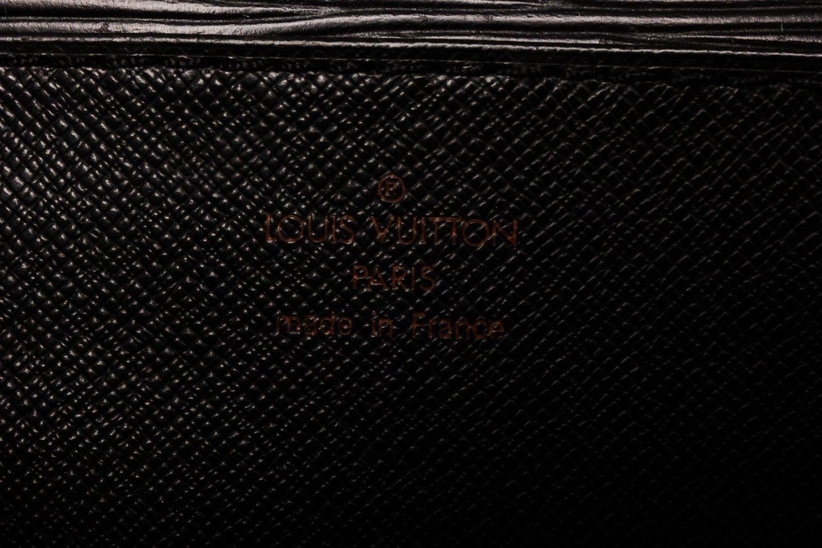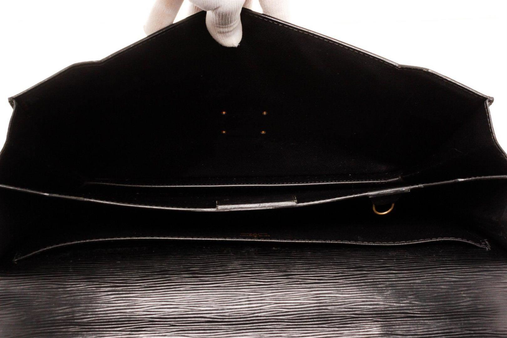 Louis Vuitton Black Epi Leather Briefcase with material epi leather, gold-tone hardware, tan vachetta leather trim, interior slip pocket, top handle, and push lock closure.
