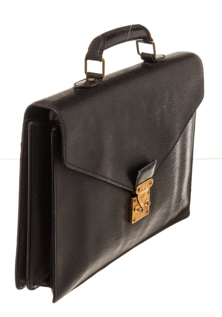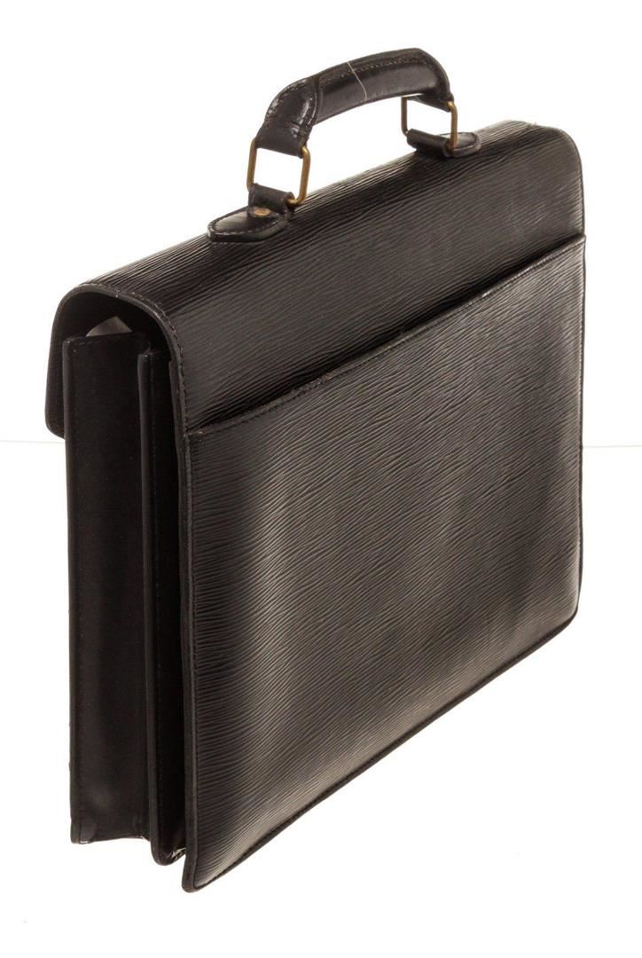 Louis Vuitton Black Epi Leather Briefcase with material epi leather, gold-tone hardware, tan vachetta leather trim, interior slip pocket, top handle, and push lock closure.