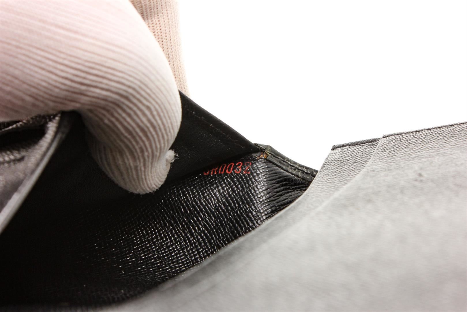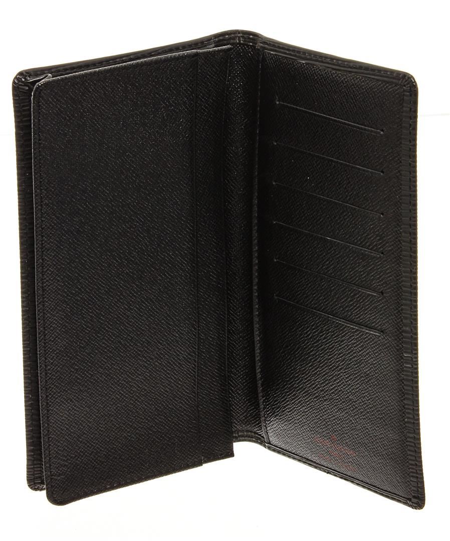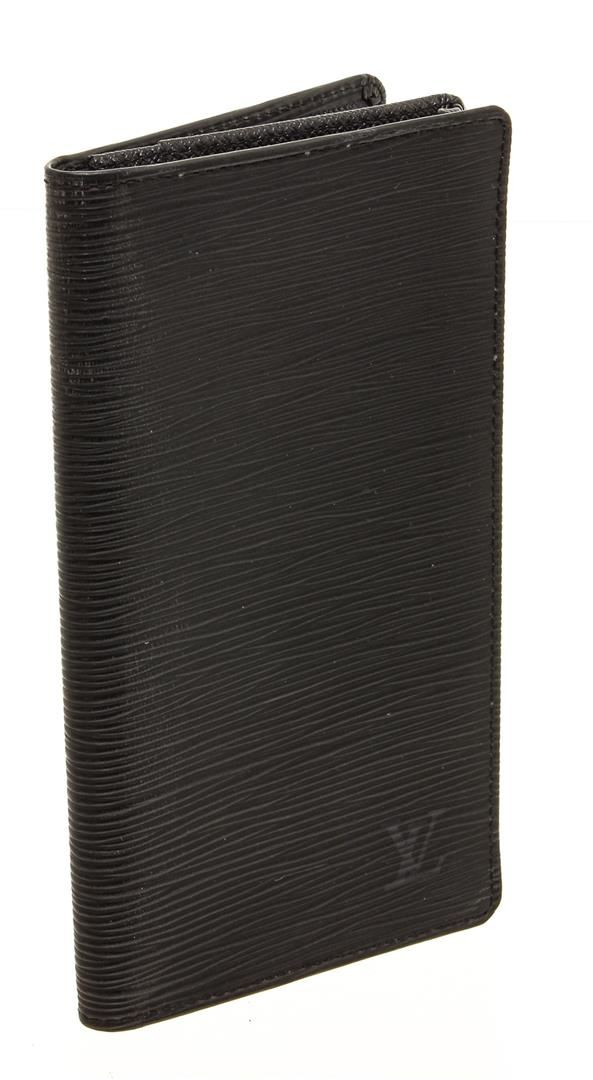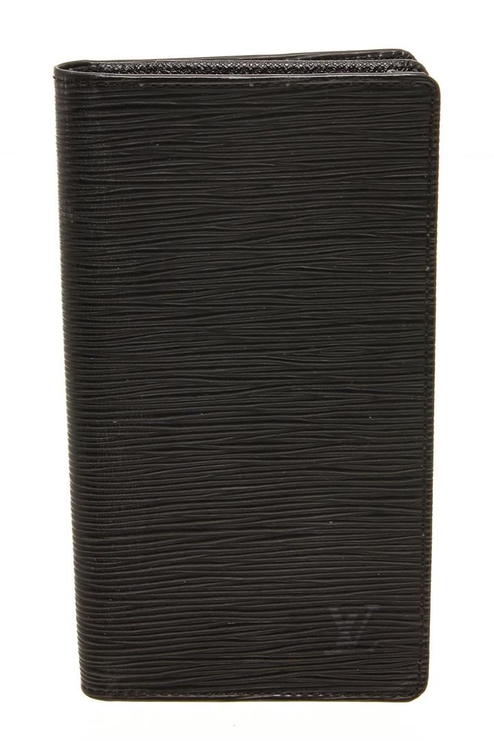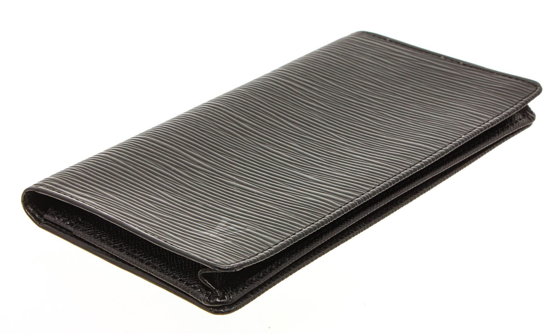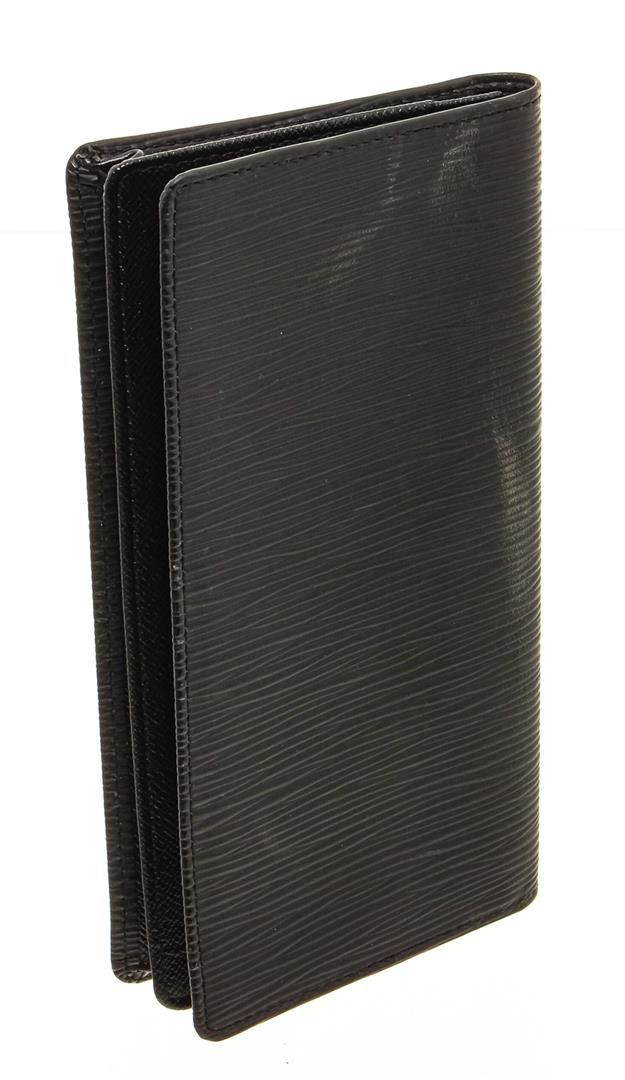 Black epi leather Louis Vuitton checkbook cover with black taiga leather interior lining, six card slots and three side slip pockets. Overall bifold closure.