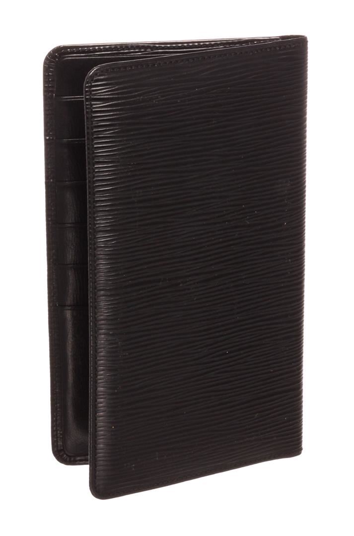 Black Epi leather Louis Vuitton checkbook holder with embossed logo accent at front corner, tonal textured leather interior, dual interior sleeves, six card slots and fold closure at front.