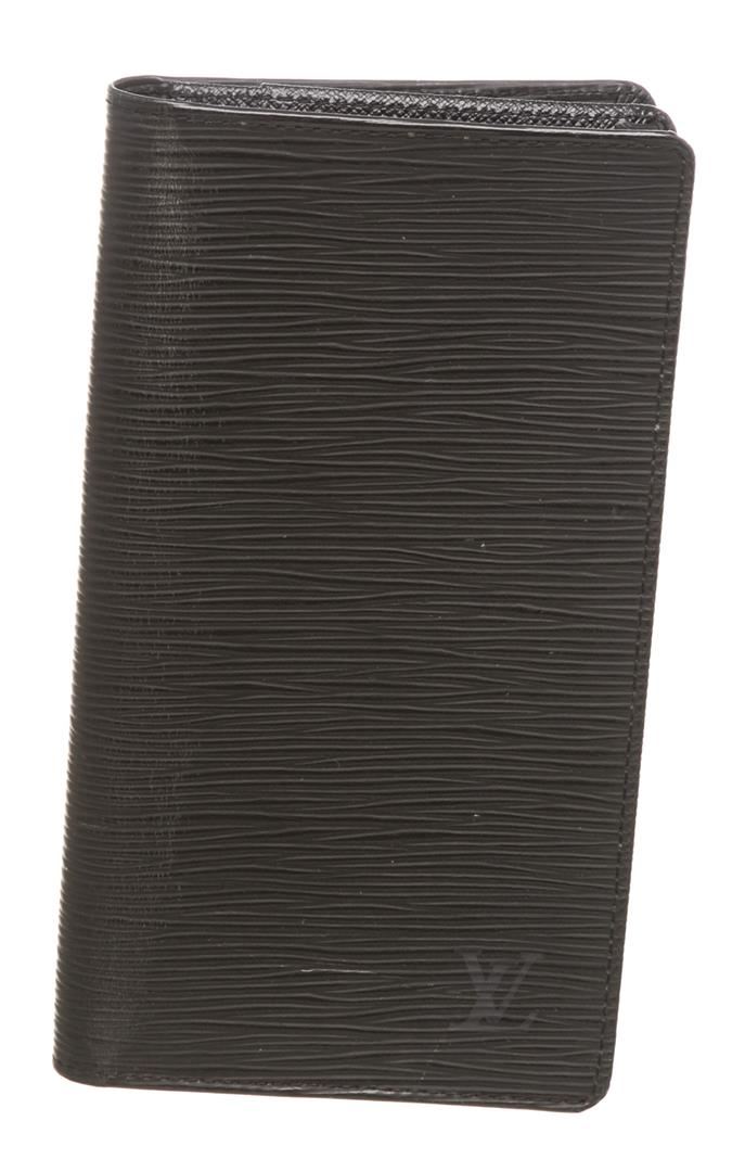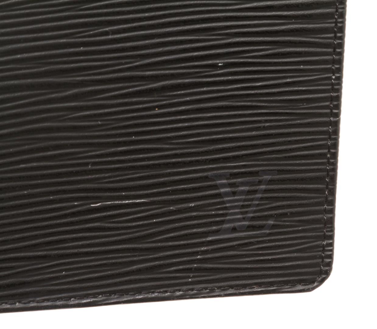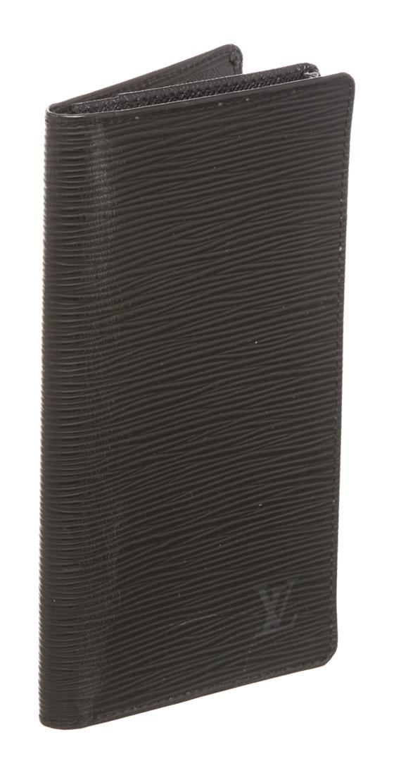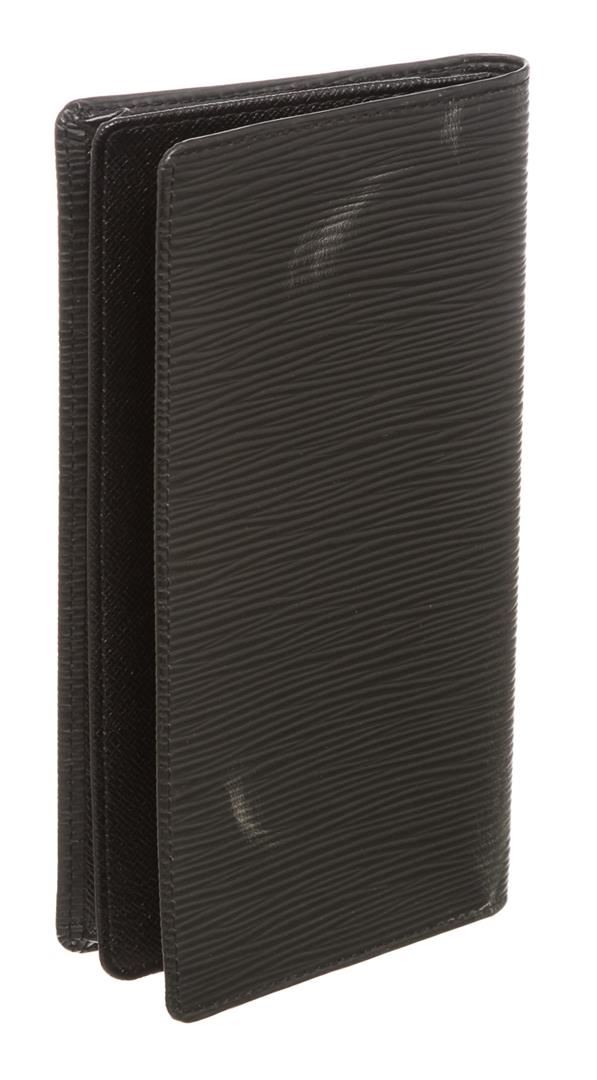 Louis Vuitton black Epi leather Checkbook Wallet with three side pockets and six card slots. Authentic.