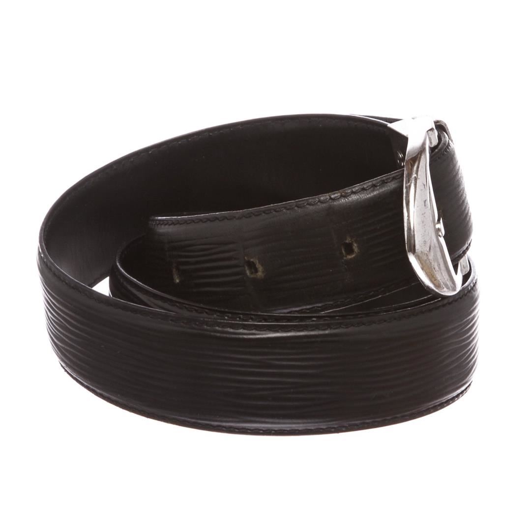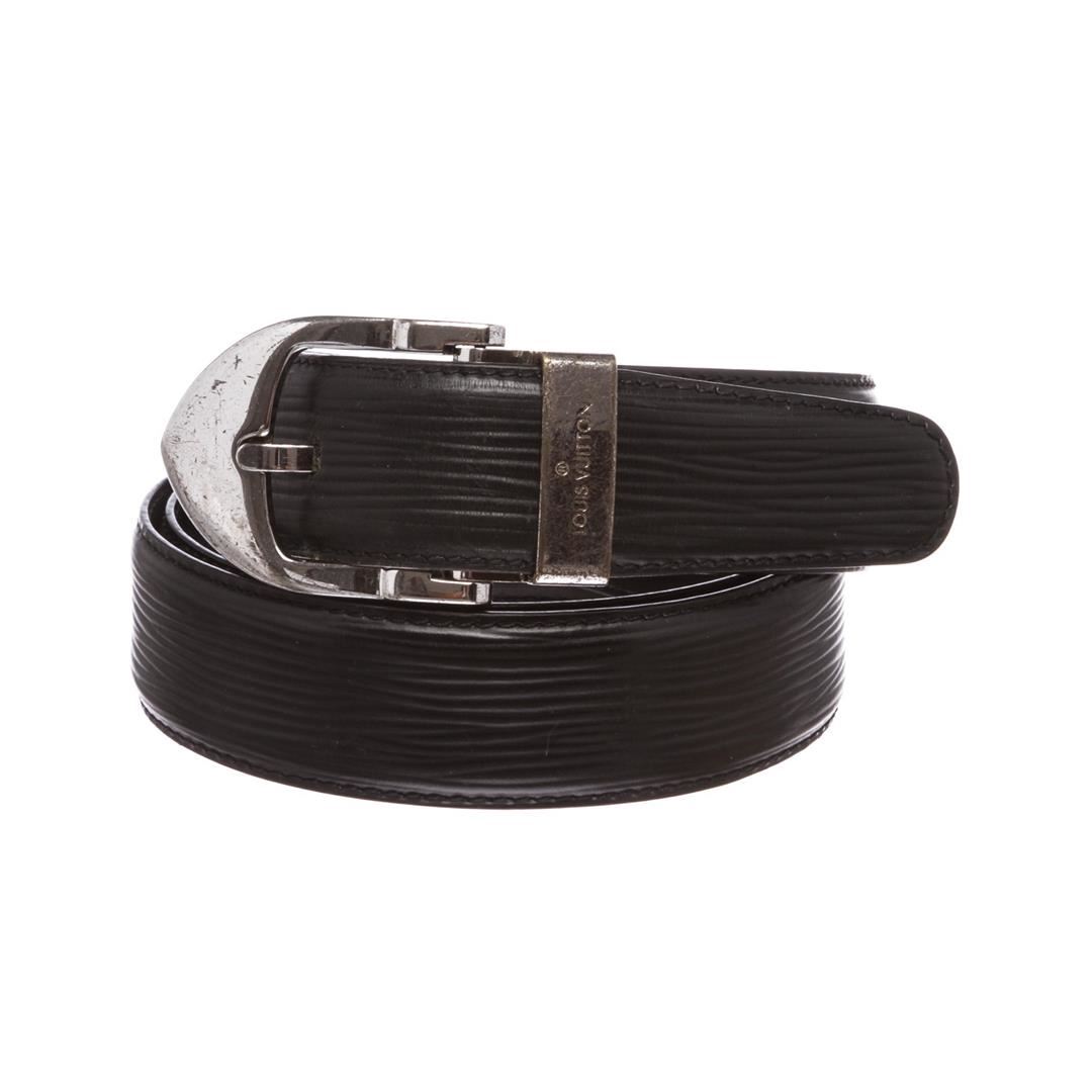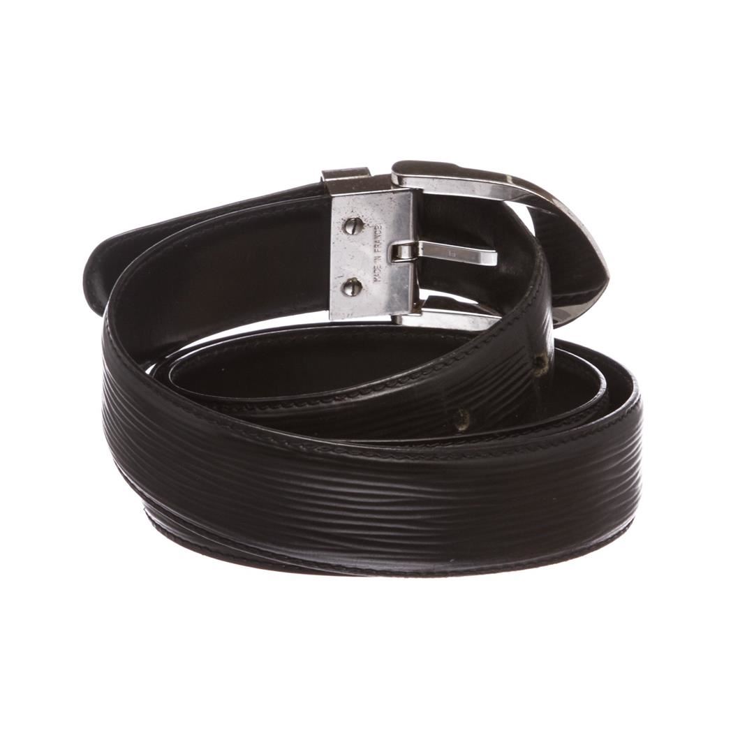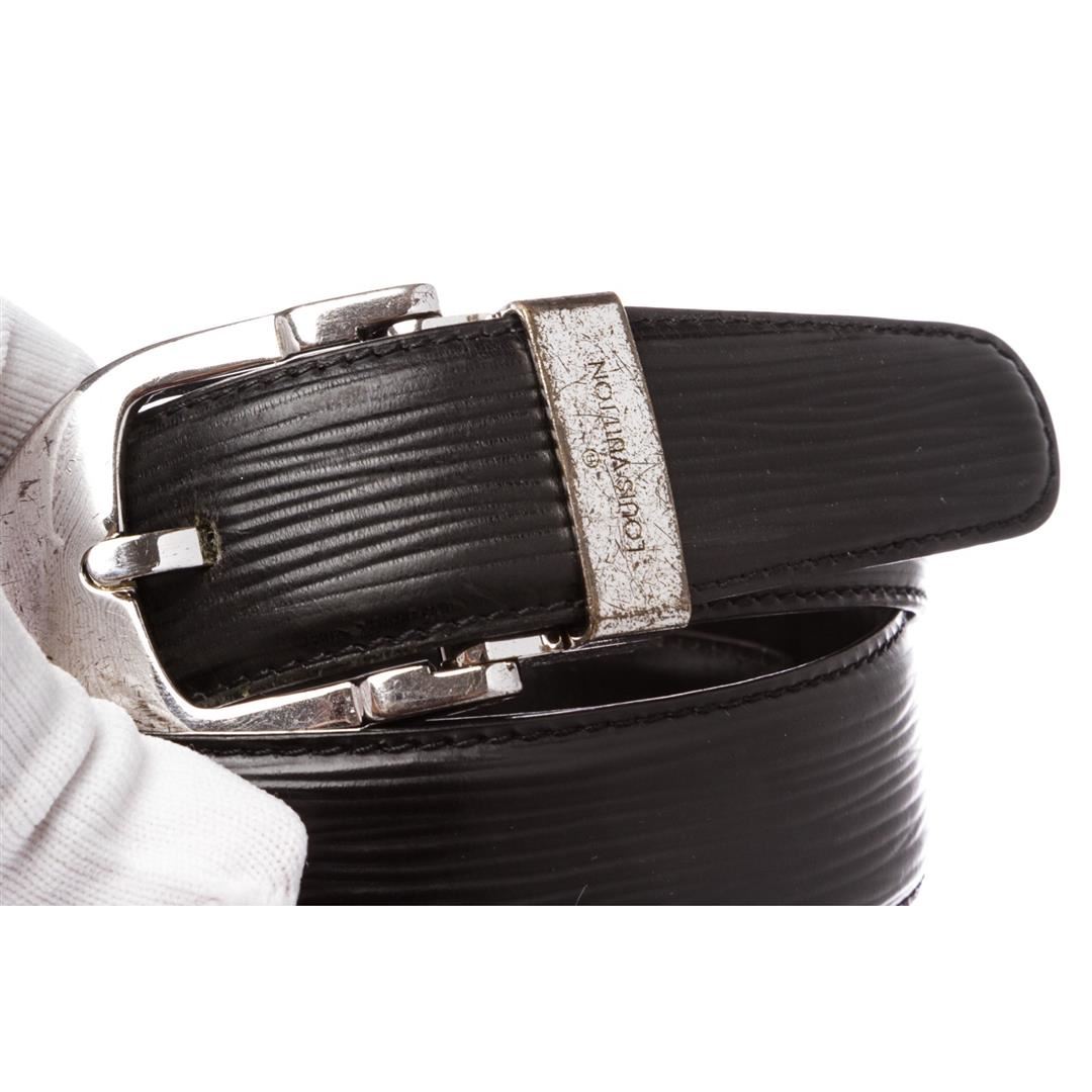 Black Epi leather Louis Vuitton Classique belt with silver-tone buckle closure at front. Item is pre-owned. Item Dimensions: Length:32"-36" Width:1.125"/Length: 81.2cm-91.4 Width:2.8cm.