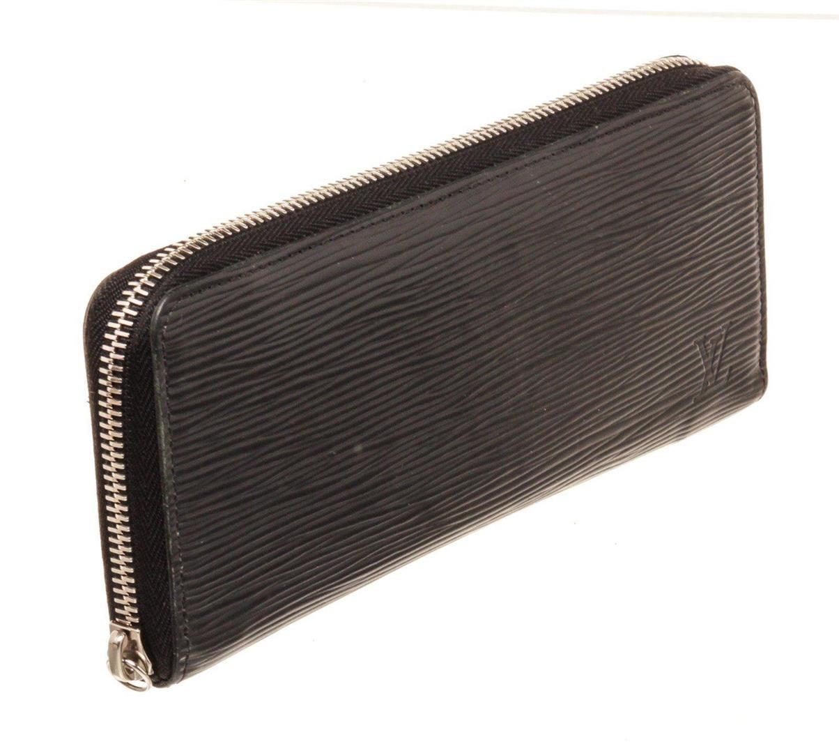 Louis Vuitton Black Epi Leather Clemence Wallet with epi leather, gold-tone hardware, trim tan vachetta leather, interior three compartments pocket and zipper closure.