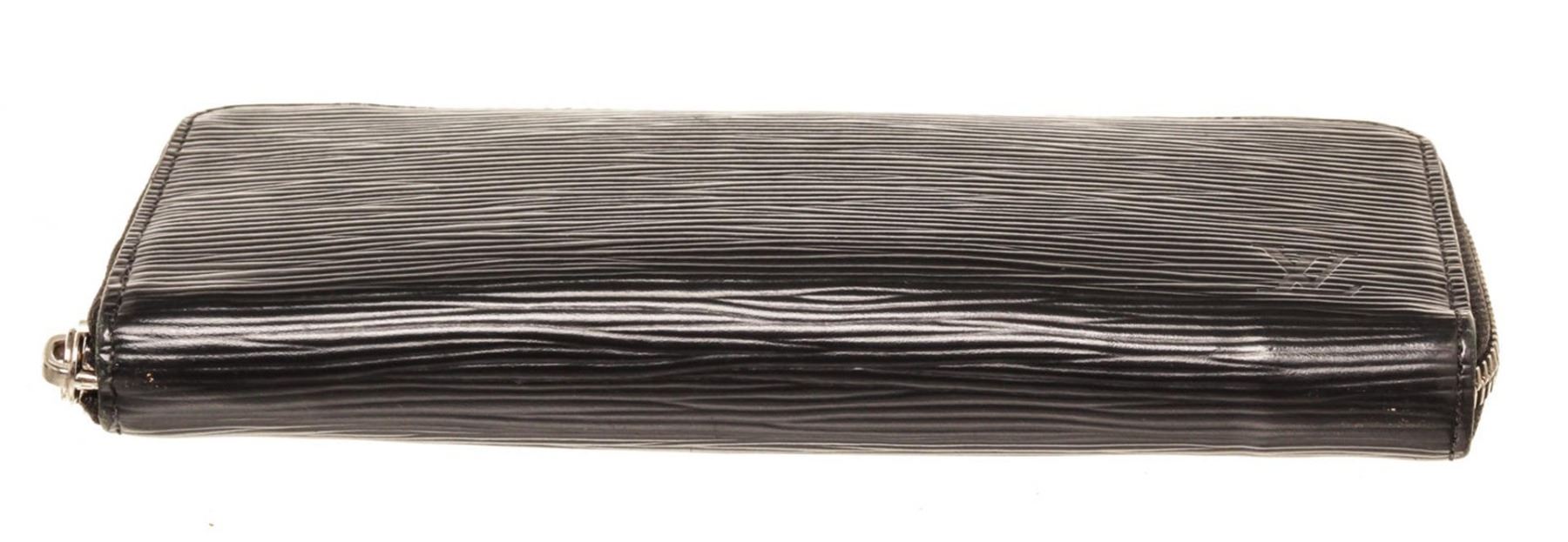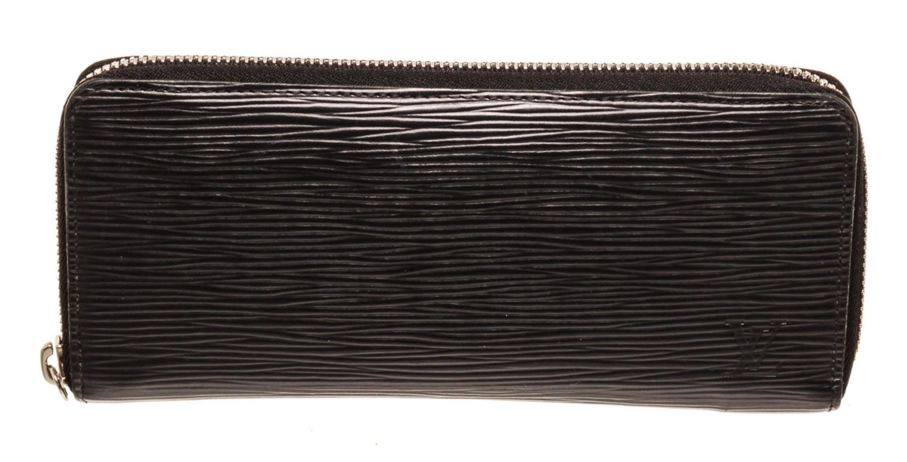 Louis Vuitton Black Epi Leather Clemence Wallet with epi leather, gold-tone hardware, trim tan vachetta leather, interior three compartments pocket and zipper closure.