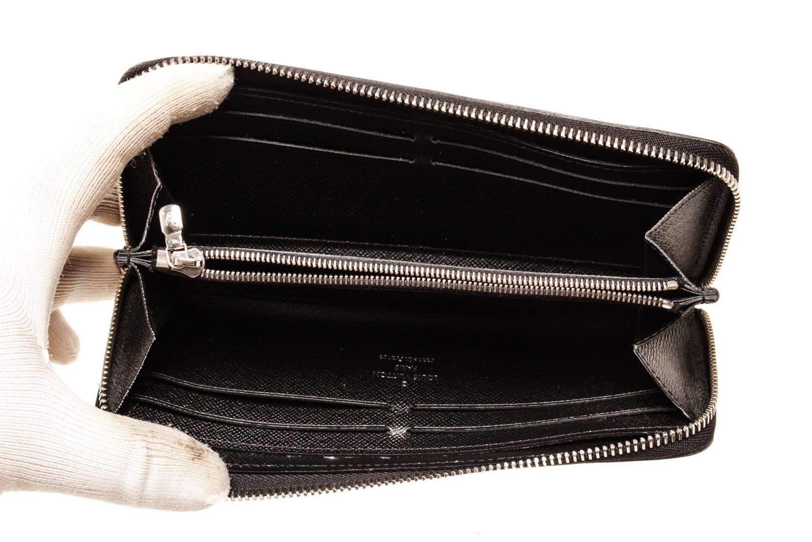 Louis Vuitton Black Epi Leather Clemence Wallet with epi leather, gold-tone hardware, trim tan vachetta leather, interior three compartments pocket and zipper closure.