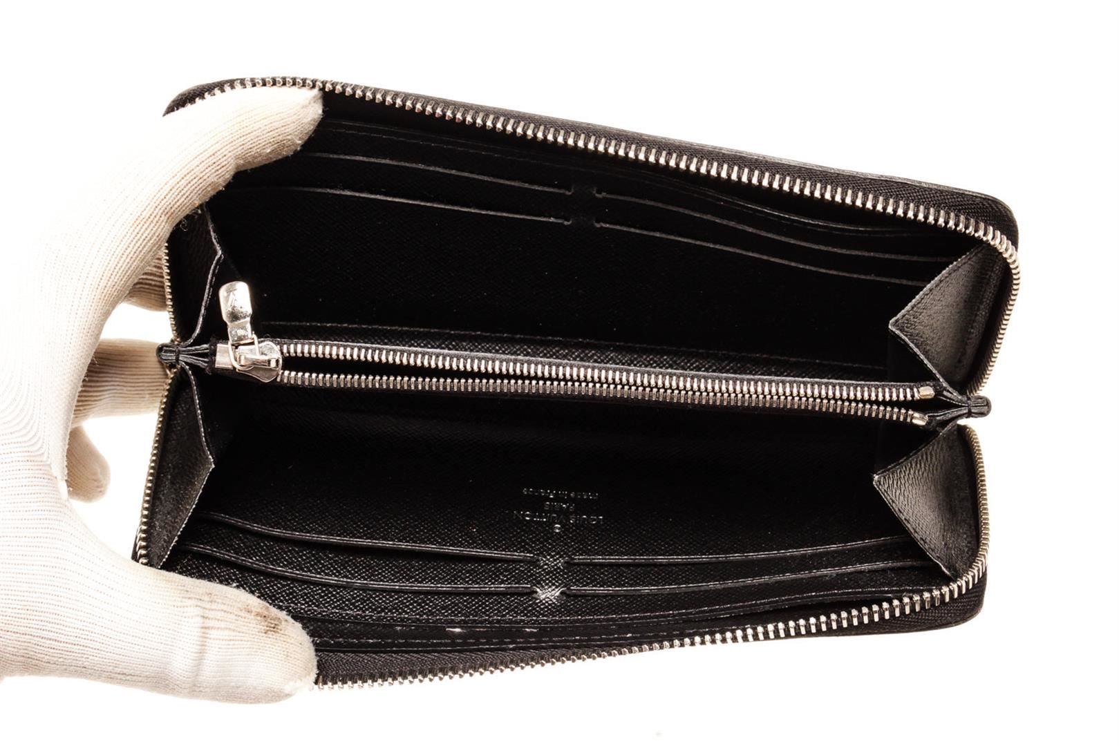 One Louis Vuitton Black Epi Leather Clemence Wallet. Item is sold AS-IS. All available information is listed in the description and shown in the photo. Louis Vuitton Black Epi Leather Clemence Wallet with epi leather, gold-tone hardware, trim tan vachetta leather, interior three compartments pocket and zipper closure.