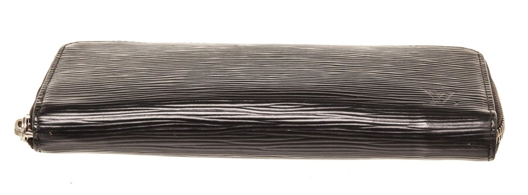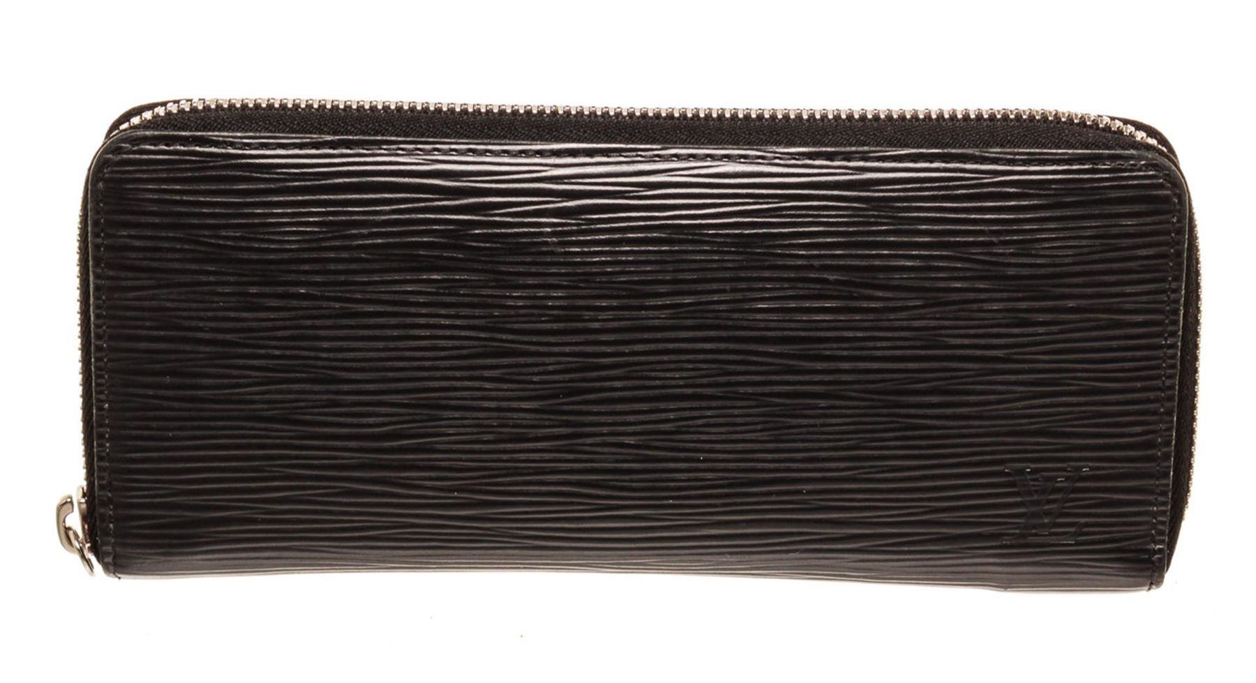 One Louis Vuitton Black Epi Leather Clemence Wallet. Item is sold AS-IS. All available information is listed in the description and shown in the photo. Louis Vuitton Black Epi Leather Clemence Wallet with epi leather, gold-tone hardware, trim tan vachetta leather, interior three compartments pocket and zipper closure.
