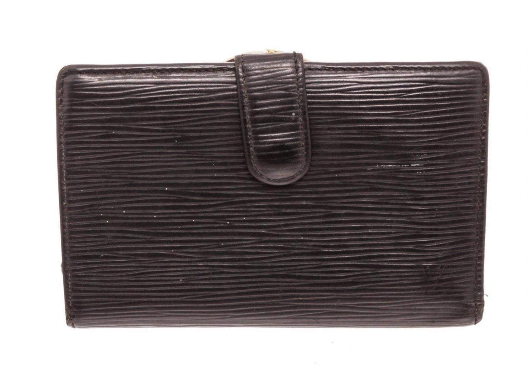 Louis Vuitton Black Epi Leather French Wallet with gold-tone hardware, tan vachetta leather trim, interior flap pockets, brown leather lining, and snap closure. Measurements: Length: 1.5 in / 4 cm Width: 5 in / 13 cm 3.5 in / 9 cmCONDITION: Pre-Owned Good overall, please see photographs for detail.