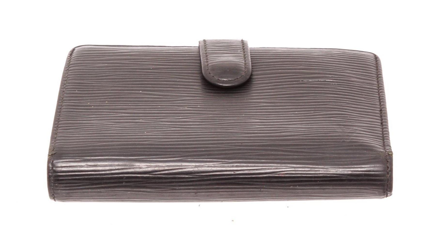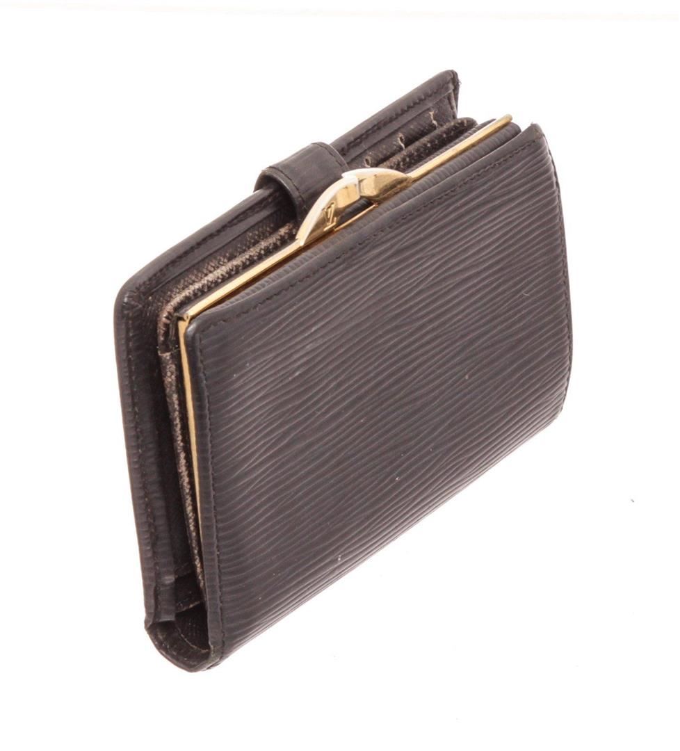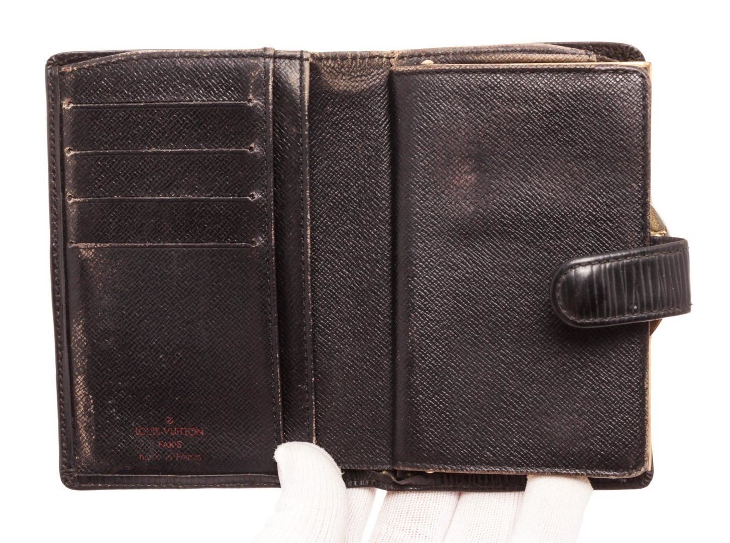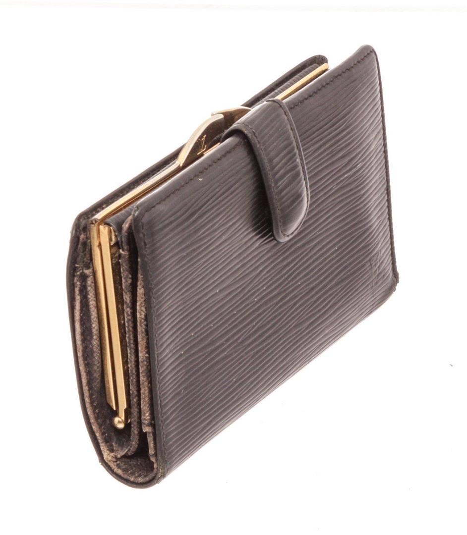 Louis Vuitton Black Epi Leather French Wallet with gold-tone hardware, black leather lining, and snap closure.
