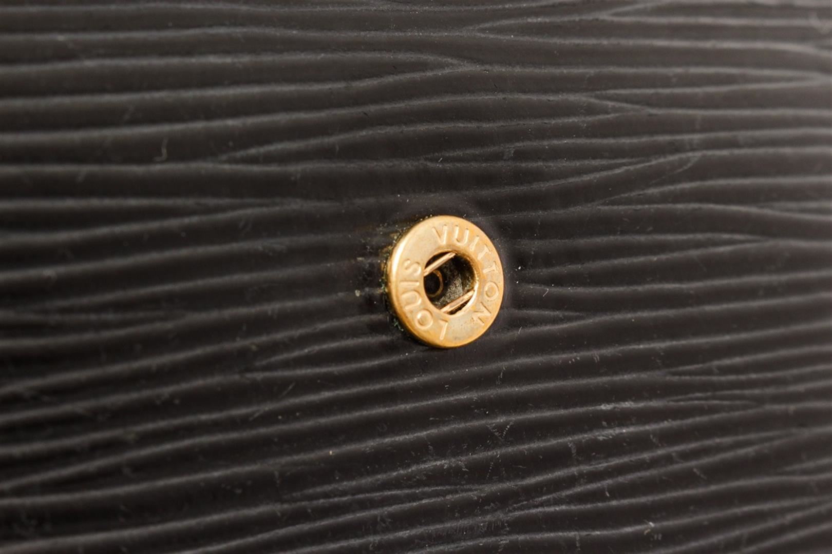 Louis Vuitton Black Epi Leather French Wallet. All available information is listed in the description and shown in the photos. louis vuitton black epi leather french wallet with epi leather, gold-tone hardware, trim tan vachetta leather, three interior compartments pockets, leather lining and snap closure.
