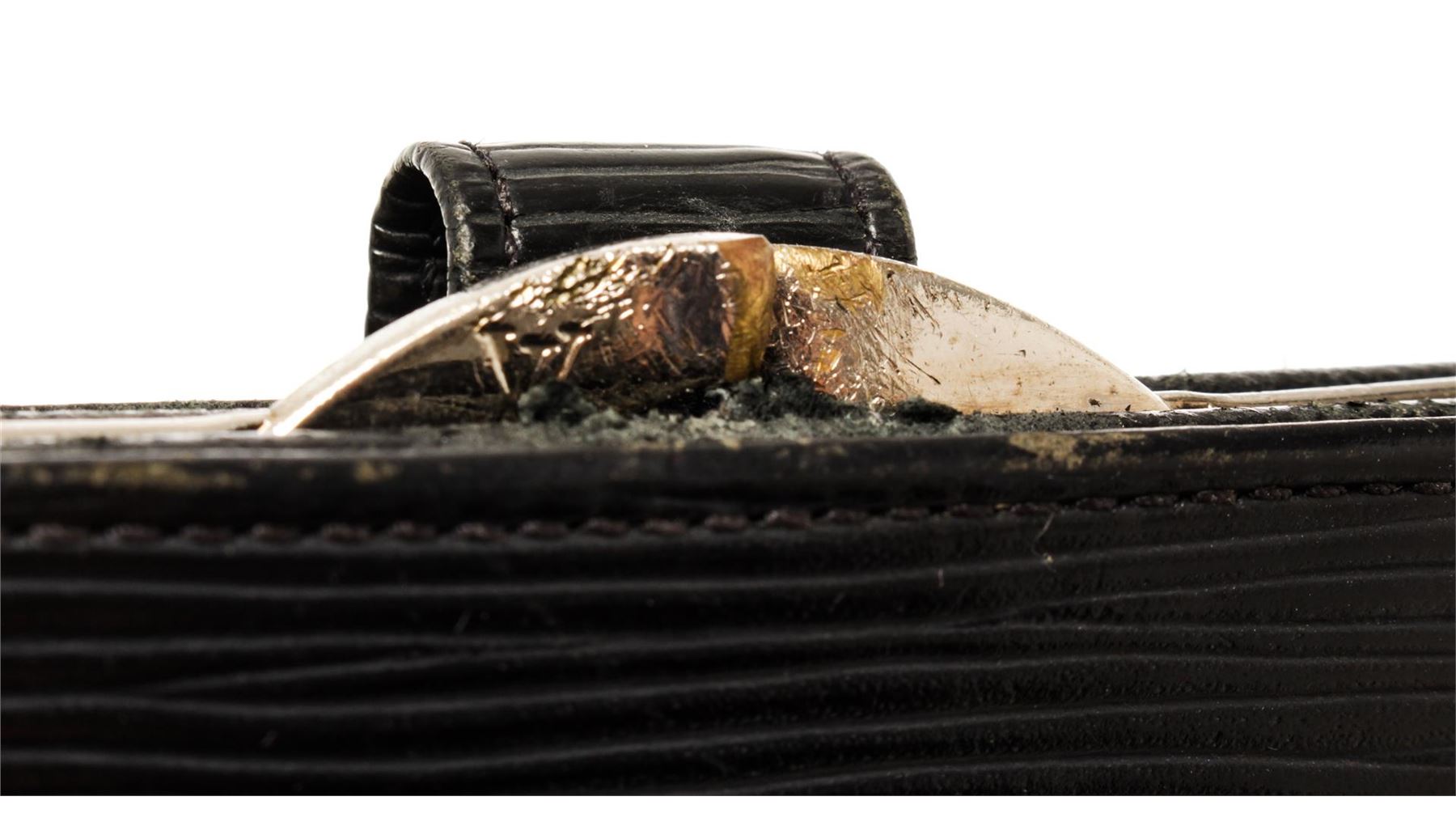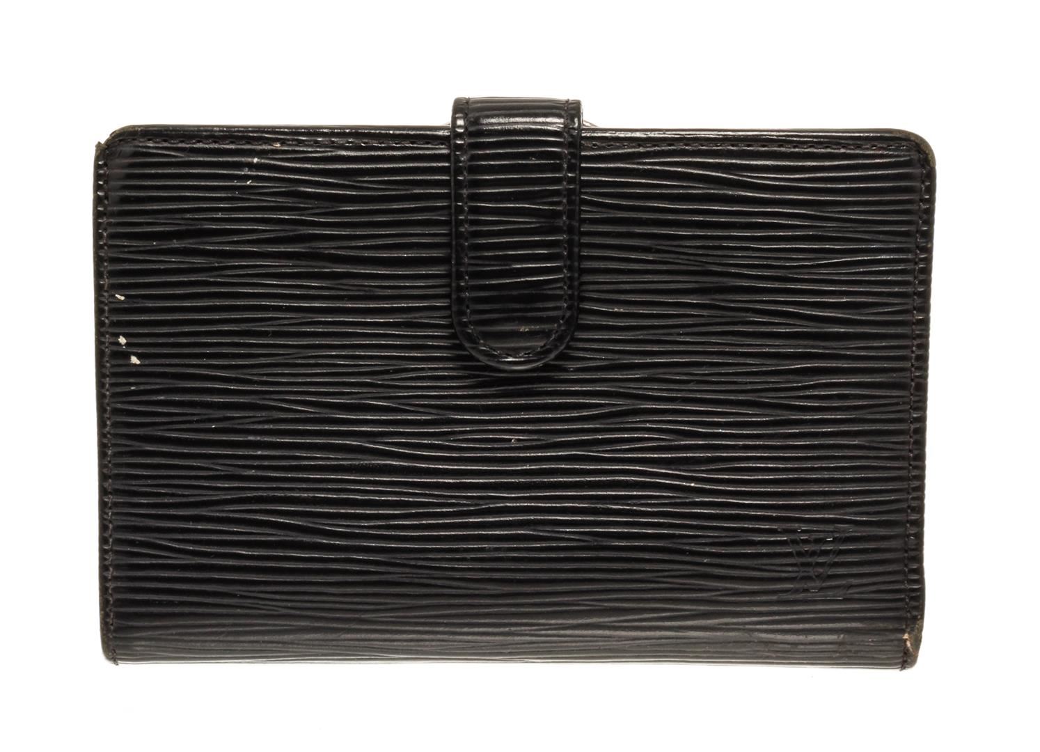 One Louis Vuitton Black Epi Leather French Wallet. Item is sold AS-IS. All available information is listed in the description and shown in the photo. Louis Vuitton Black Epi Leather French Wallet with gold-tone hardware, single coin compartment with Kiss-lock closure, black leather lining, dual slit compartments, four card slots, and snap closure at front. Please note hardware for closure is damaged.