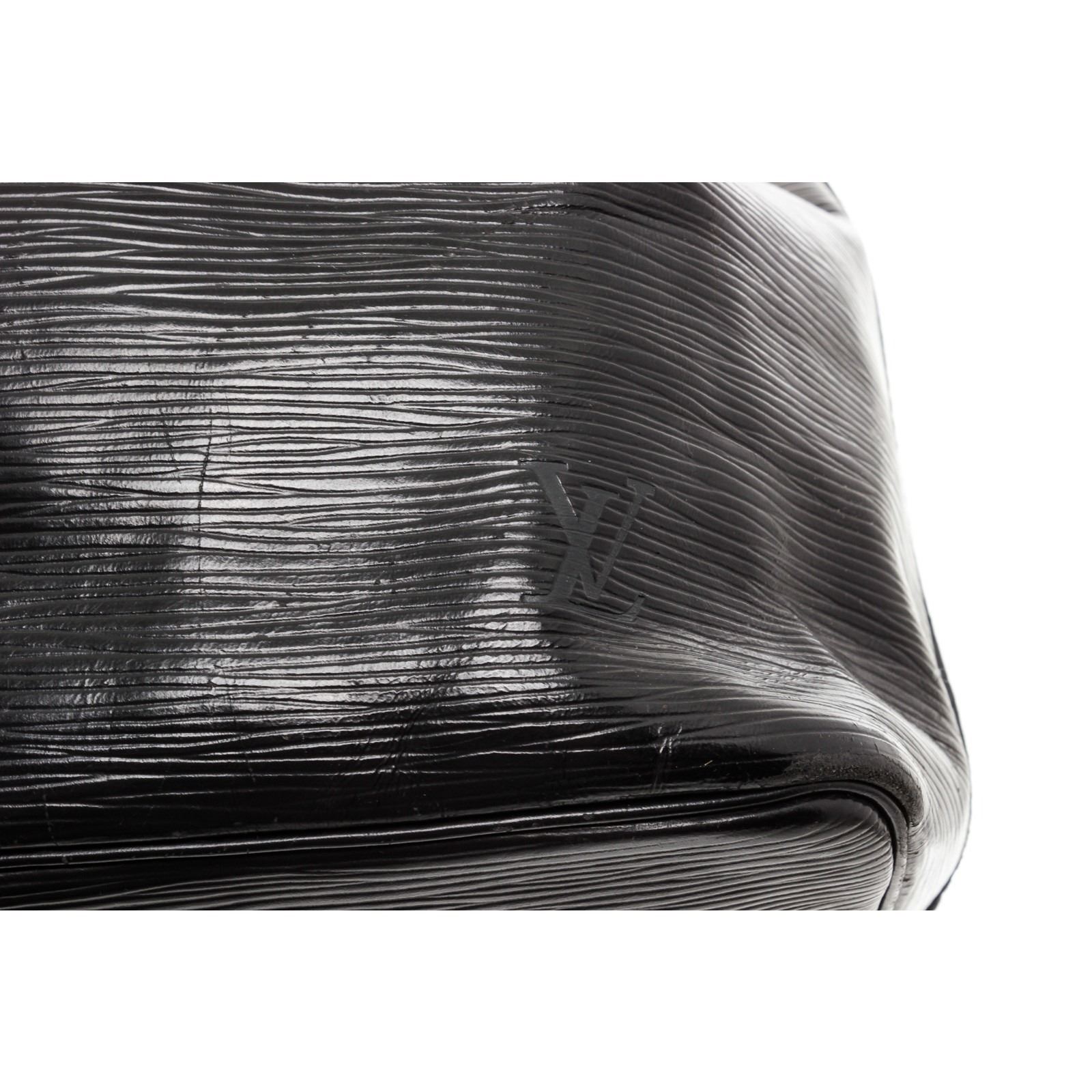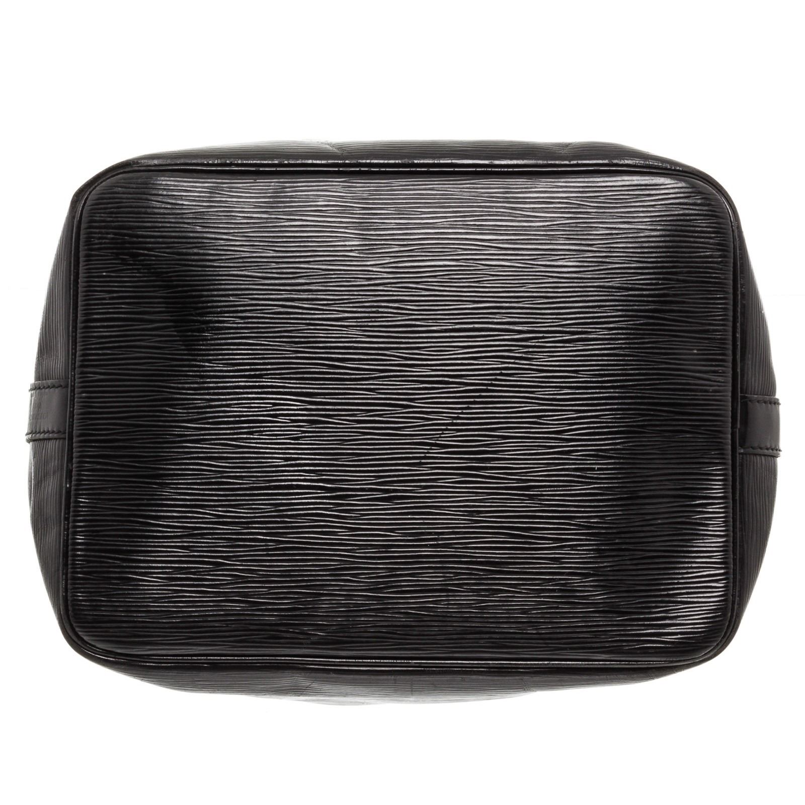 Description: Louis Vuitton Black Epi Leather Noe PM Drawstring Shoulder Bag. Black Epi leather Louis Vuitton Noe PM with brass hardware, adjustable flat shoulder strap, tonal Alcantara lining and drawstring closure at top.