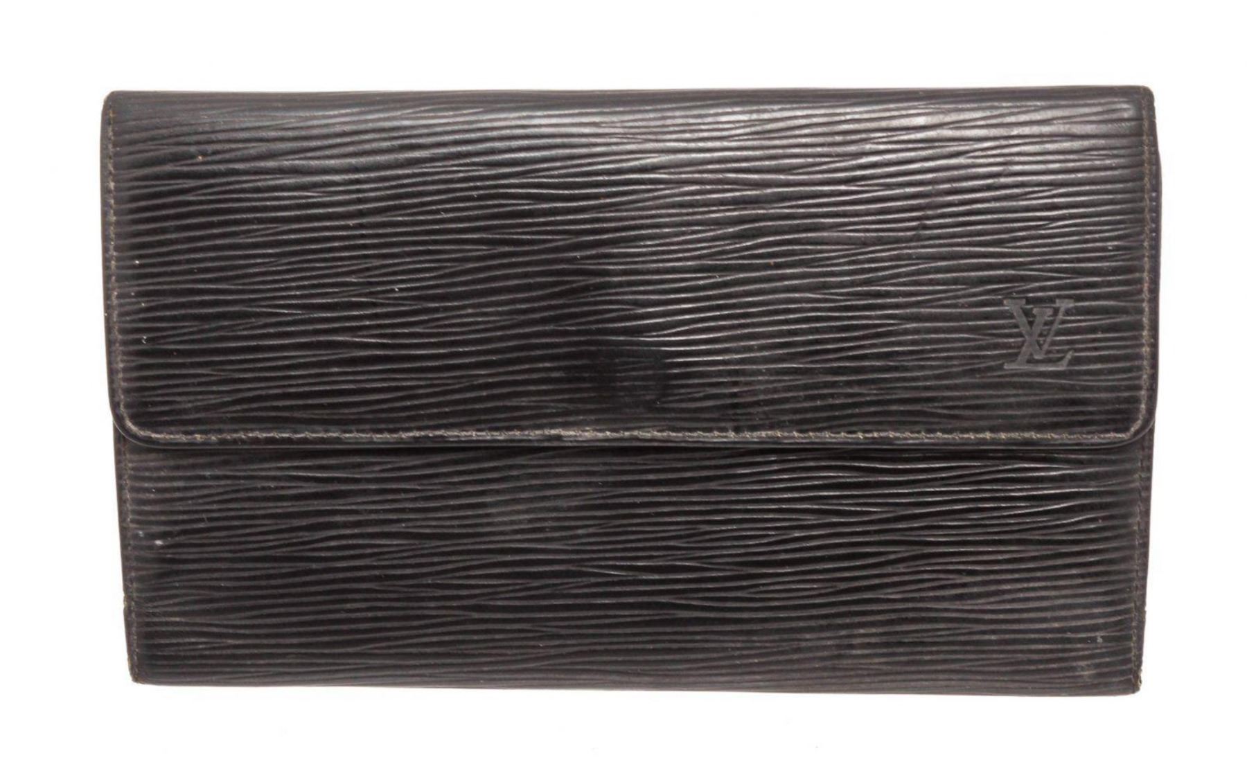 Louis Vuitton Black Epi Leather International Wallet. Louis Vuitton Black Epi Leather International Wallet with silver-tone hardware leather lining, dual bill compartments, single coin compartment with snap closure, ten card slots and snap closure at fron
