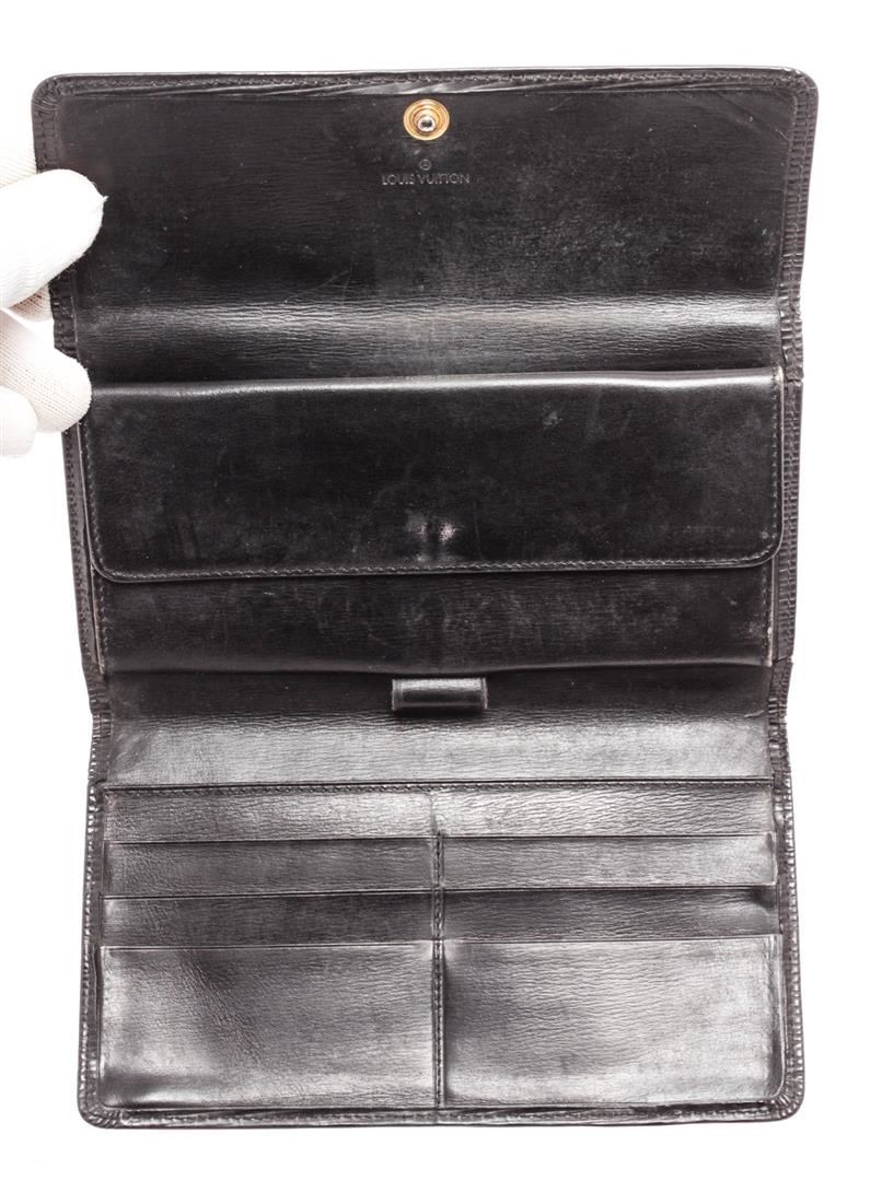 Louis Vuitton Black Epi Leather International Wallet. All available information is listed in the description and shown in the photos. Louis Vuitton Black Epi Leather International Wallet with silver-tone hardware leather lining, dual bill compartments, single coin compartment with snap closure, ten card slots and snap closure at front flap.