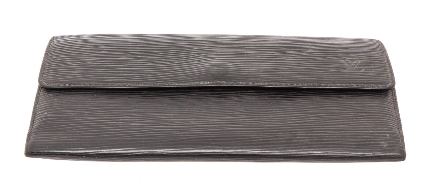 Louis Vuitton Black Epi Leather International Wallet. All available information is listed in the description and shown in the photos. Louis Vuitton Black Epi Leather International Wallet with silver-tone hardware leather lining, dual bill compartments, single coin compartment with snap closure, ten card slots and snap closure at front flap.