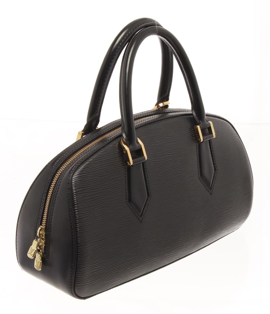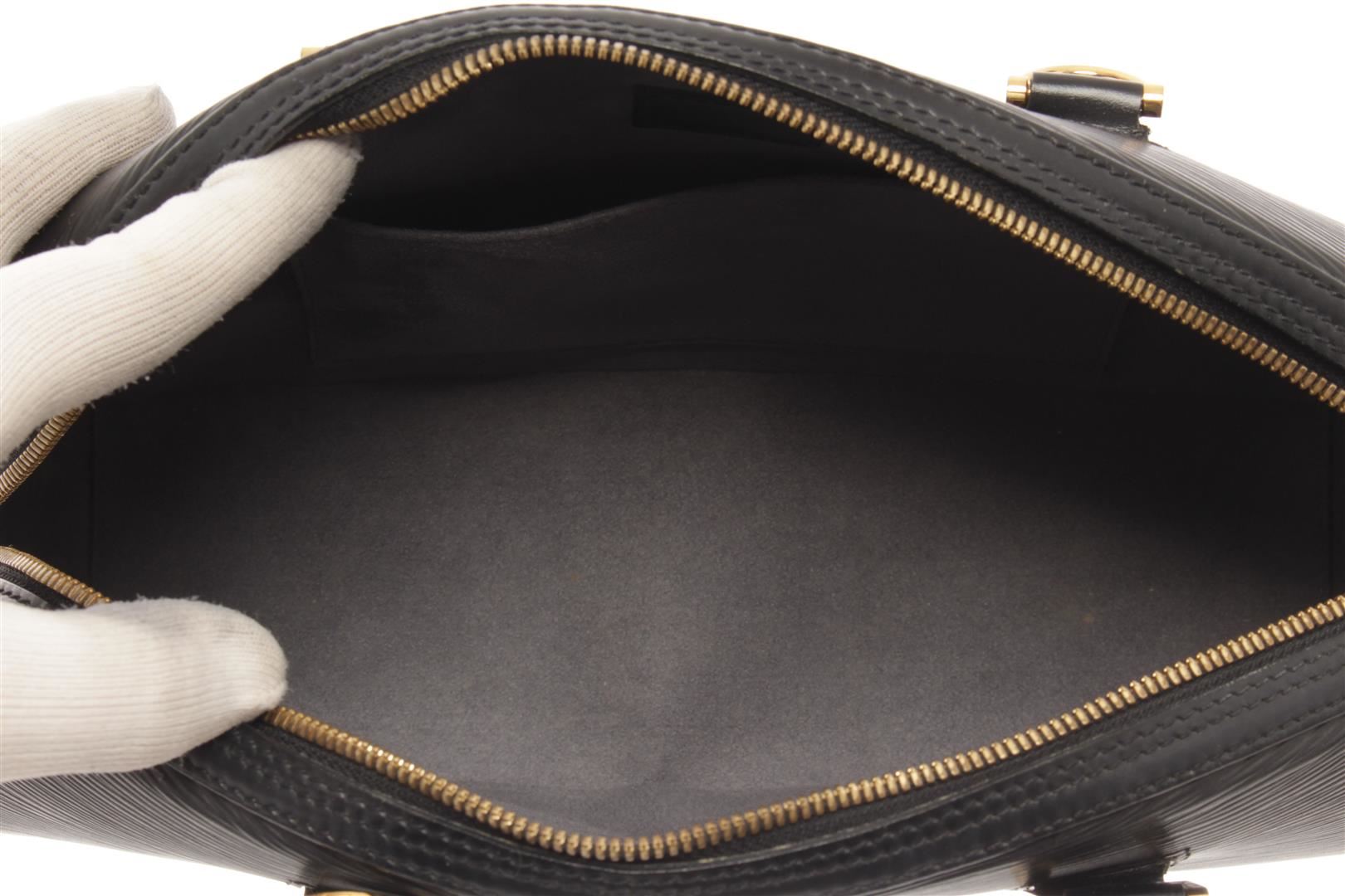 One Louis Vuitton Black Epi Leather Jasmin Satchel Bag. Item is sold AS-IS. All available information is listed in the description and shown in the photo. Louis Vuitton Black Epi Leather Jasmin Satchel Bag with top handle, gold tone hardware, suede lining, interior pocket slip, zipper closure. Depth 3.9 in, Handle 3.5 in, Height 7.1 in, Width 12.6 in/ Depth 10 cm, Handle 9 cm, Height 18 cm, Width 32 cm
