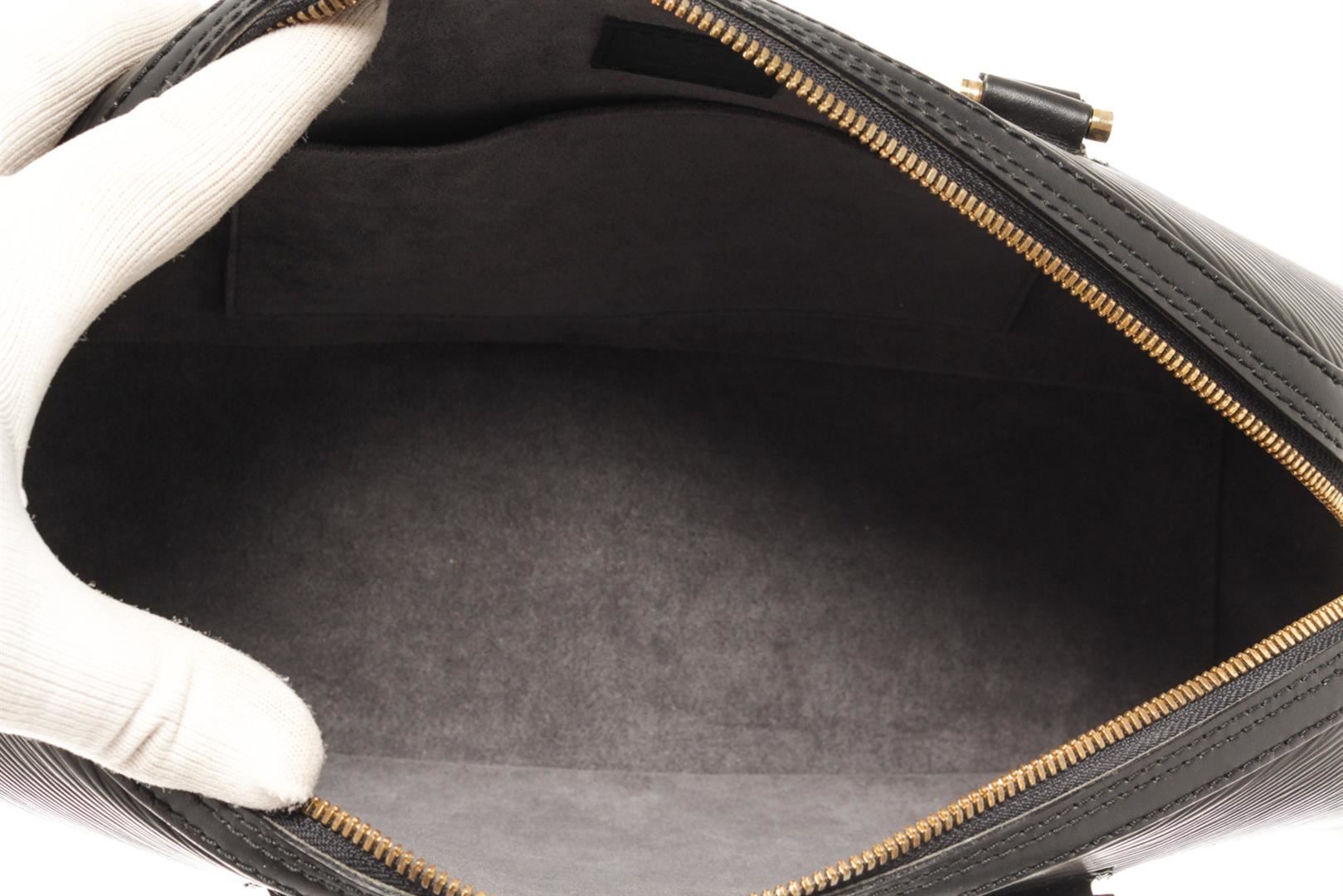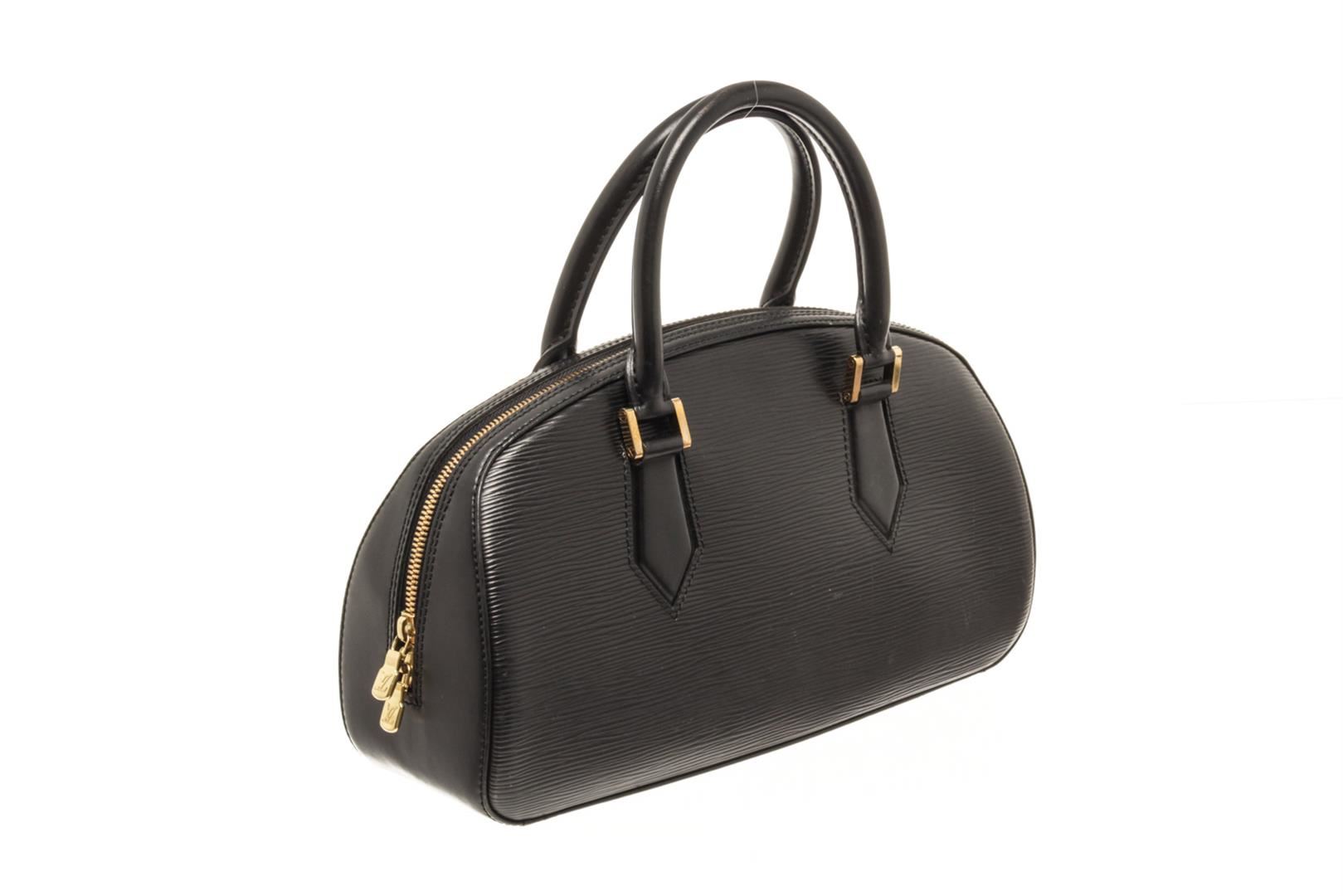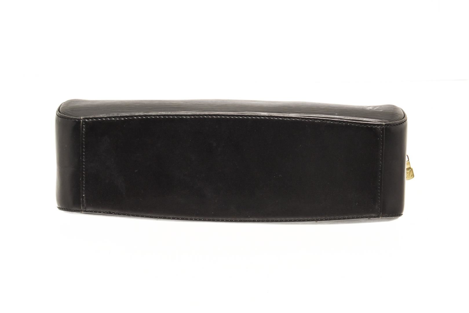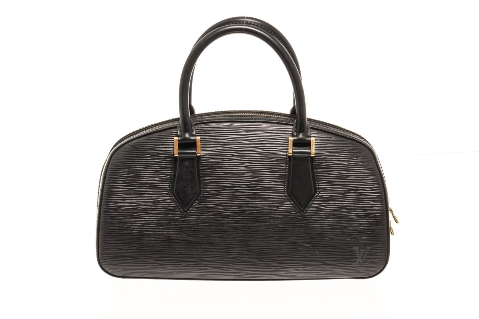 One Louis Vuitton Black Epi Leather Jasmine Bag. Item is sold AS-IS. All available information is listed in the description and shown in the photo. louis vuitton black epi leather jasmine bag with silver-tone hardware rolled handles microfiber lining & single interior pocket zip closure at top includes dust bag. Height: 3.75" Width: 12.5" Depth: 3.75", Handle Drop: 3.75" / 9.52 x 31.75 x 9.52 Cm