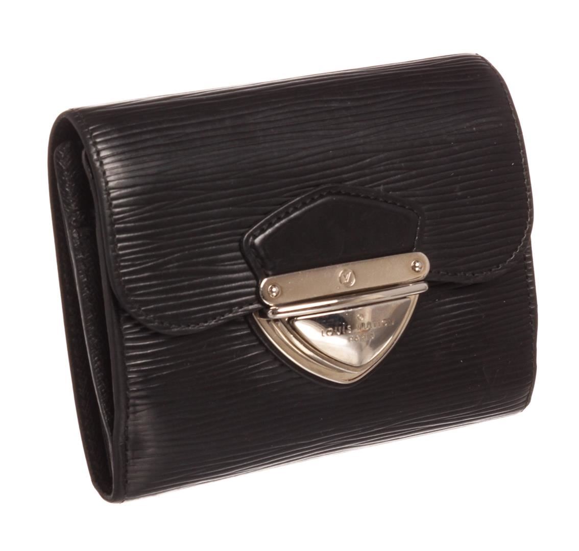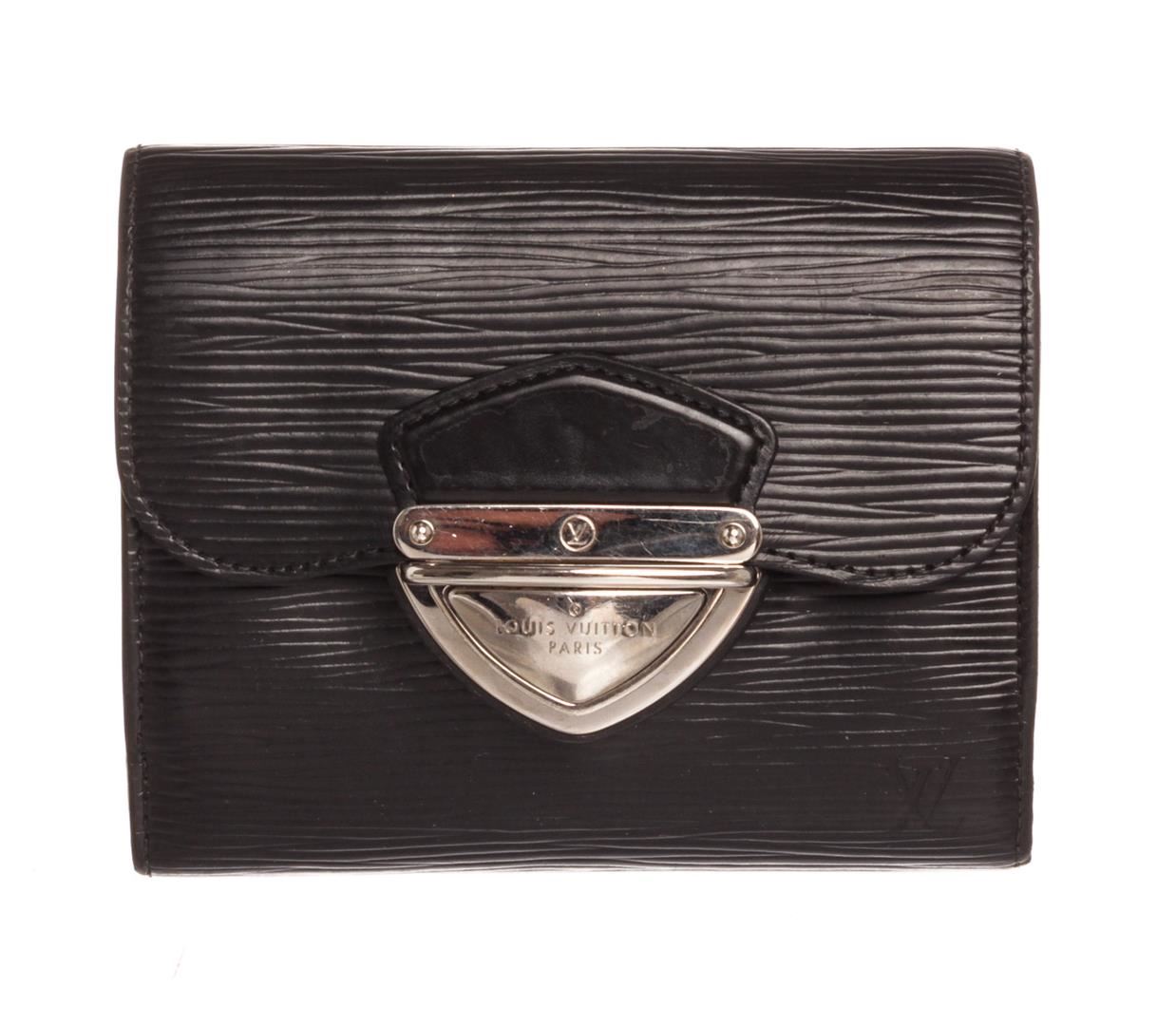 Black epi leather Louis Vuitton Joey wallet with silver-tone hardware, single slit pocket under front flap, tonal leather interior lining, dual compartments; one with zip closure, single bill compartment, nine card slots, single ID window and push-lock cl