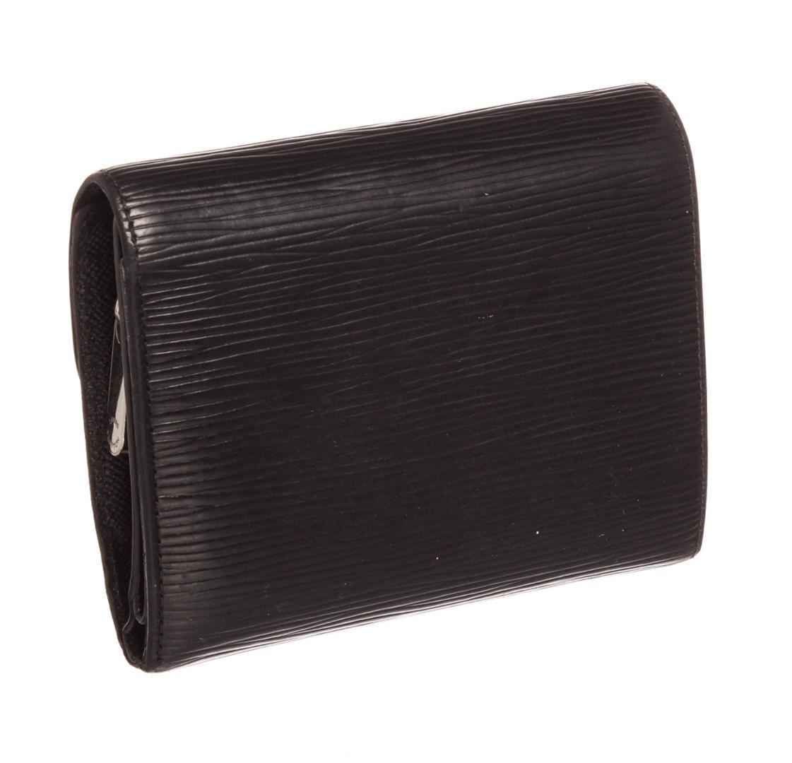 Black epi leather Louis Vuitton Joey wallet with silver-tone hardware, single slit pocket under front flap, tonal leather interior lining, dual compartments; one with zip closure, single bill compartment, nine card slots, single ID window and push-lock cl