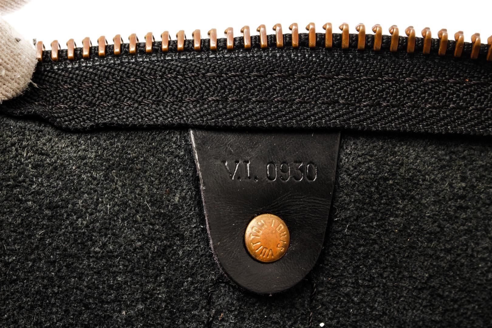 Louis Vuitton Black Epi Leather Keepall 50 Weekend/Travel Bag. All available information is listed in the description and shown in the photos. Louis Vuitton Black Epi Leather Keepall 50 Weekend/Travel Bag with black epi leather, brass hardware, rolled handles, single exterior pocket, unlined, zip closure at top. Height: 11", Width: 20", Depth: 8.5" / 27.94 x 50.8 x 21.59 CM