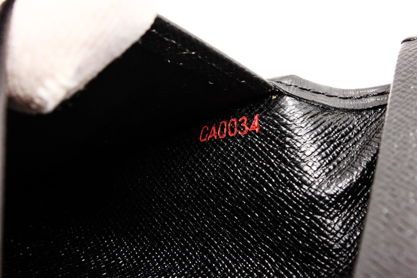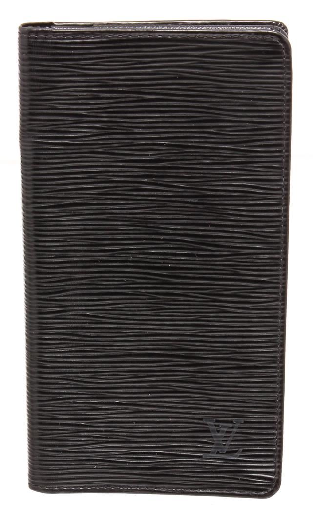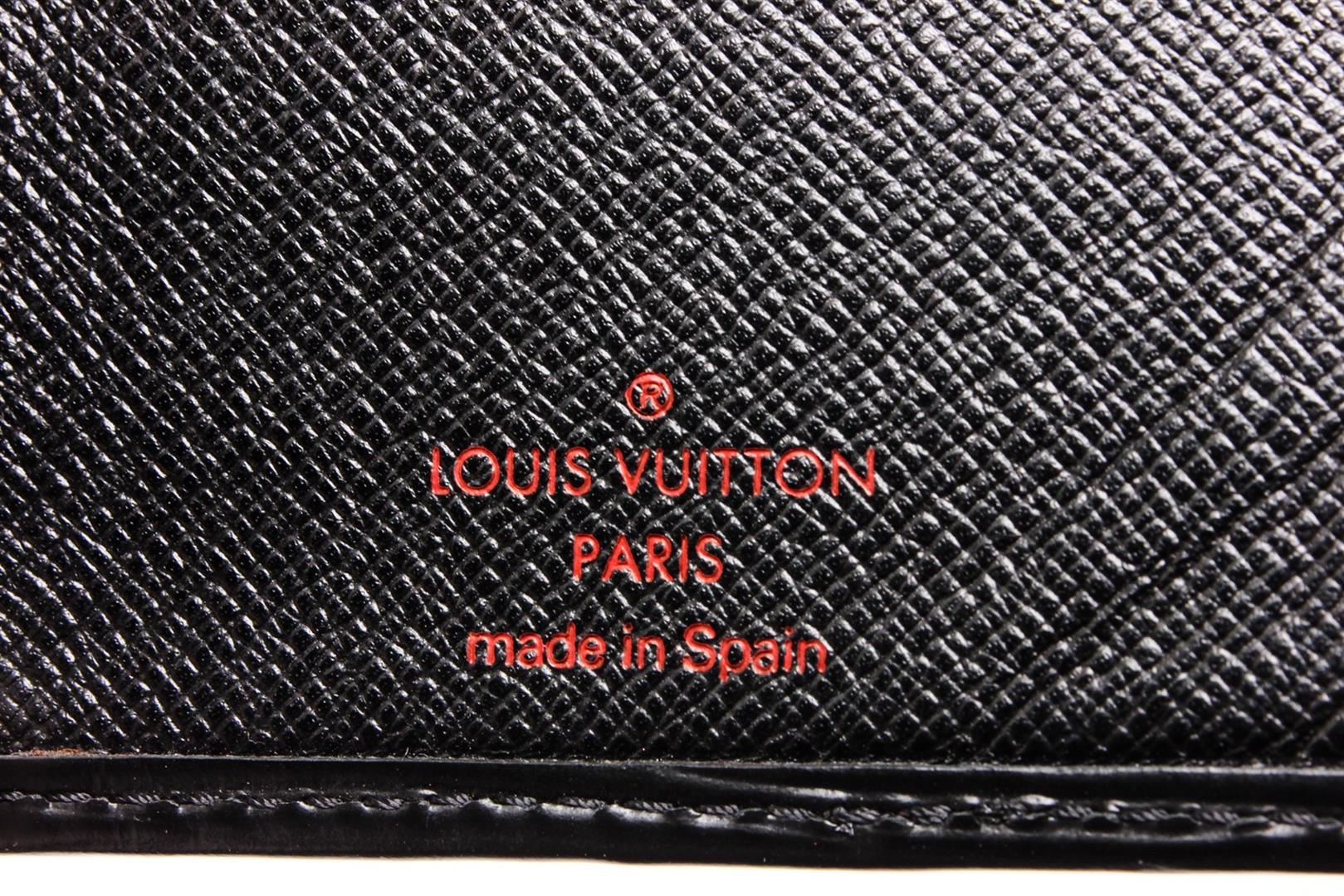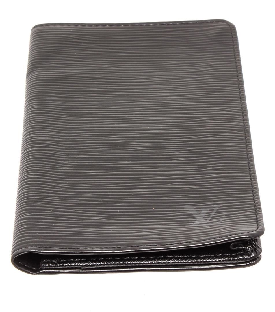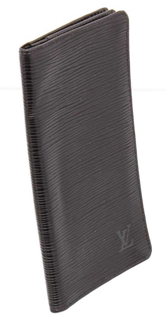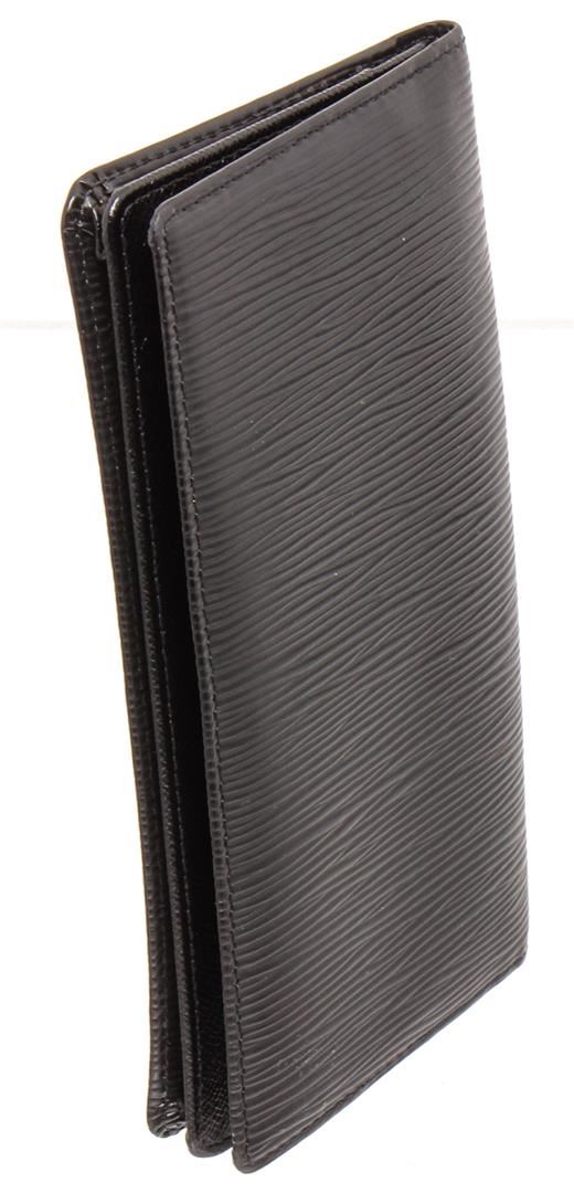 Black Epi leather Louis Vuitton long card wallet with debossed logo at front face, black taiga leather interior lining, three slit pockets, six card slots and overall bifold closure.