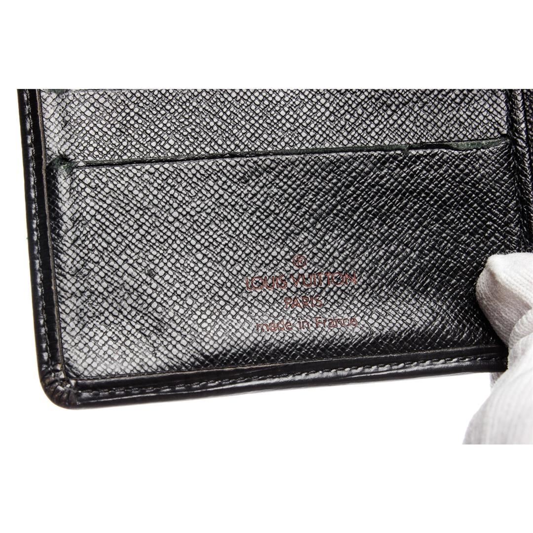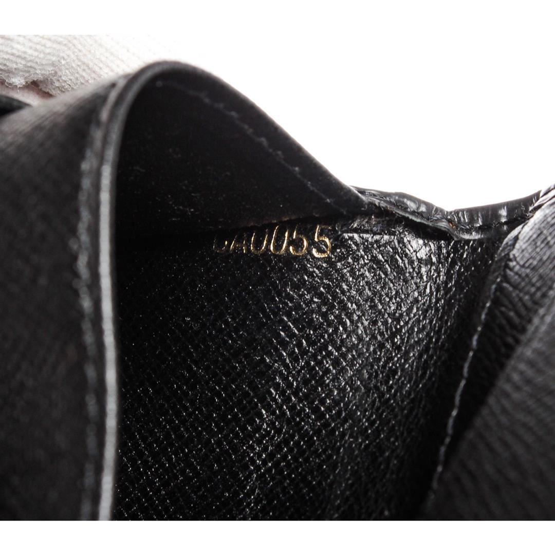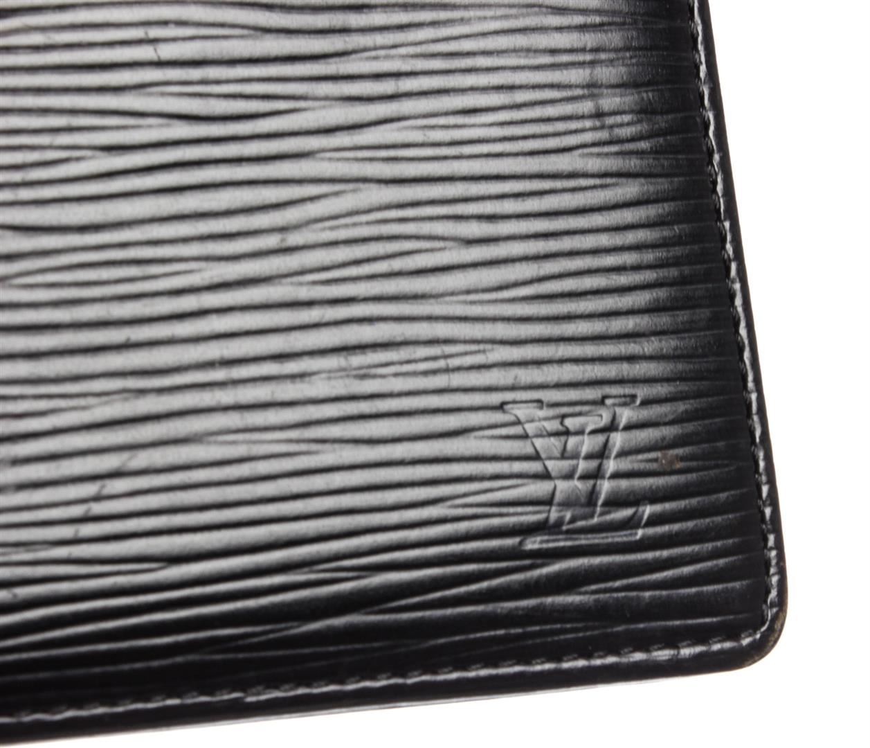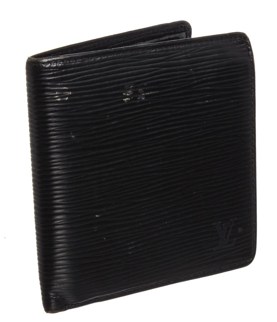 Black Louis Vuitton epi leather Marco men's wallet contains four credit card slots, two bill pockets, one side slip pocket and a coin pocket with a snap button closure.