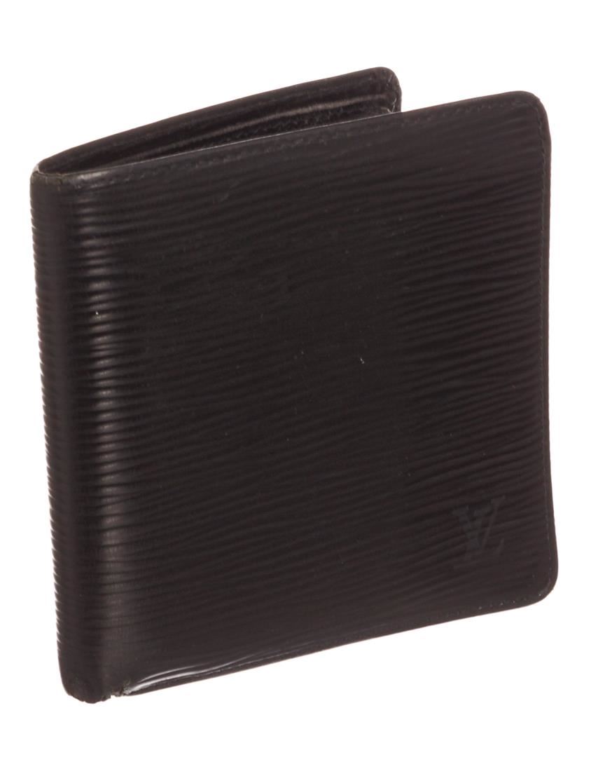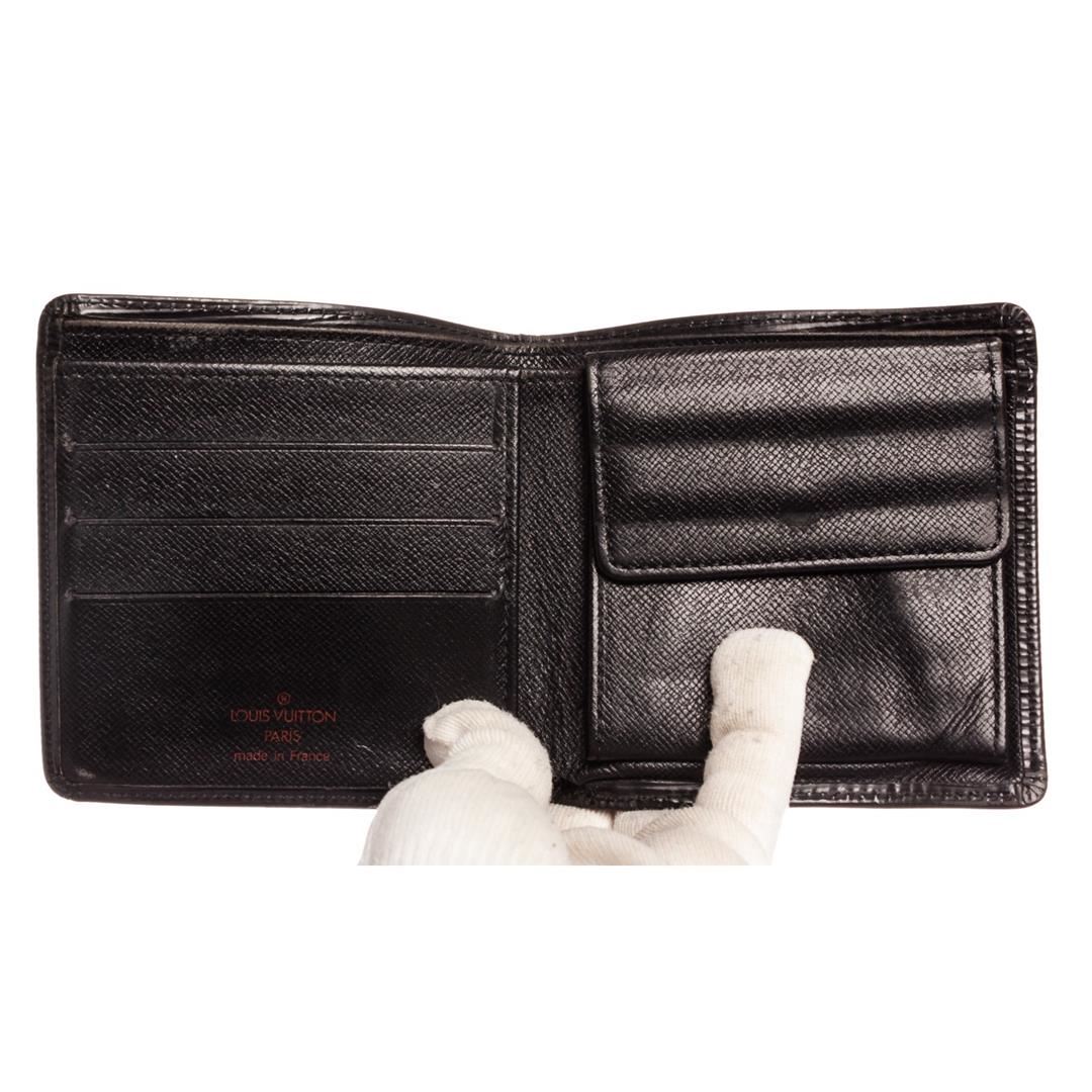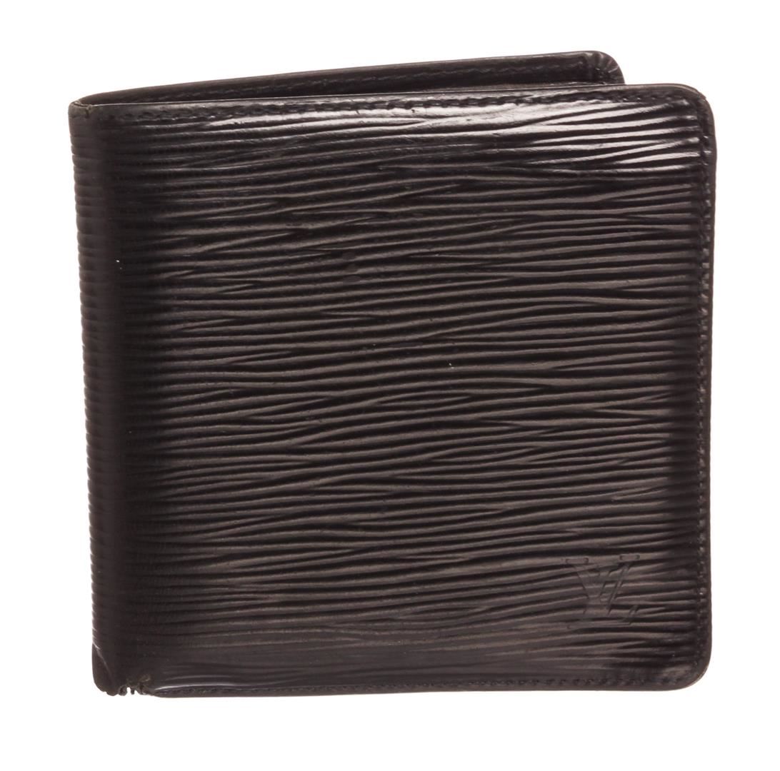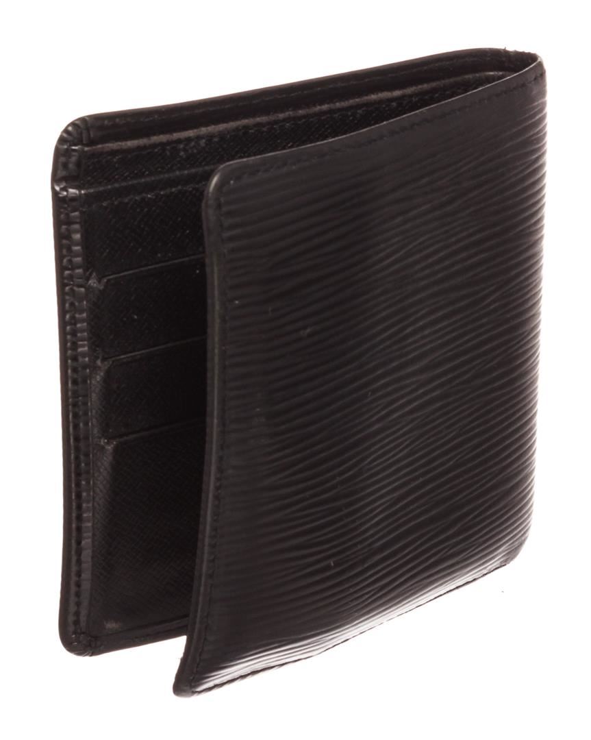 Louis Vuitton Black leather Marco men's wallet contains four credit card slots, two bill pockets, one side slip pocket and a coin pocket with a snap button closure.