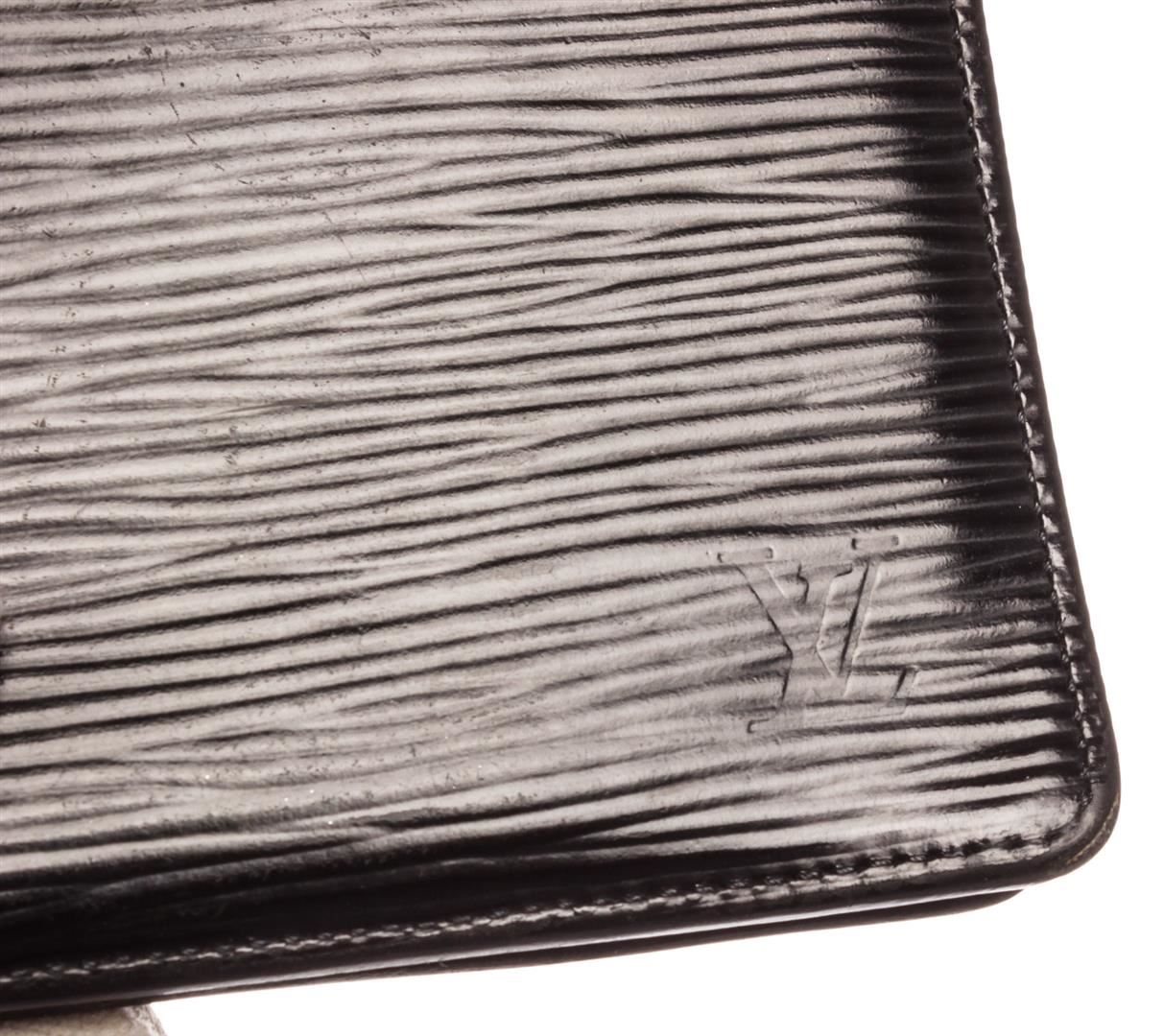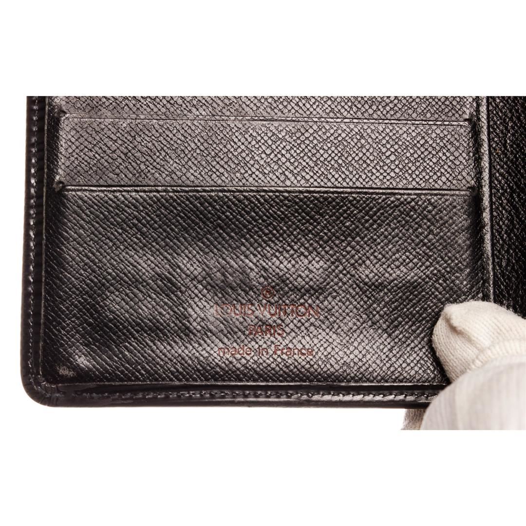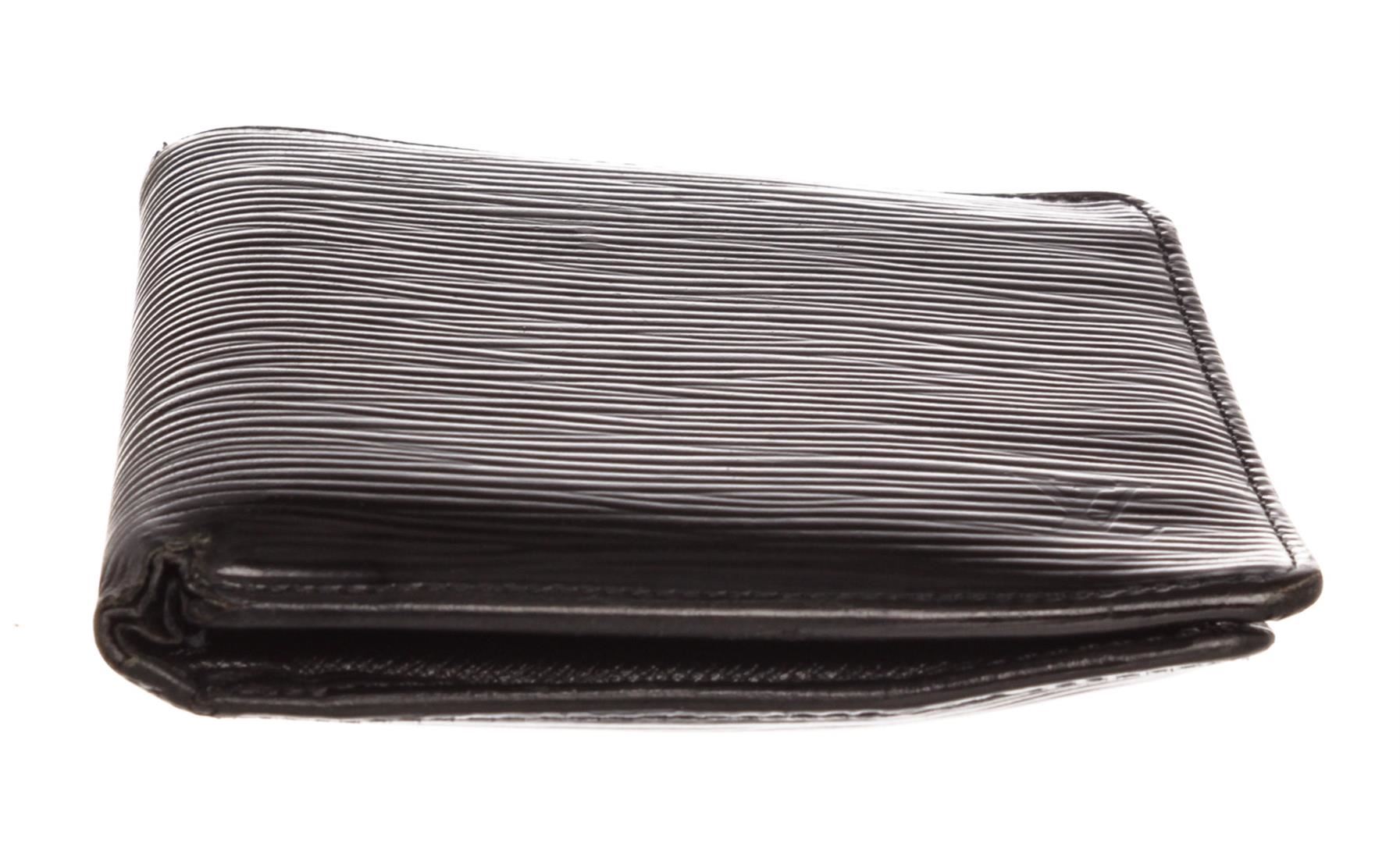 Louis Vuitton Black leather Marco men's wallet contains four credit card slots, two bill pockets, one side slip pocket and a coin pocket with a snap button closure.