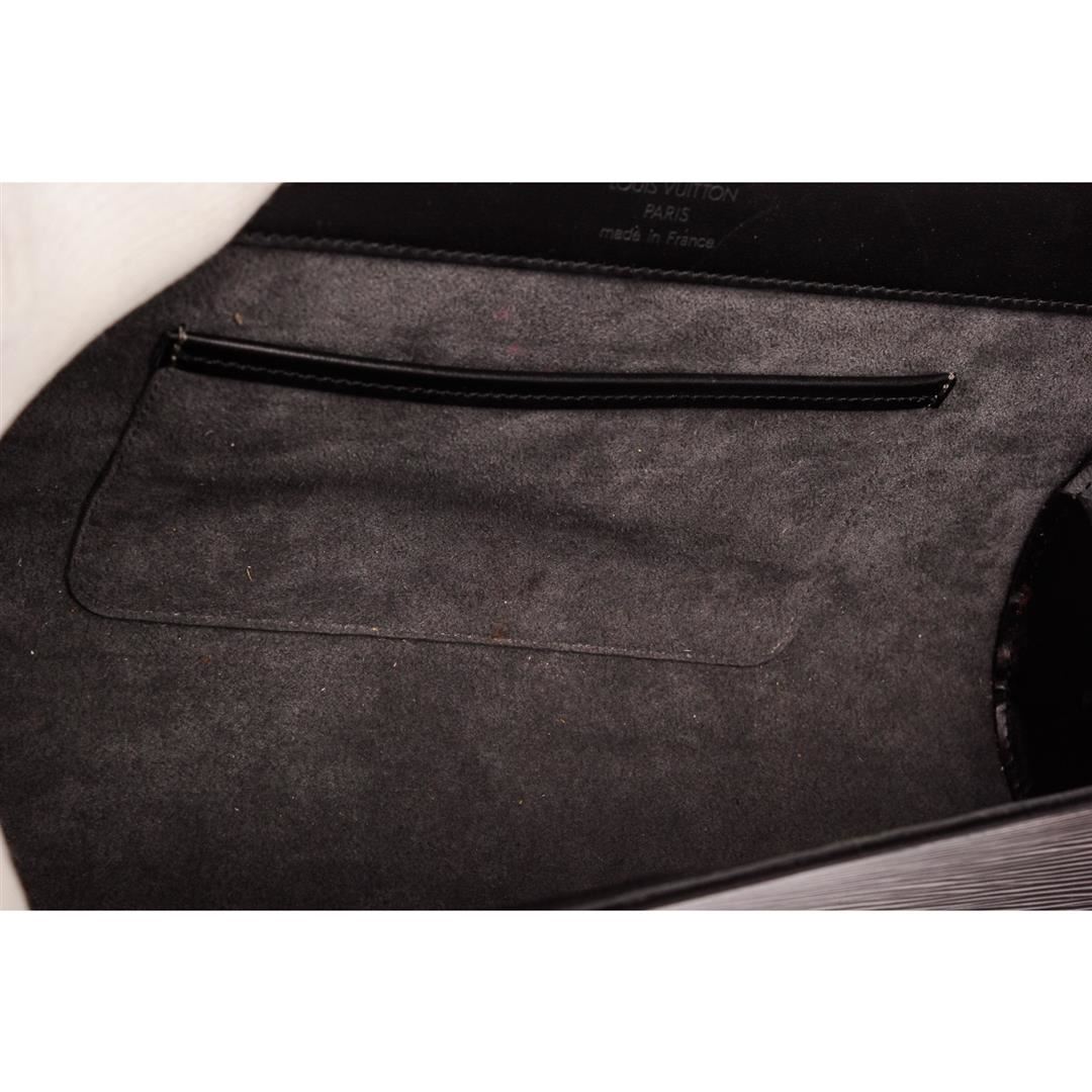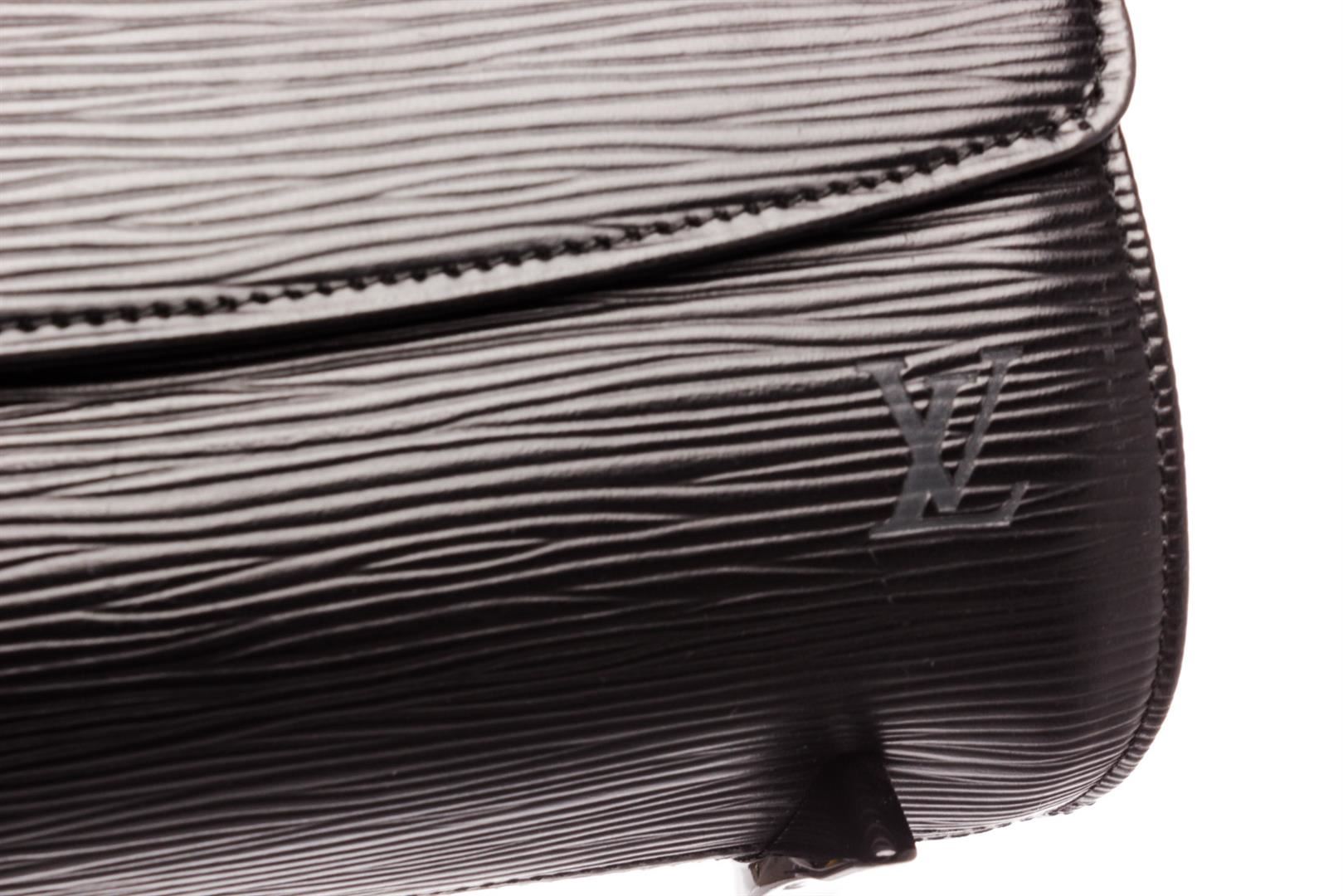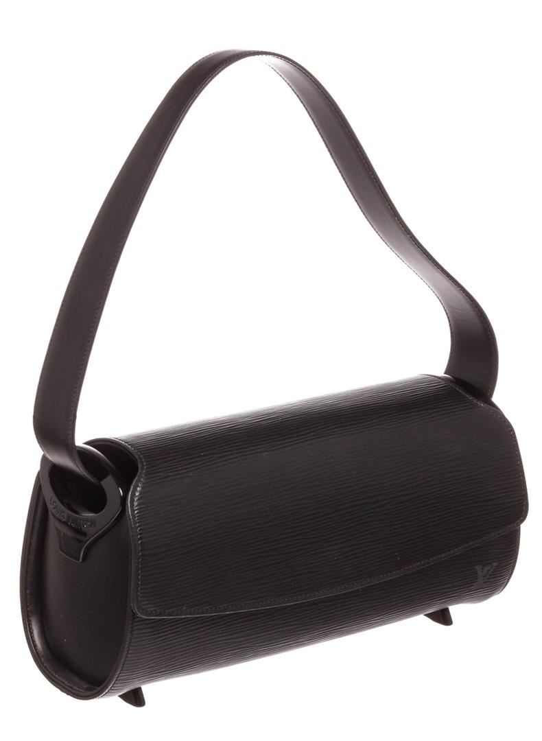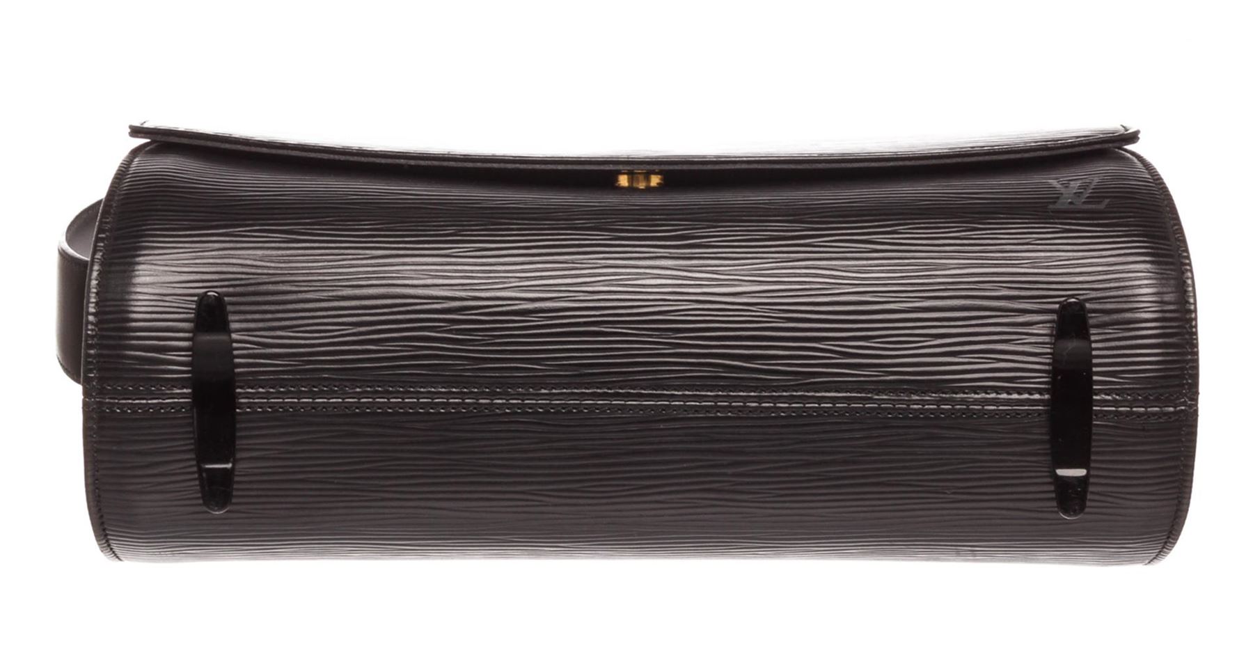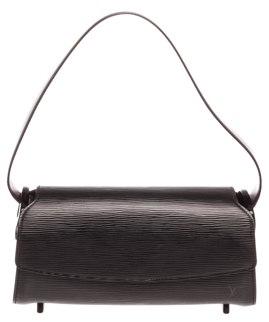 Black Epi leather Louis Vuitton Epi Nocturne PM with silver-tone hardware, single flat shoulder strap, protective feet at base, tonal Alcantara lining, single slip pockets at interior wall and magnetic snap closure at front flap.
