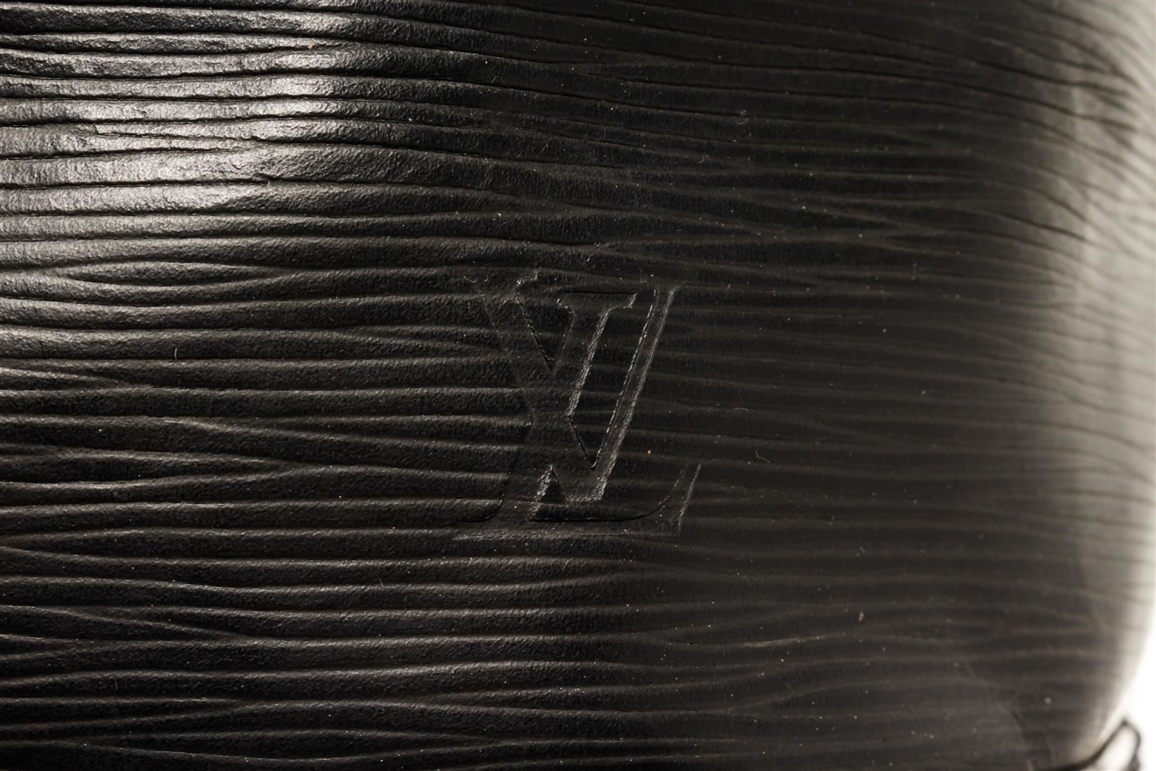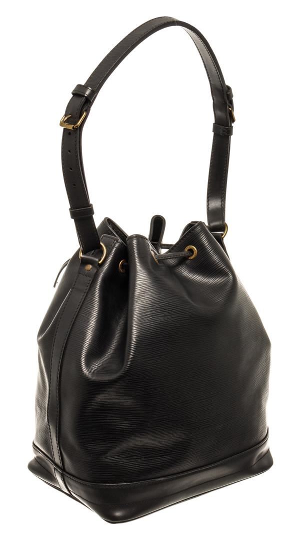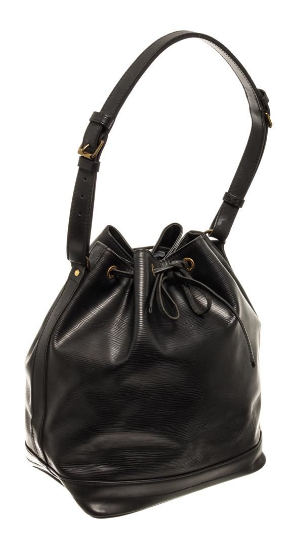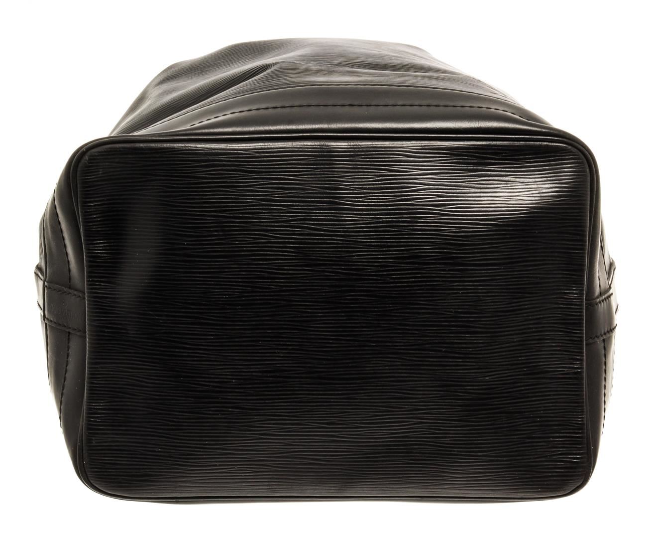One Louis Vuitton Black Epi Leather Noe Bucket Bag. Item is sold AS-IS. All available information is listed in the description and shown in the photo. Louis Vuitton Black Epi Leather Noe Bucket Bag with gold-tone hardware, leather trim, black suede lining, single adjustable black leather shoulder strap, and drawstring closure. .