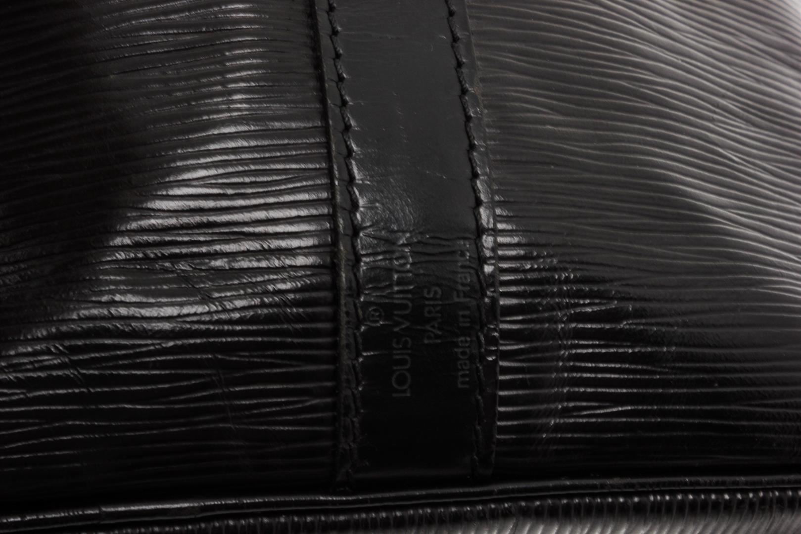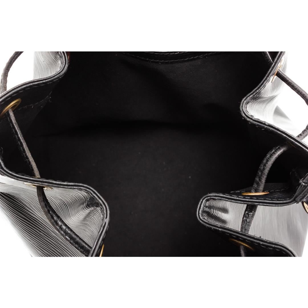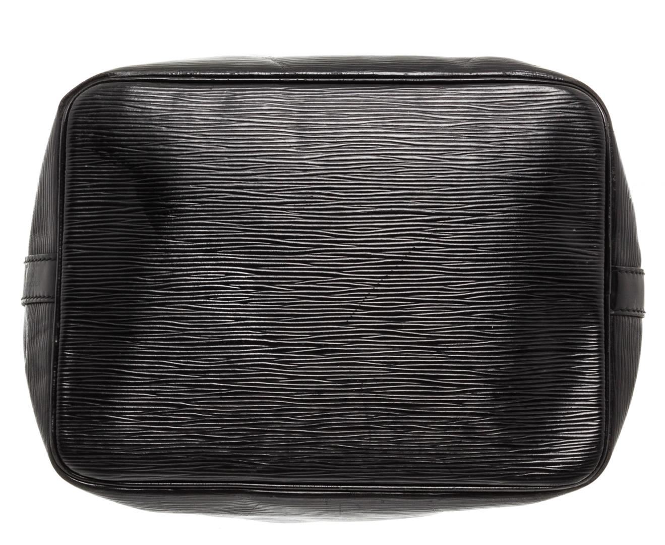 Black Epi leather Louis Vuitton Noe PM with brass hardware, adjustable flat shoulder strap, tonal Alcantara lining and drawstring closure at top. Authentic.