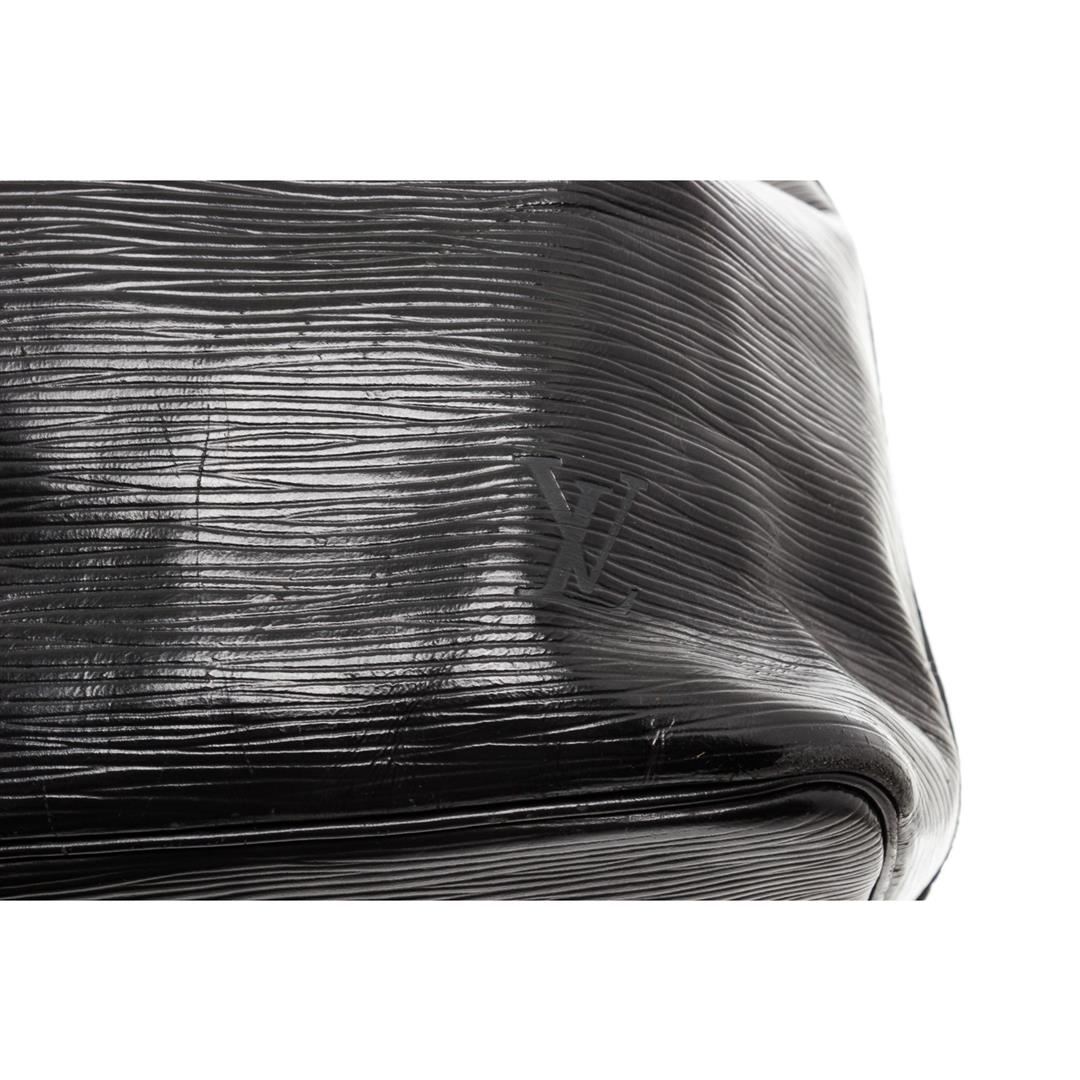 Black Epi leather Louis Vuitton Noe PM with brass hardware, adjustable flat shoulder strap, tonal Alcantara lining and drawstring closure at top. Authentic.