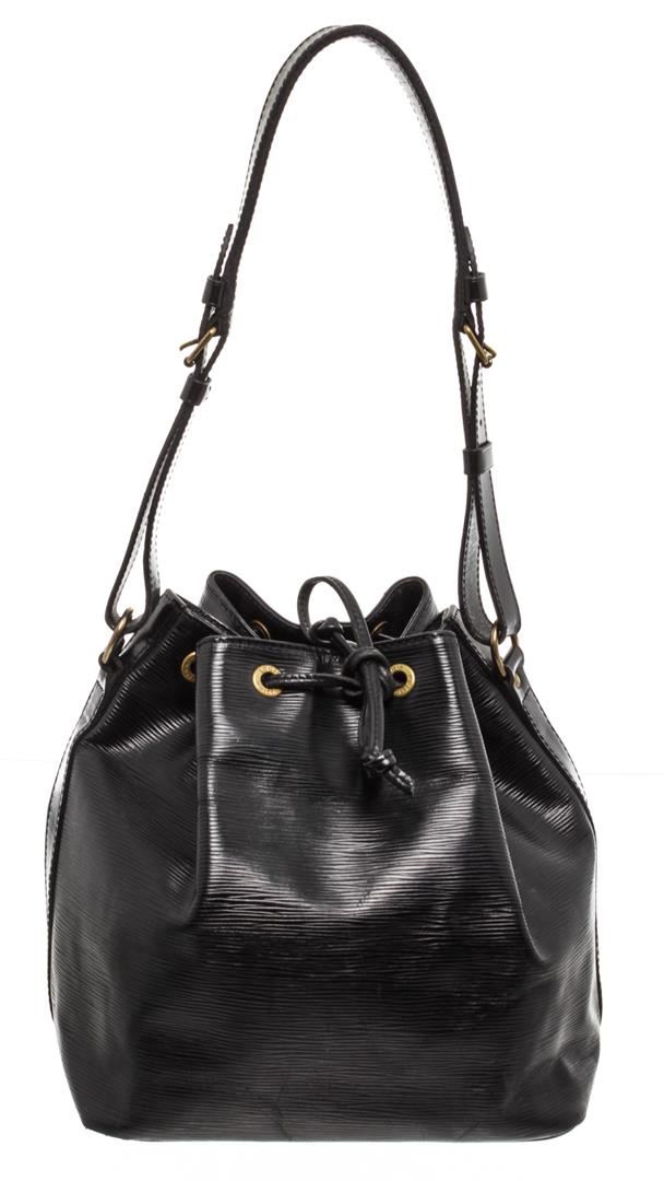 One Louis Vuitton Black Epi Leather Noe PM Drawstring Shoulder Bag. Black Epi leather Louis Vuitton Noe PM with brass hardware, adjustable flat shoulder strap, tonal Alcantara lining and drawstring closure at top. MKX