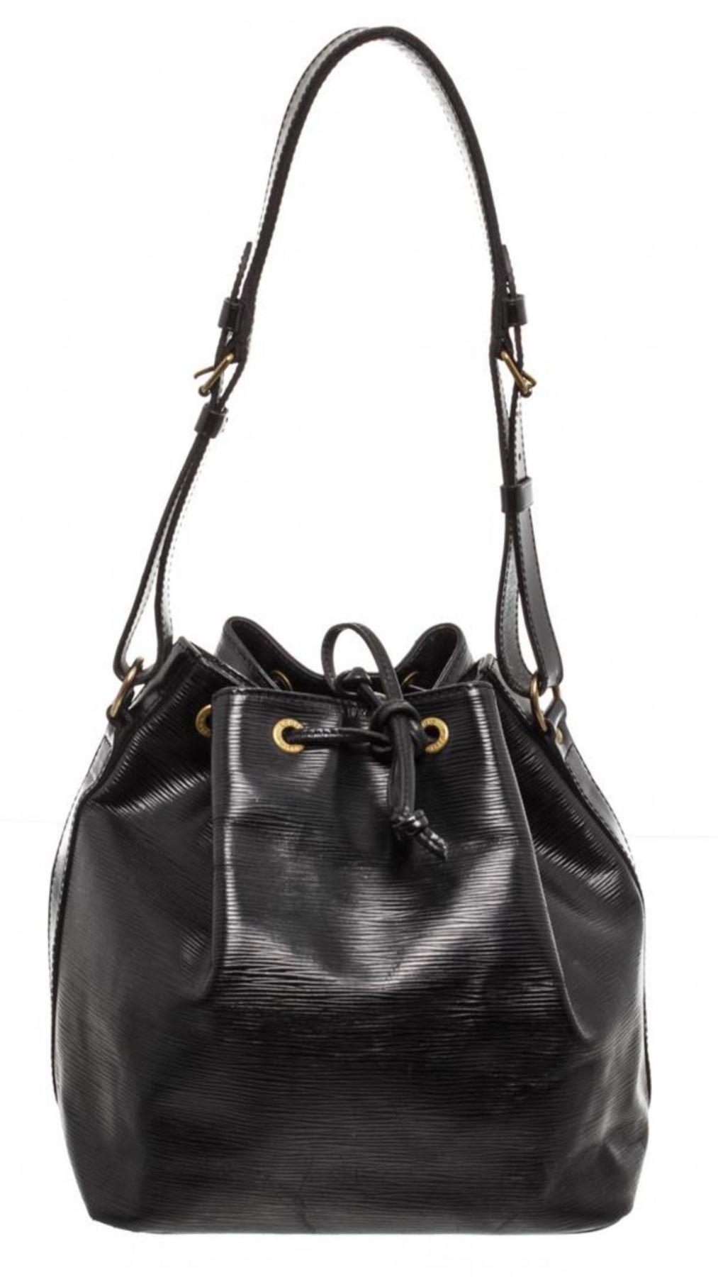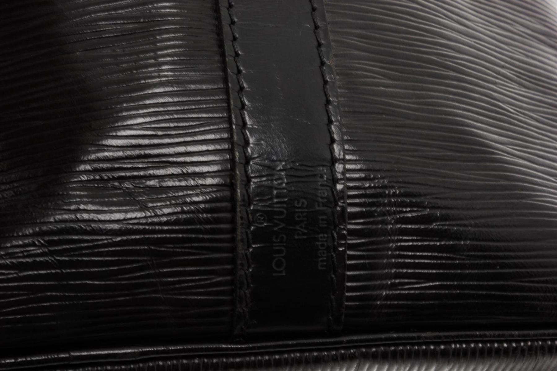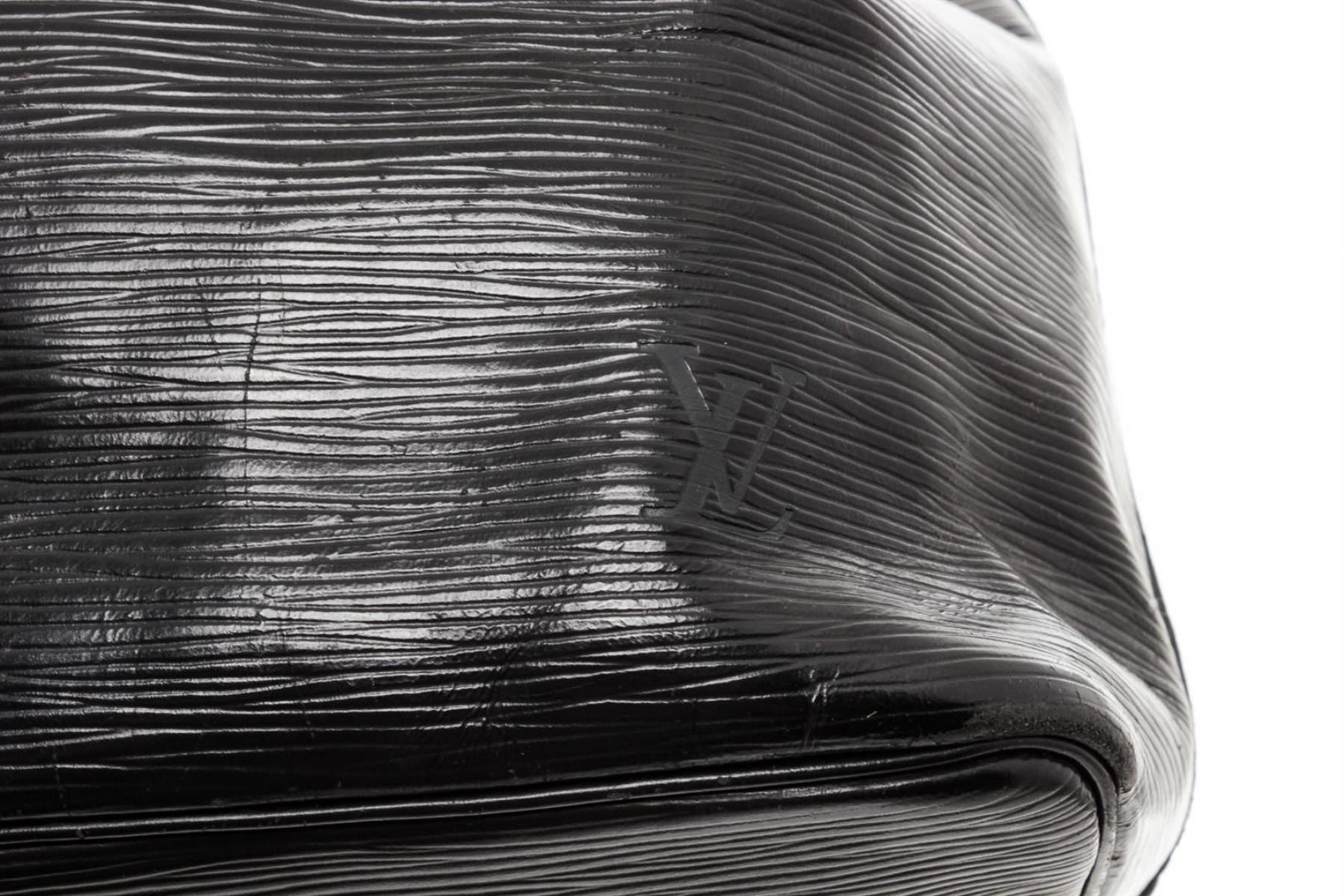 One Louis Vuitton Black Epi Leather Noe PM Drawstring Shoulder Bag. Black Epi leather Louis Vuitton Noe PM with brass hardware, adjustable flat shoulder strap, tonal Alcantara lining and drawstring closure at top. MKX