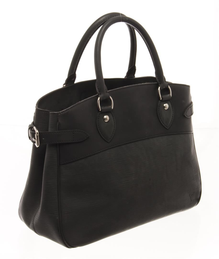 One Louis Vuitton Black Epi Leather Passy Handbag. Item is sold AS-IS. All available information is listed in the description and shown in the photo. louis vuitton black leather passy handbag with black epi leather, silver-tone hardware, rolled handles, canvas lining & three interior pockets, clasp closure at top. Height: 10.25", Width: 15", Depth: 5.5" / 26.03 x 38.1 x 13.97 cm