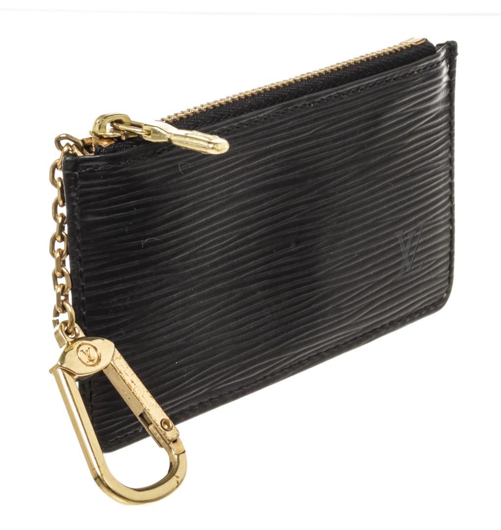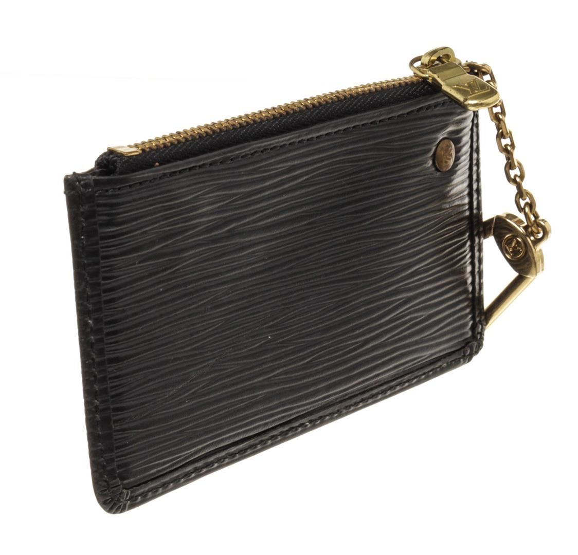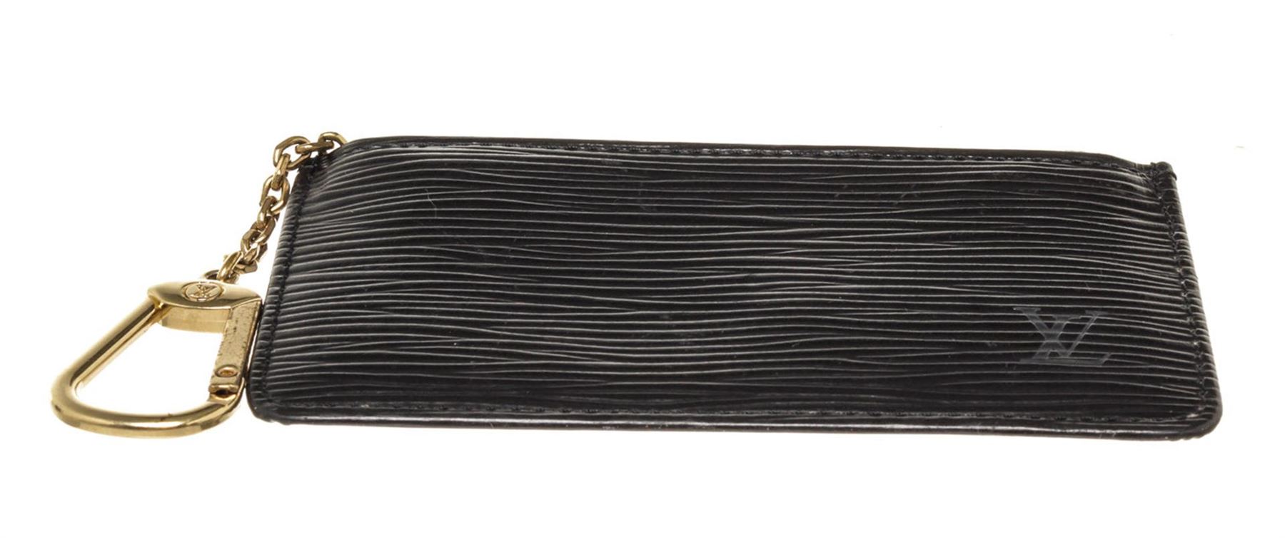 Louis Vuitton Black Epi Leather Pochette Cles Wallet with epi leather, gold-tone hardware, trim tan vachetta leather and zipper closure.