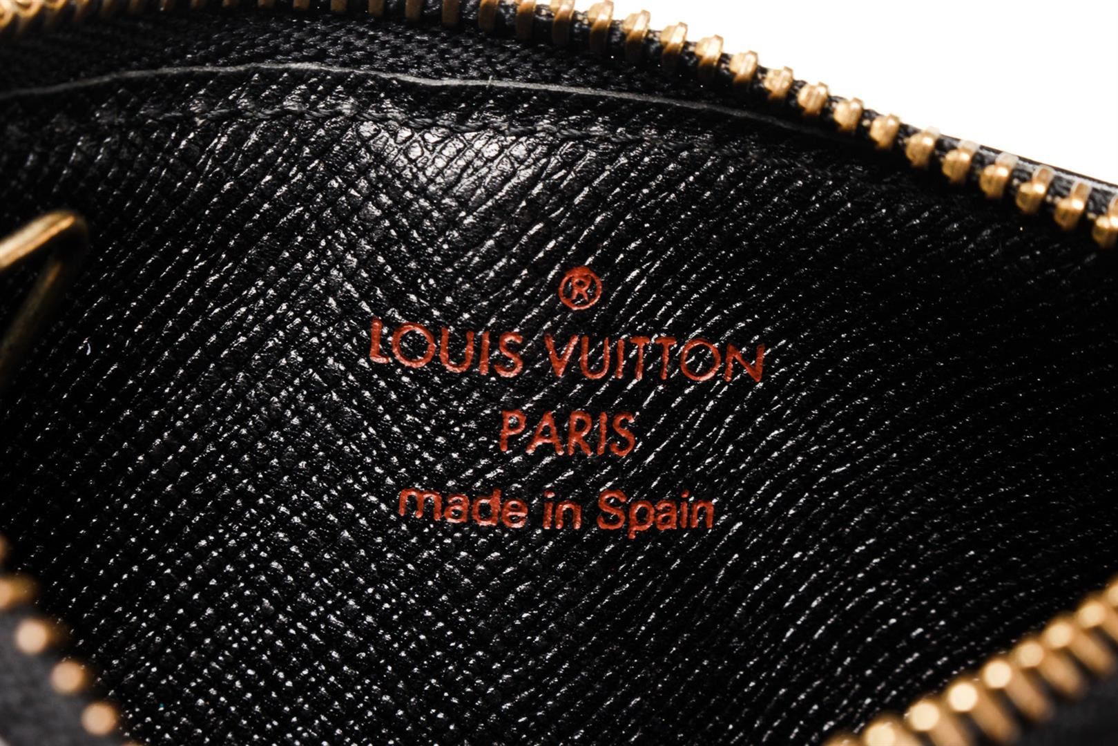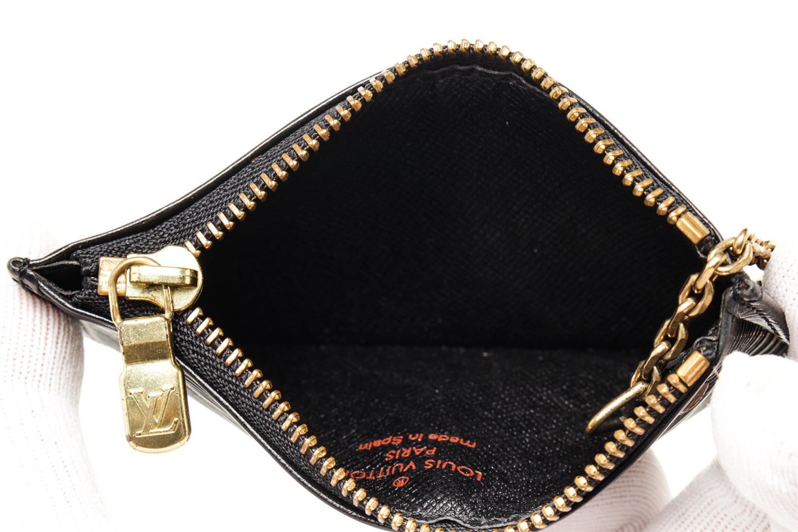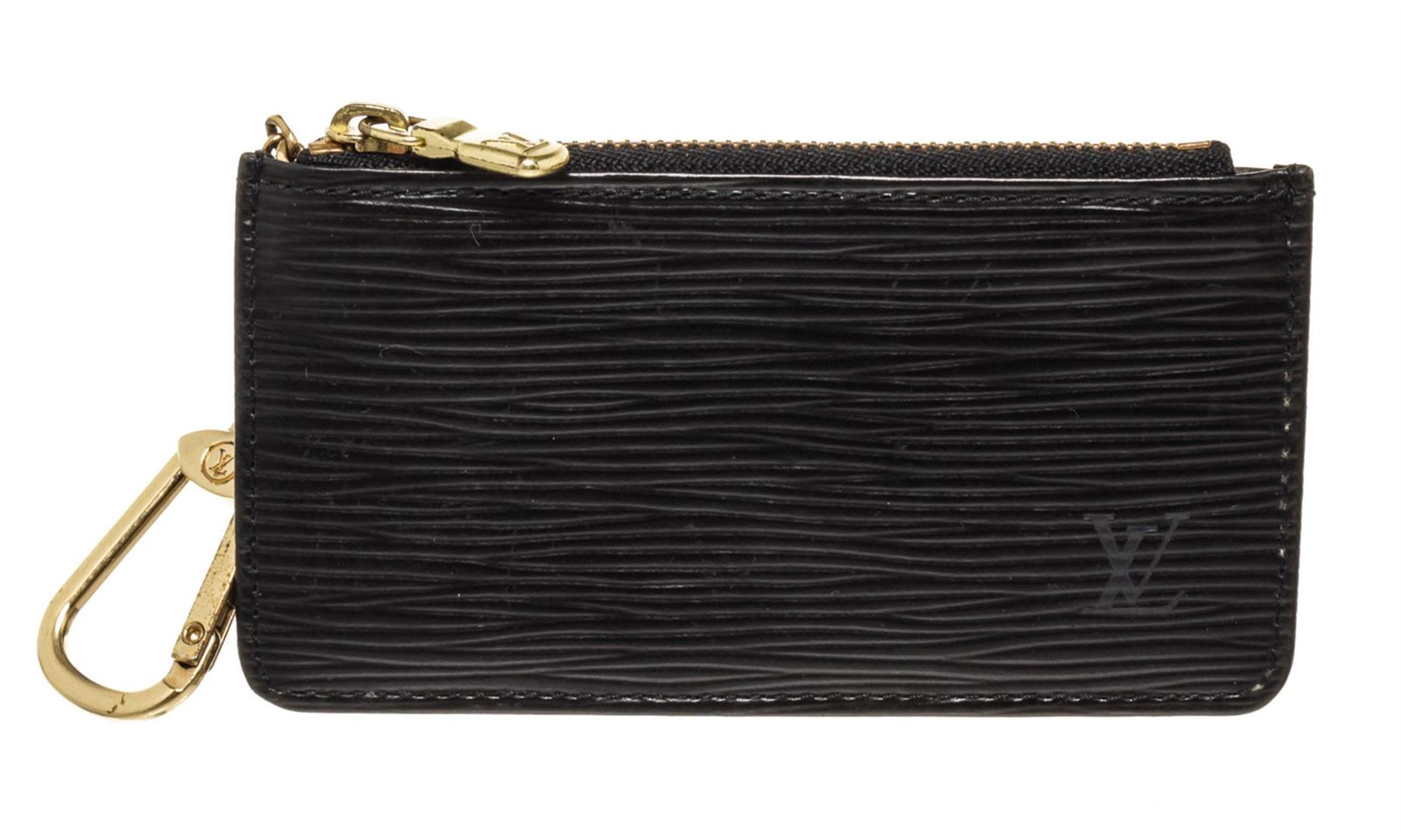 Louis Vuitton Black Epi Leather Pochette Cles Wallet with epi leather, gold-tone hardware, trim tan vachetta leather and zipper closure.