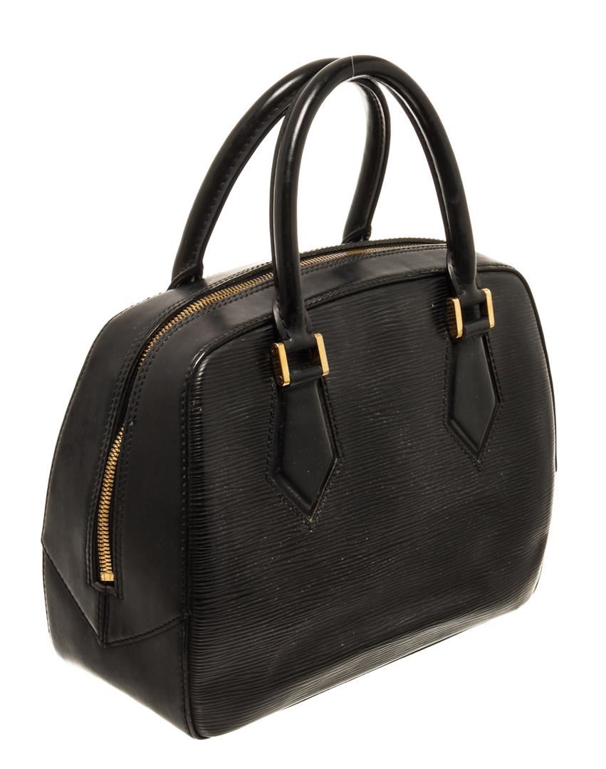 One Louis Vuitton Black Epi Leather Pont Neuf Satchel Bag. Item is sold AS-IS. All available information is listed in the description and shown in the photo. This sophisticated tote is finely crafted of Louis Vuitton signature textured black epi leather. The bag features thin and sturdy rolled leather top handles with squared brass links, and a wrap around zipper. This handbag opens to a alcantara microfiber interior with zipper and patch pockets.