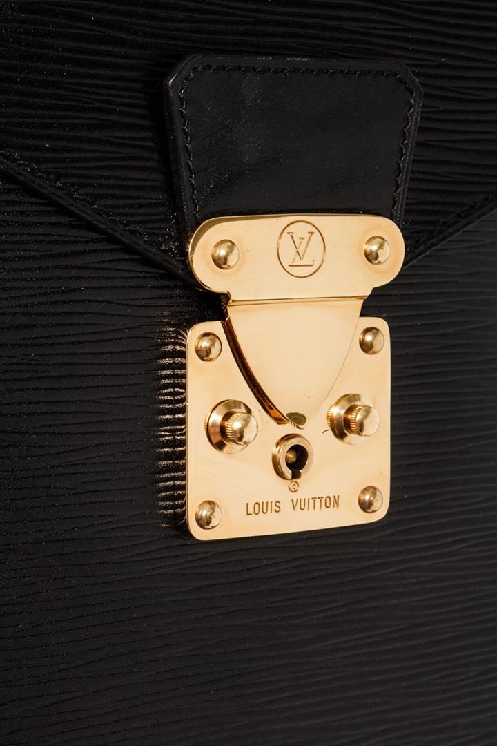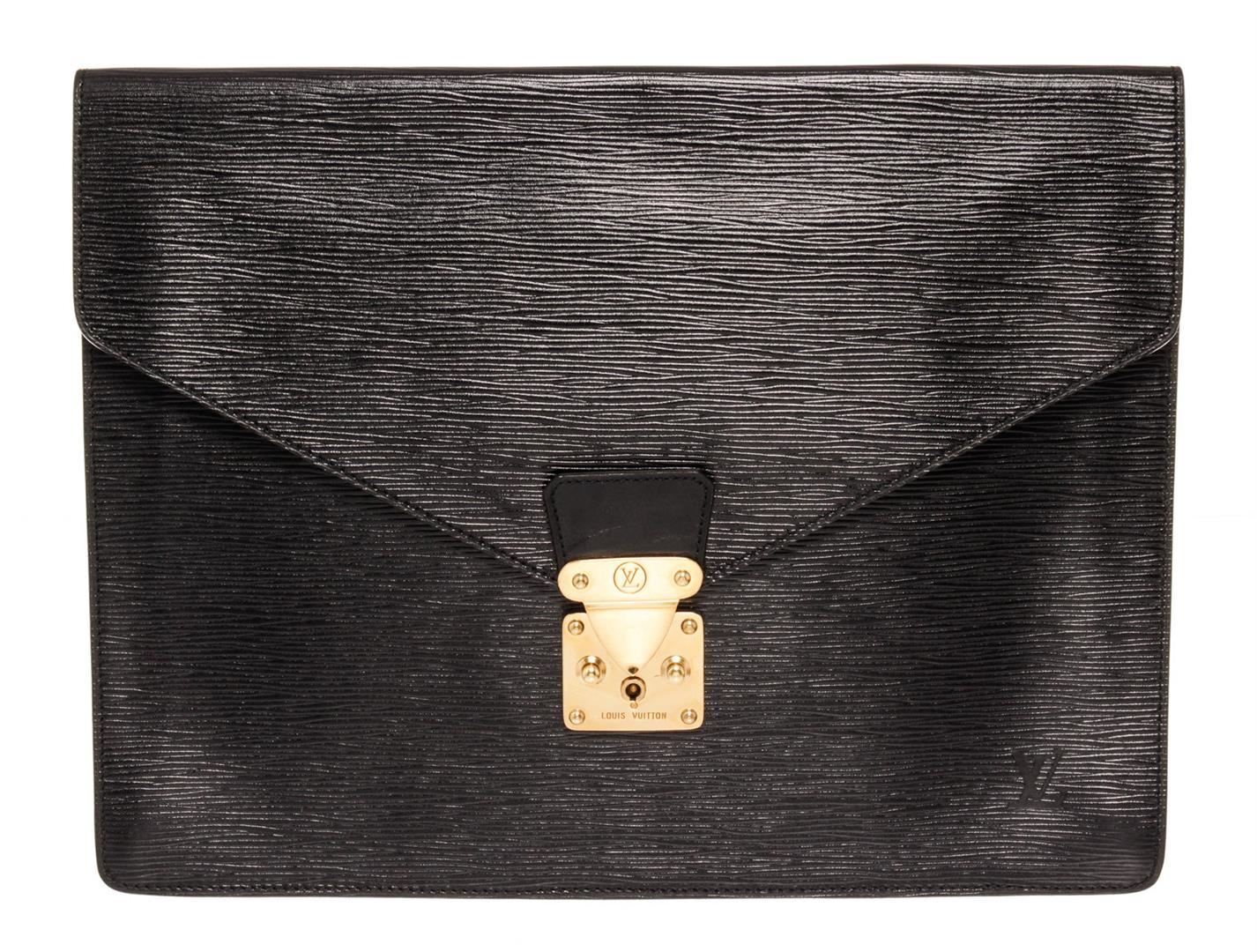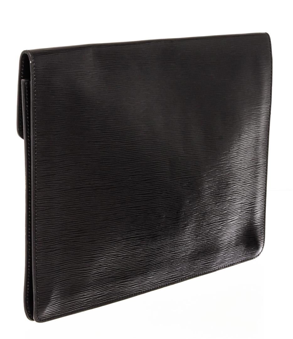 Louis Vuitton Black Epi Leather Porte Document Briefcases with epi leather gold-tone hardware, trim tan vachetta leather, interior slip pocket and push lock closure.