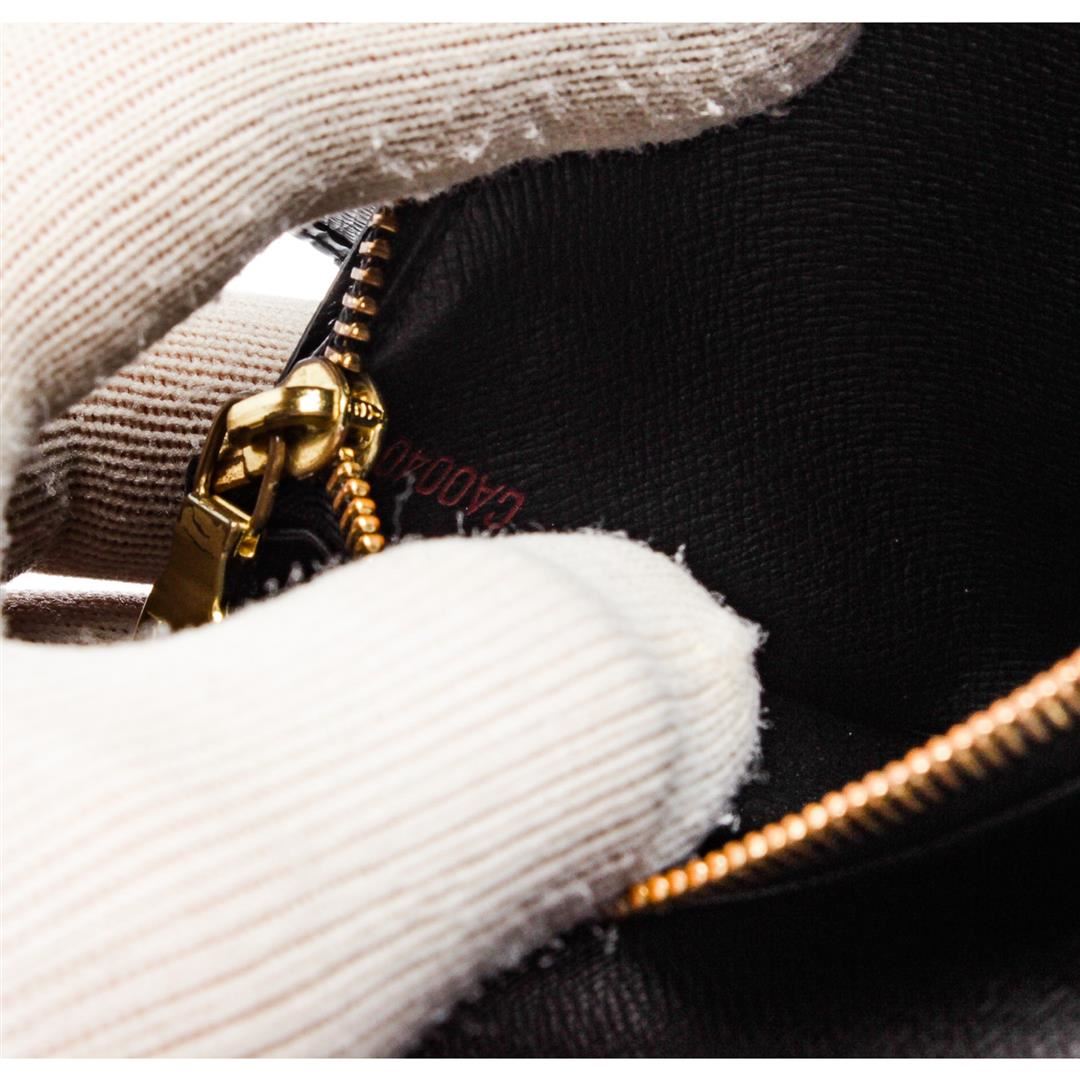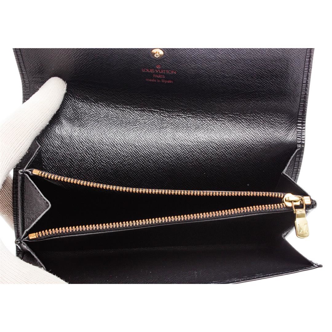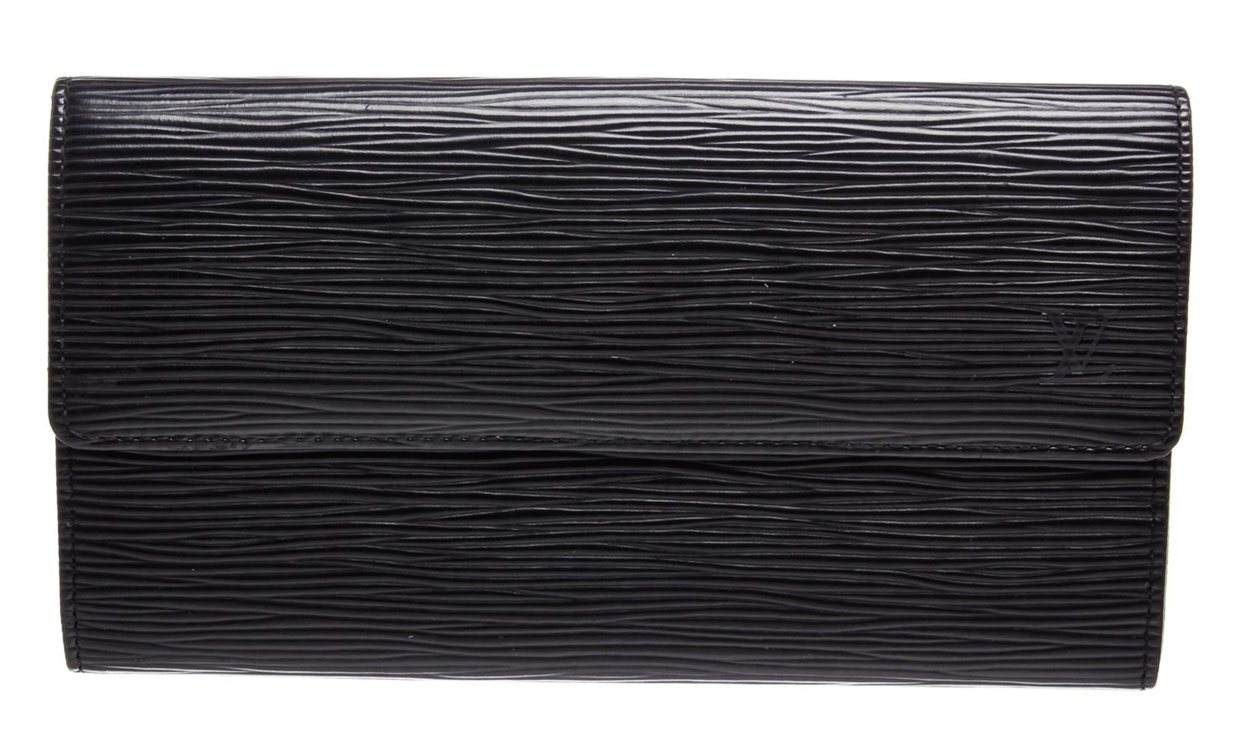 Louis Vuitton black Epi leather Porte Monnaie Long Wallet with gold-tone hardware, three interior compartments; center with zip top, and two card slots on front under flap closure with snap.