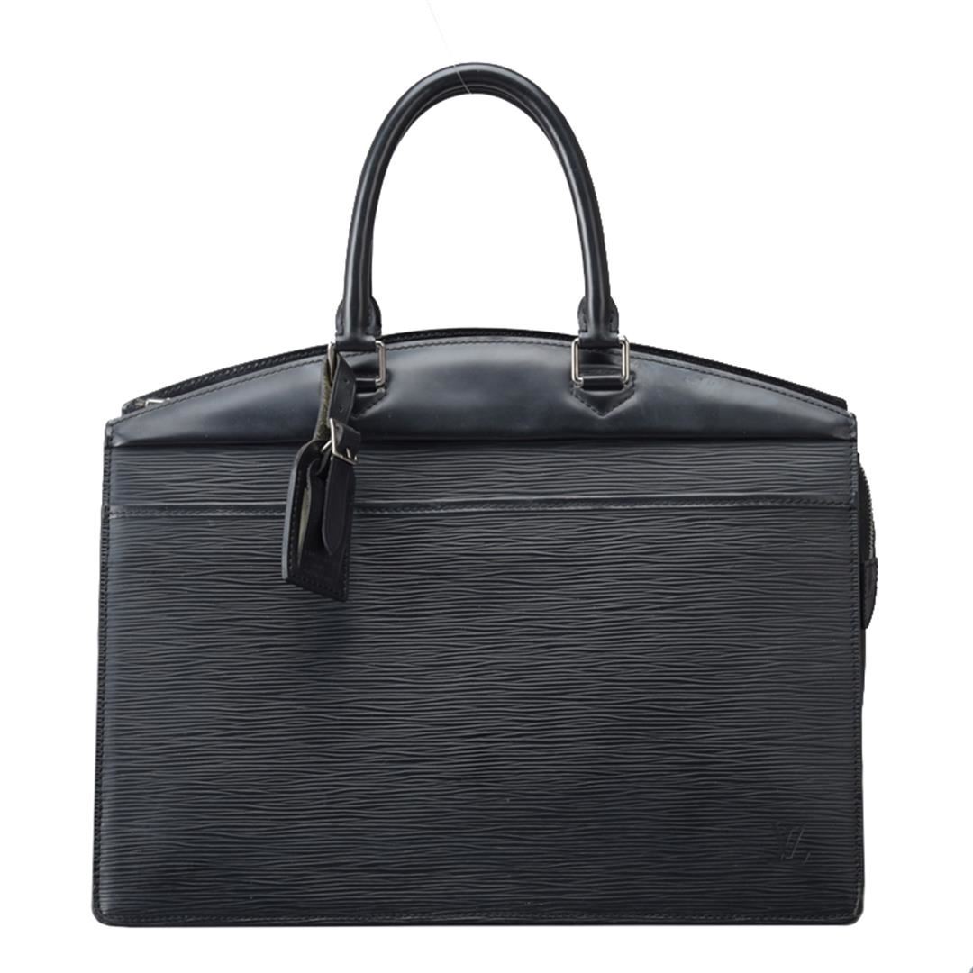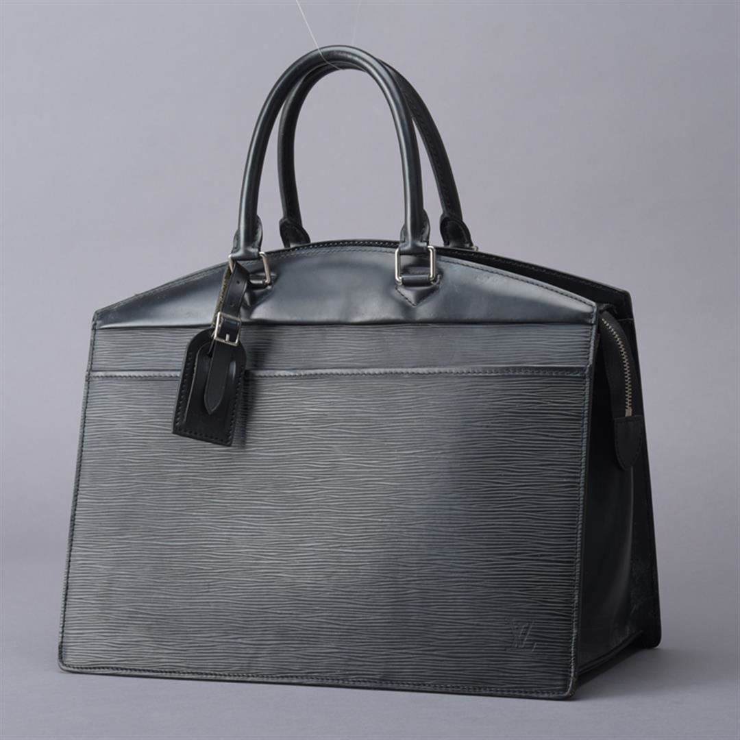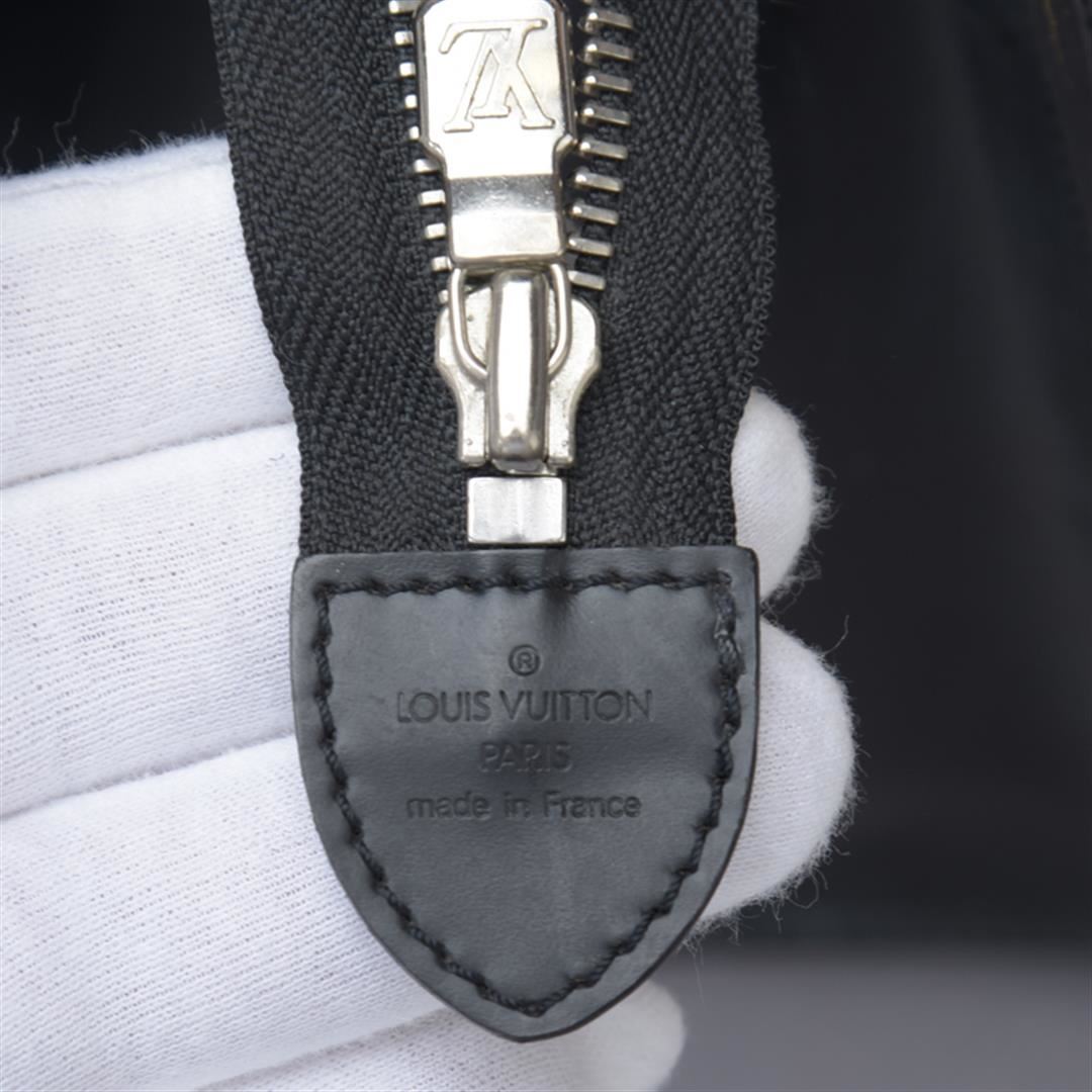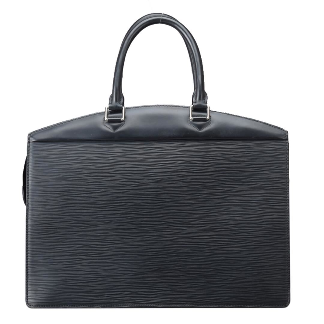 Black Epi leather Louis Vuitton Riviera Bag with silver-tone hardware, single pocket at front exterior, dual rolled top handles, charcoal grey coated canvas lining, four pockets at interior walls, elastic holders at interior and zip closure at top. 14"
