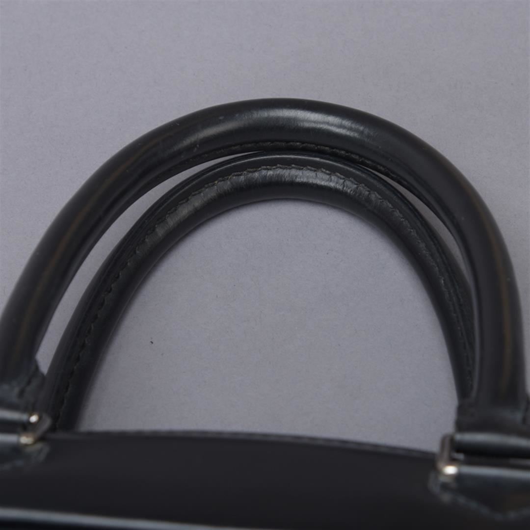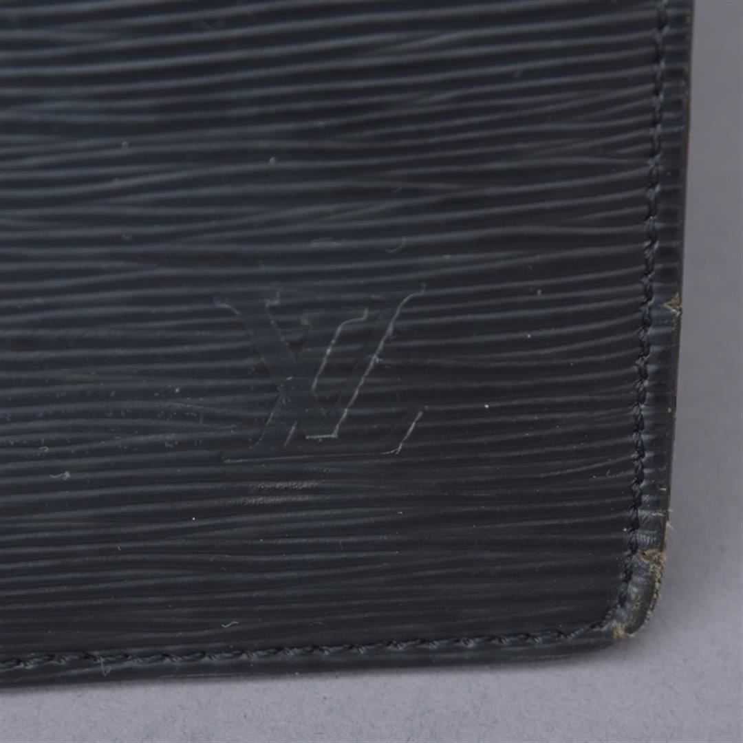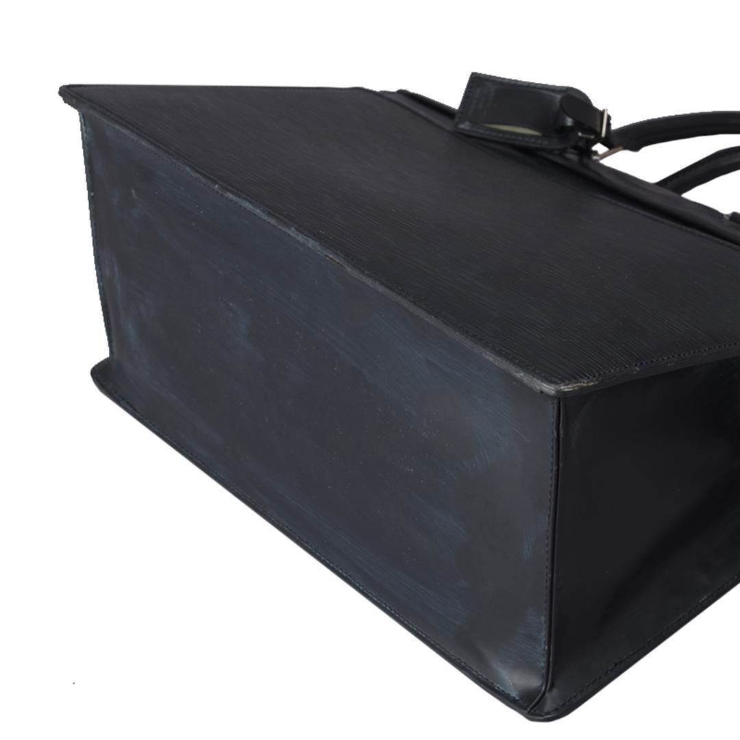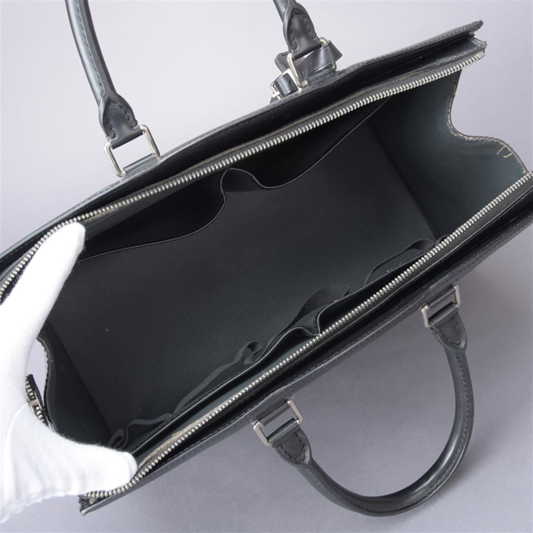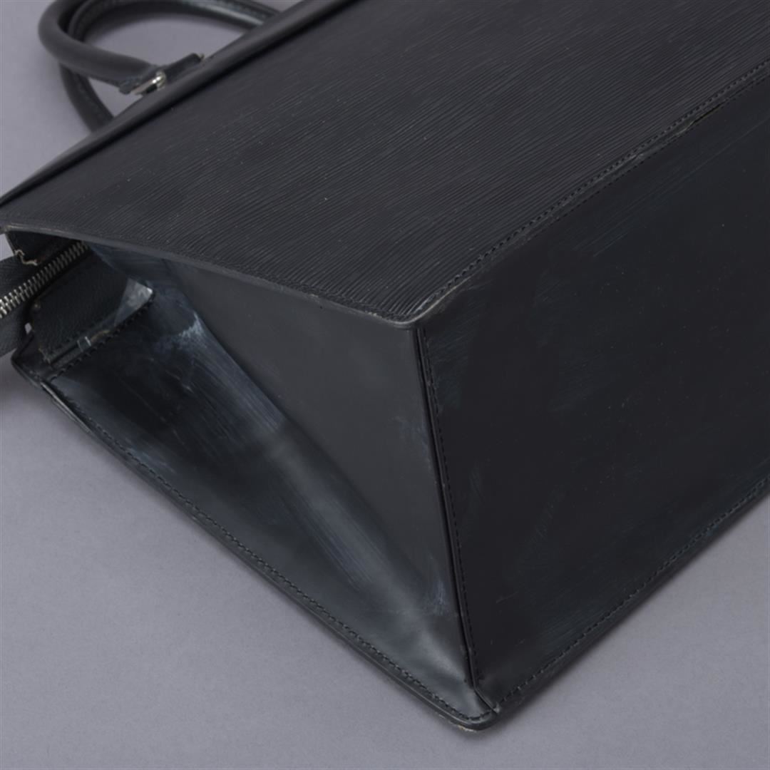 Black Epi leather Louis Vuitton Riviera Bag with silver-tone hardware, single pocket at front exterior, dual rolled top handles, charcoal grey coated canvas lining, four pockets at interior walls, elastic holders at interior and zip closure at top. 14"
