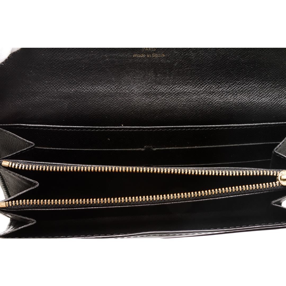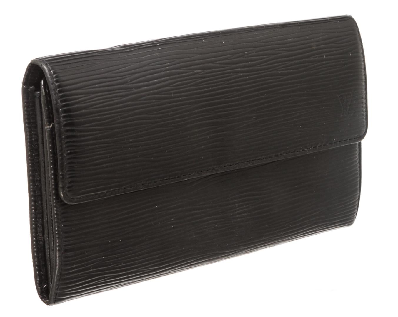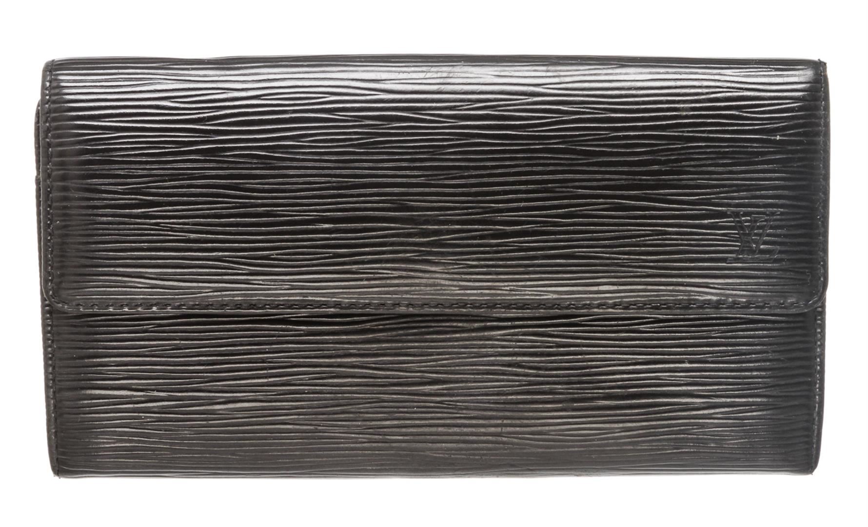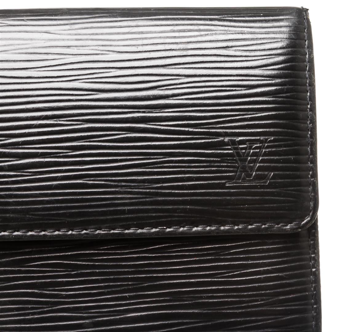 Black Epi leather Louis Vuitton Sarah wallet with silver-tone hardware, dual card slots under front flap, tonal cross grain leather lining, three interior compartments; one with zip closure, single bill slot, four card slots and snap closure at front.