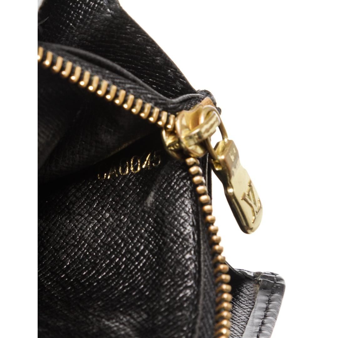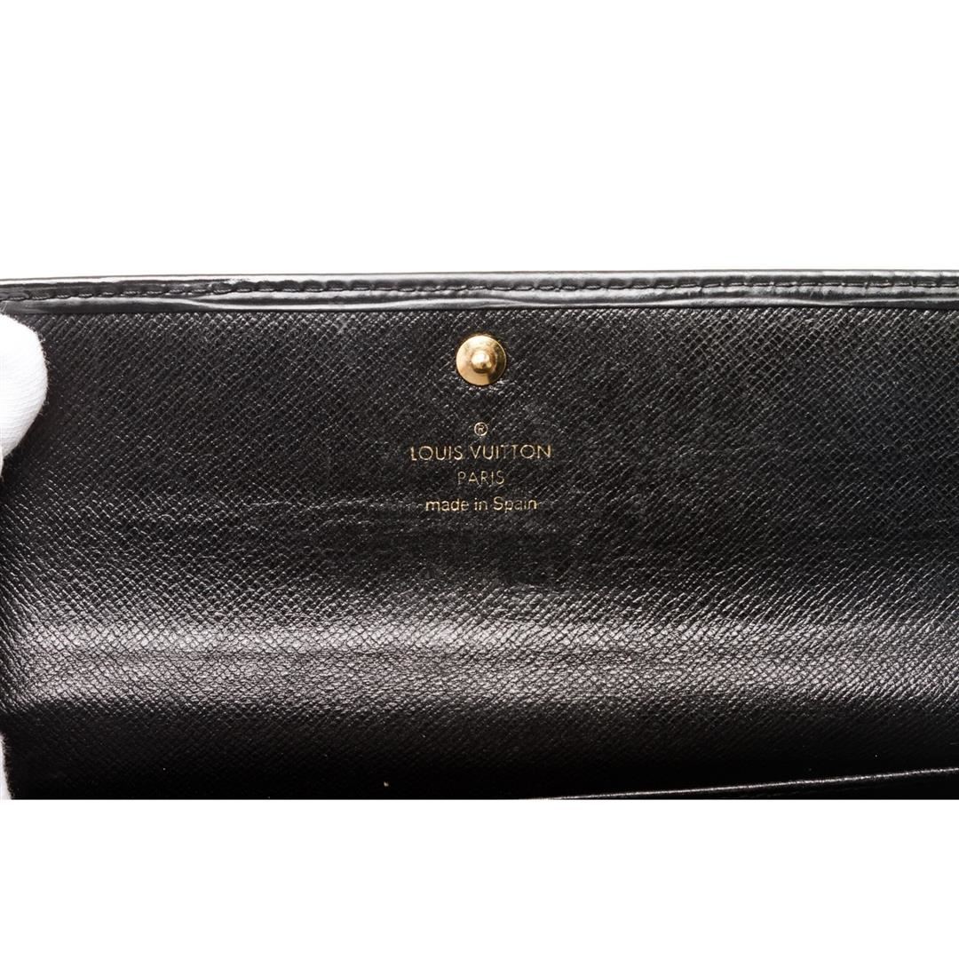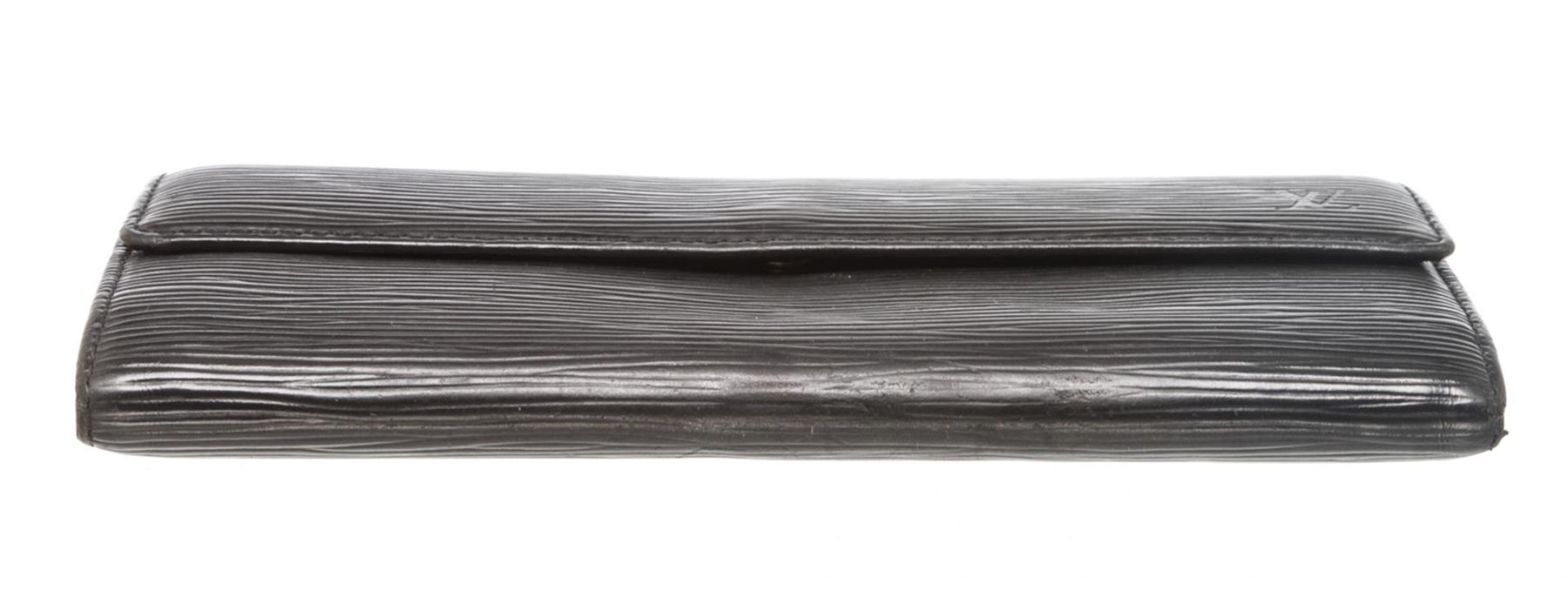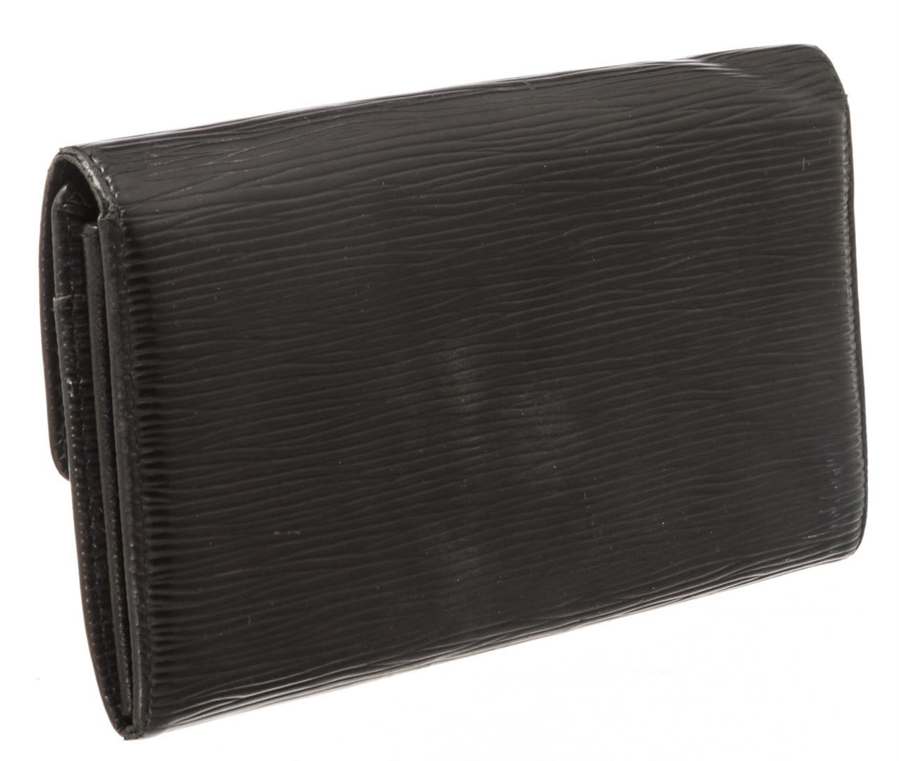 Black Epi leather Louis Vuitton Sarah wallet with silver-tone hardware, dual card slots under front flap, tonal cross grain leather lining, three interior compartments; one with zip closure, single bill slot, four card slots and snap closure at front.