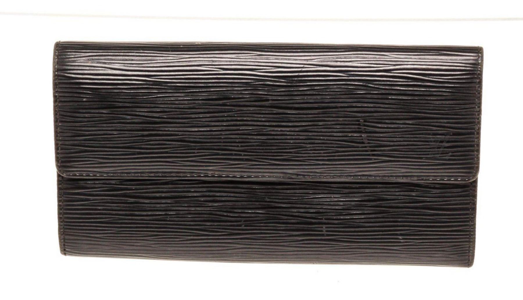 Louis Vuitton Black Epi Leather Sarah Wallet with epi leather, gold-tone hardware, three interior compartments pockets, trim tan vachetta leather, snap closure.