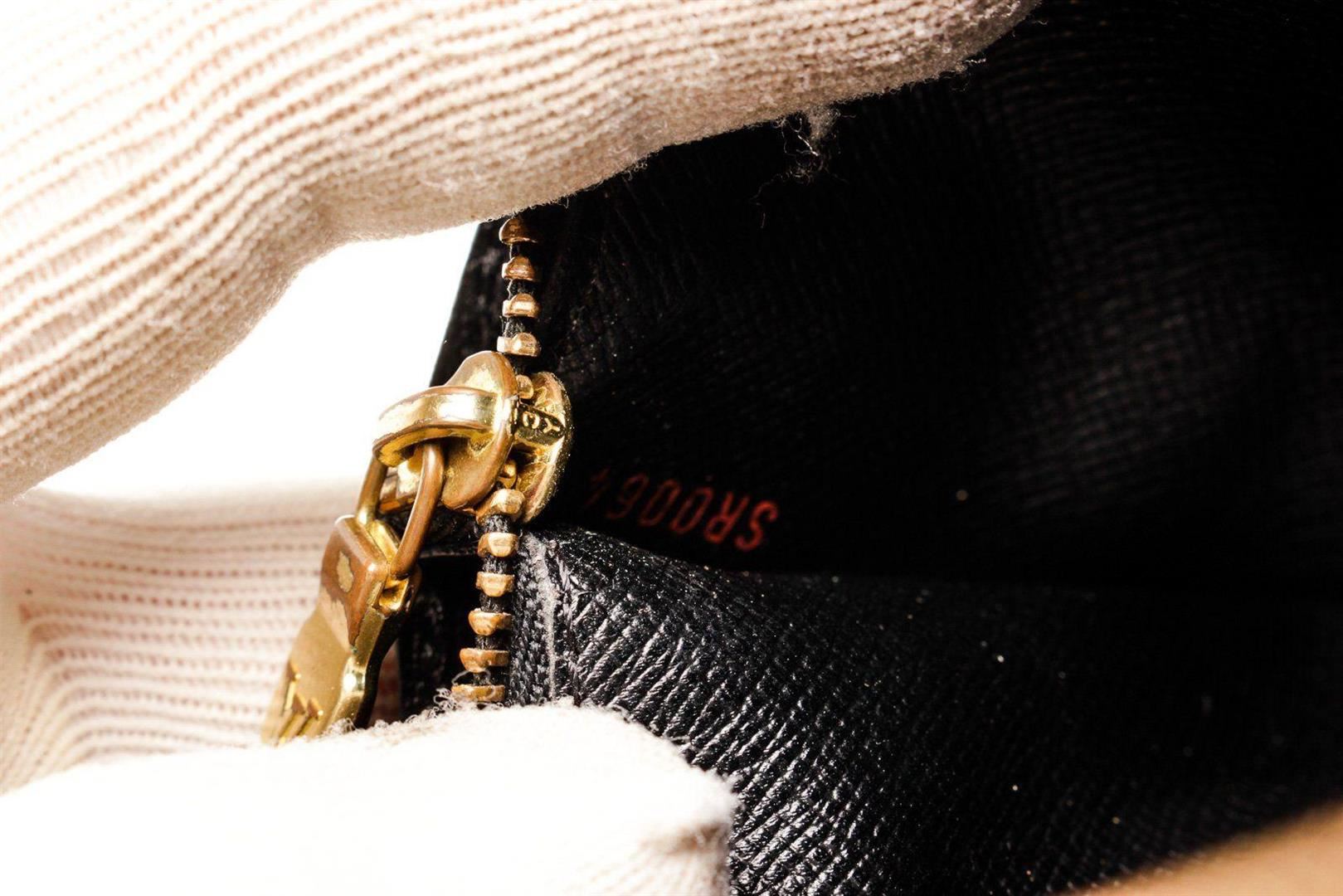Louis Vuitton Black Epi Leather Sarah Wallet with epi leather, gold-tone hardware, three interior compartments pockets, trim tan vachetta leather, snap closure.