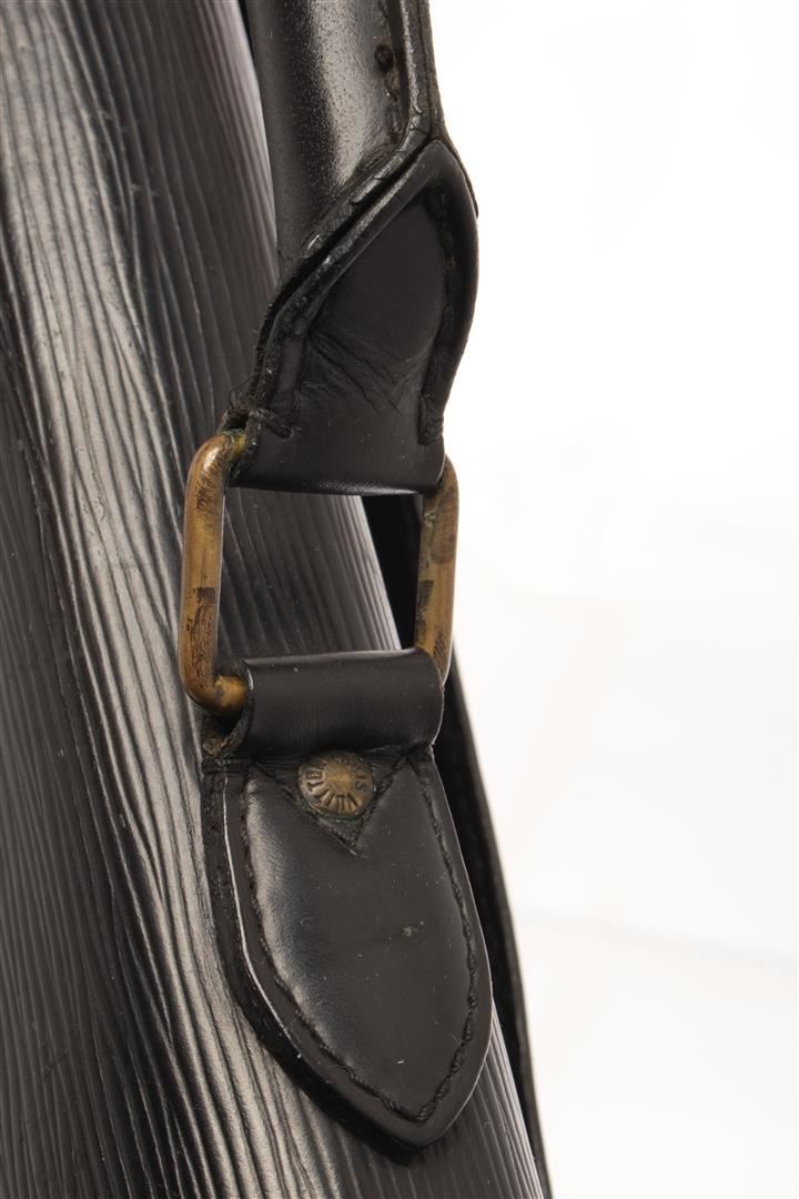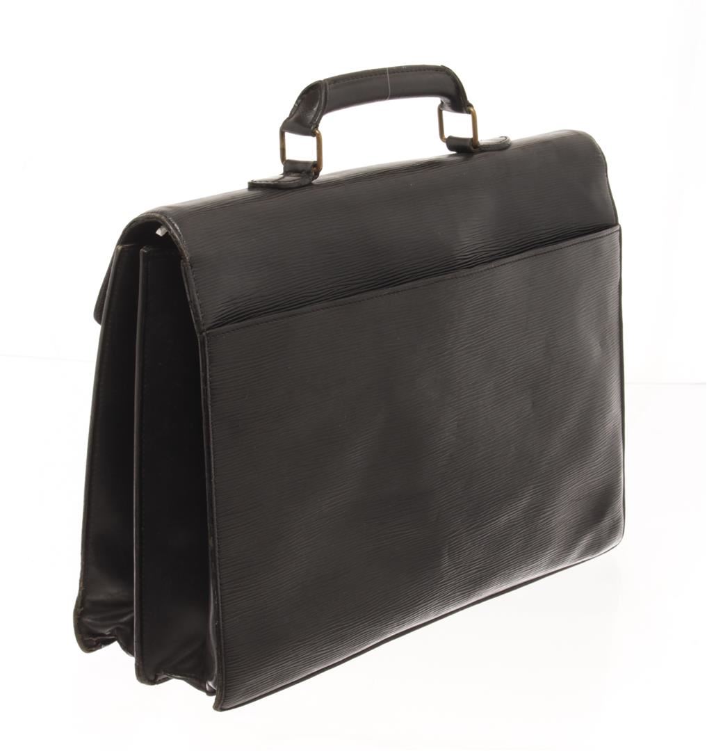 One Louis Vuitton Black Epi Leather Serviette Ambassador Briefcase. Item is sold AS-IS. All available information is listed in the description and shown in the photo. louis vuitton black epi leather serviette ambassador briefcase with gold-tone hardware, accordion details at sides, an internal zipped pocket and multiple interior compartments, top with flip-lock closure, a textured leather detail, a top handle. Width 16.1 in, Height 11.8 in, Depth 2.4 in/ Width 41 cm, Height 30 cm, Depth 6 cm